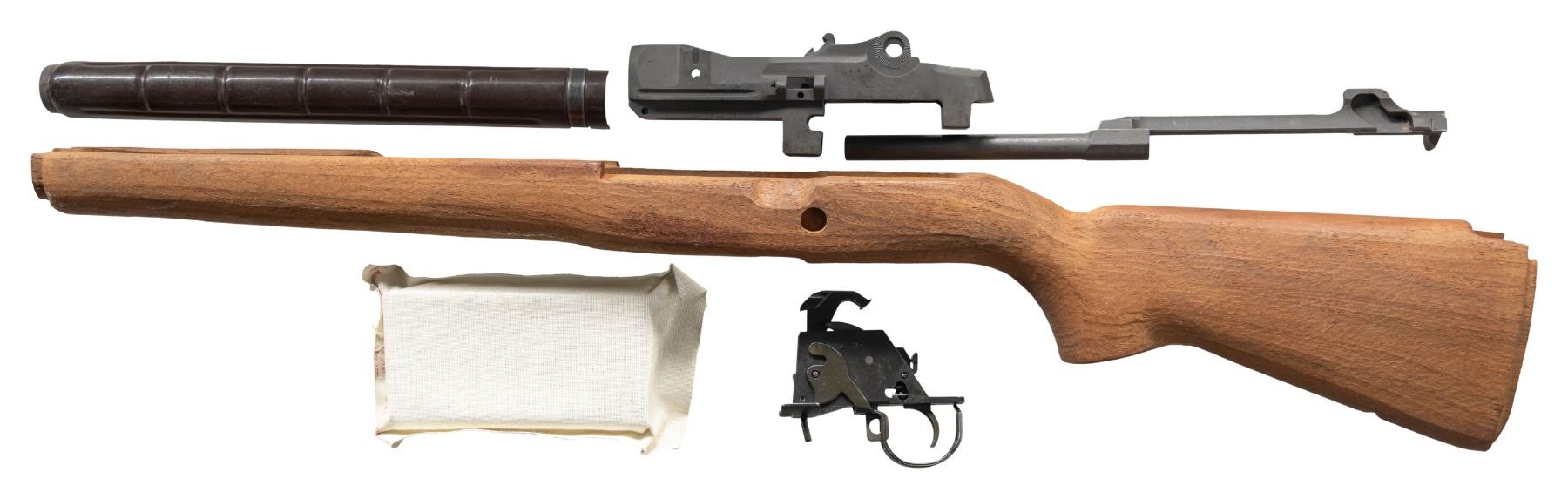 STOCK, & PARTS. Cal. 7.62mm. S# 002180. An unassembled Smith Enterprises M-21 receiver. Gray parkerized finish. Lettering has been filled in white for ease of reading. Unfinished, hardwood shoulder stock. Brown plastic heat shield. TRW trigger group. Op-rod. MAGS: 1 original 20 rd, still in cloth wrap, dated 10/71. CONDITION: unassembled. Some parts may be as new, while others may have been removed from prior rifles. (25-3043/JZ). MODERN. $600-$900.