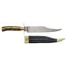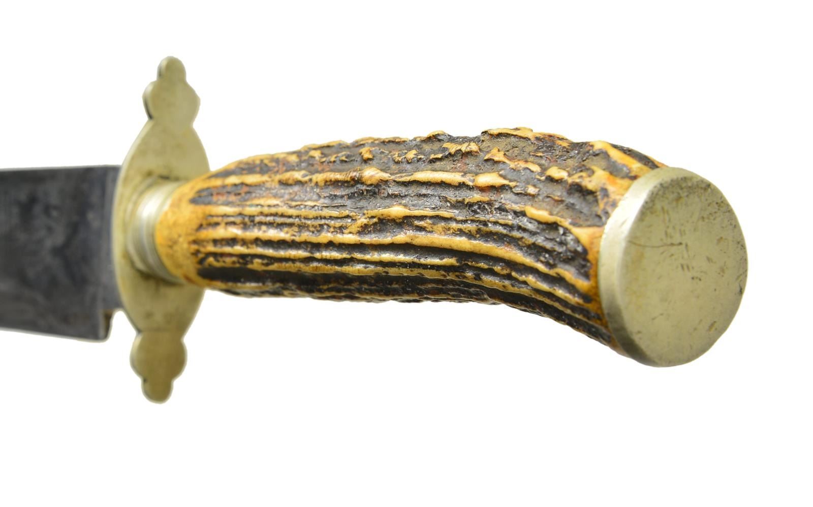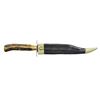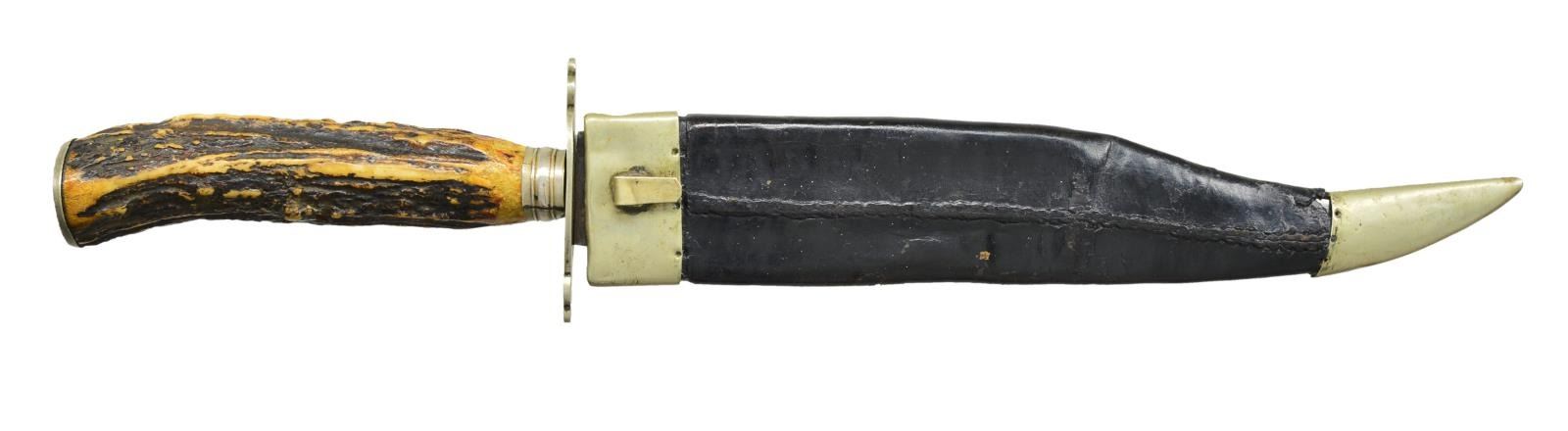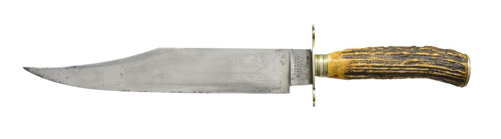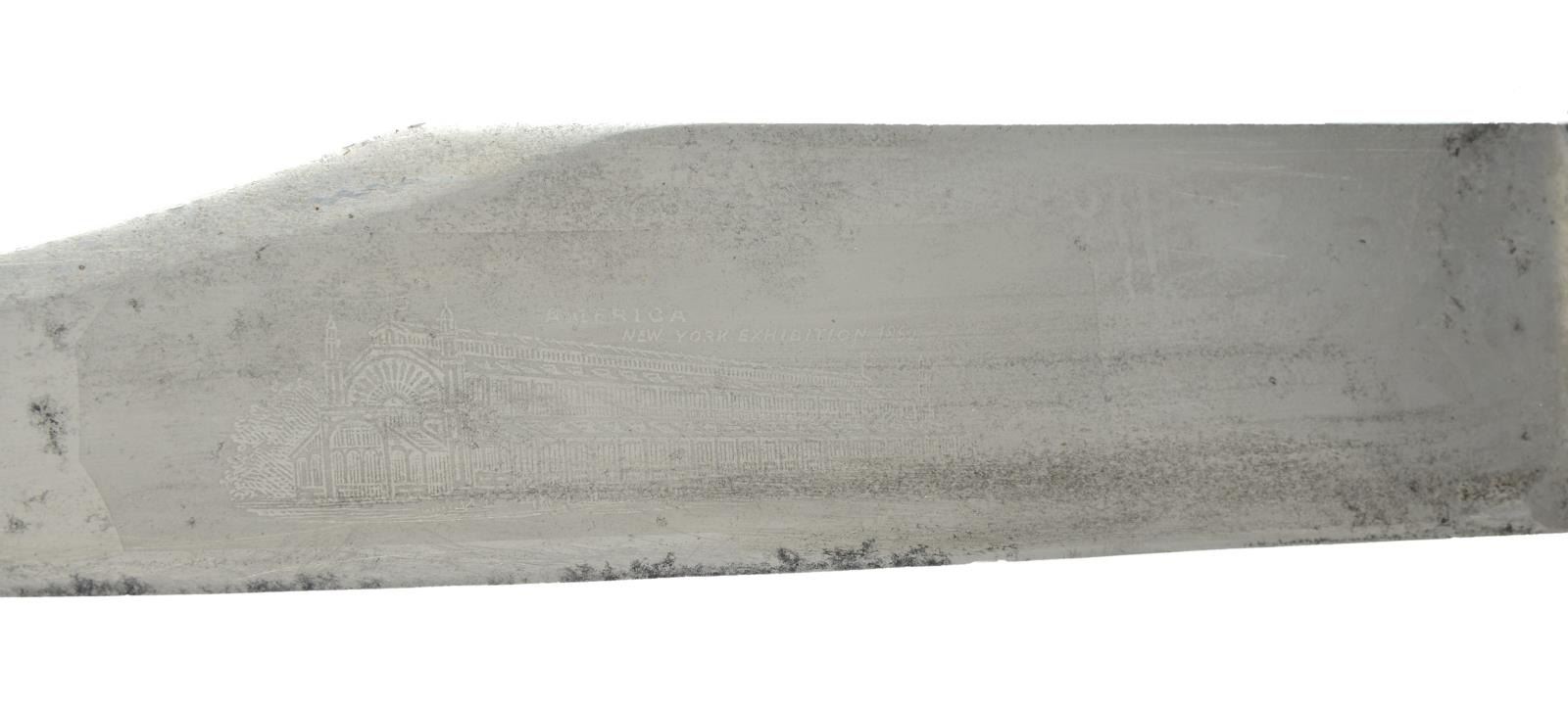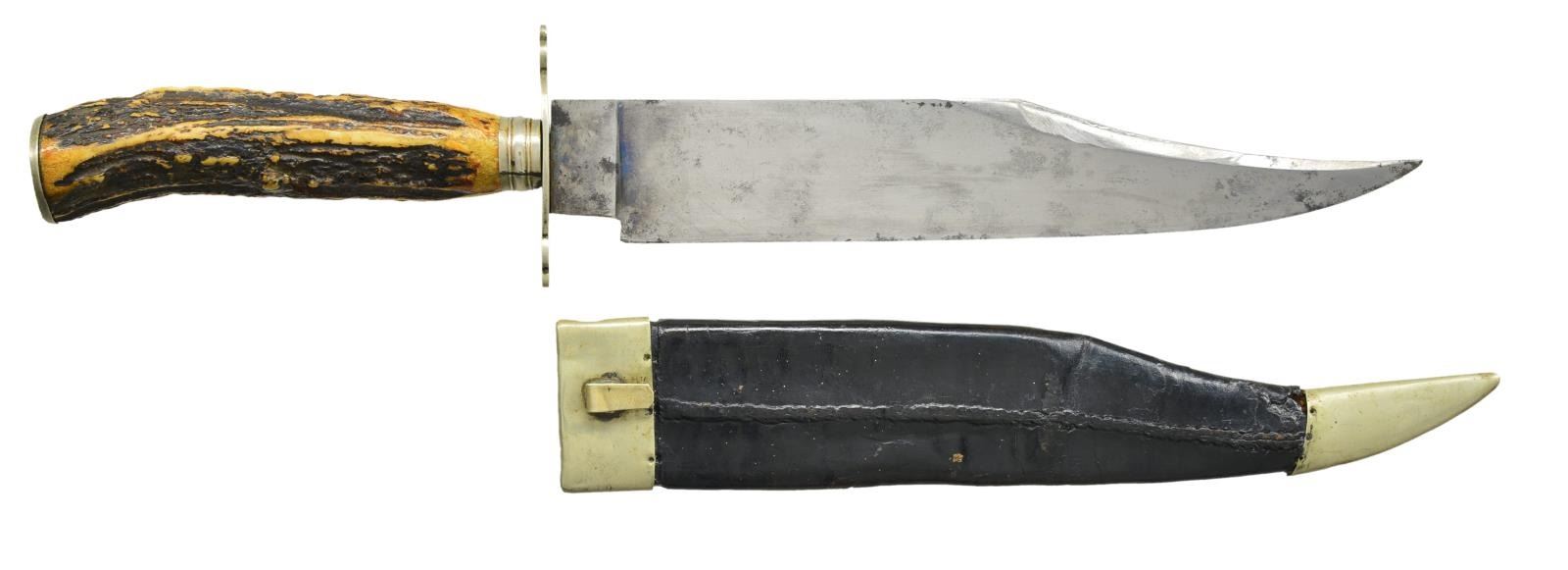 SHEFFIELD BOWIE KNIFE. 14.5” overall, 9.5” clip point blade etched with rendition of the Crystal Palace Exhibition Hall and above: AMERICA / NEW YORK EXHIBITION 1852”. Extra long 5” delicate tapered clip, stamped on ricasso “SUPBURB / W SHIPMAN / SHEFFIELD”. Leather sheath with German silver mounts, short belt hook attached to throat, stag grip with German silver pommel. this knife as pictured on page 416 of Norm Flayderman’s “THE BOWIE KNIFE”. CONDITION: very good overall, blade decoration was lightly etched, but all discernible, leather scabbard body, creased and redyed black. PROVENANCE: From the Lifelong Collection of Glen E. Mattox. (02-18523/JS). $2,000-3,000.