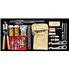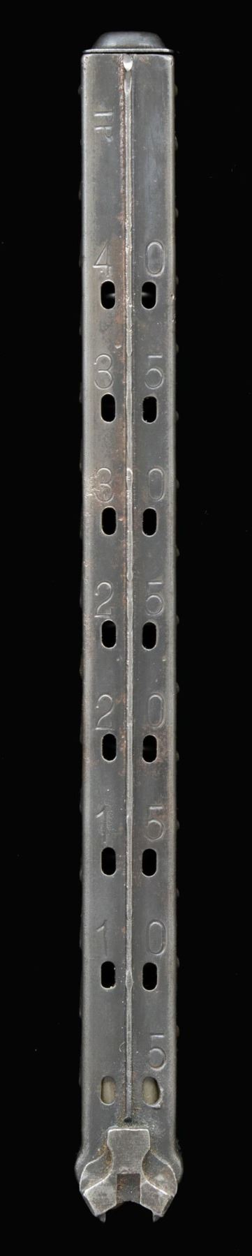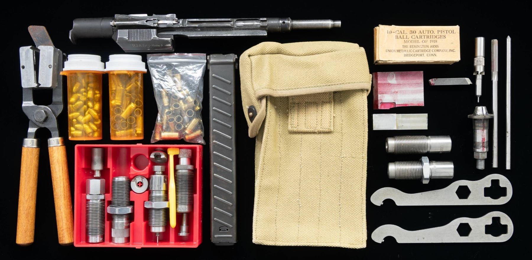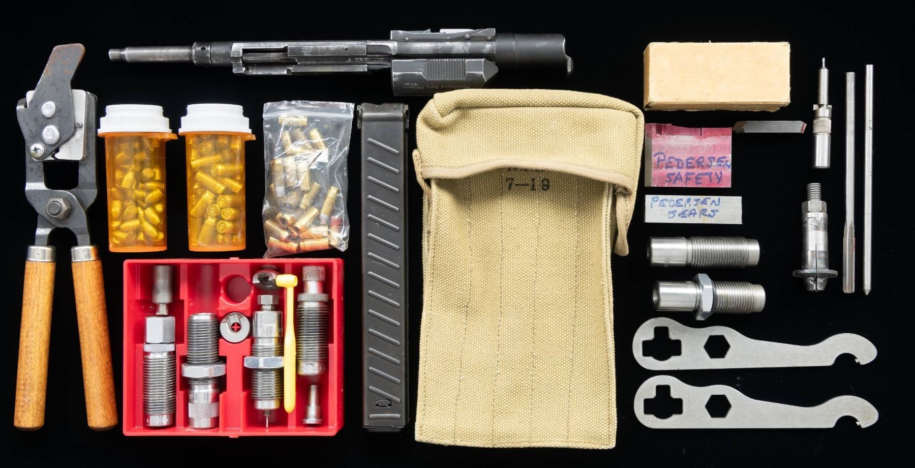 AN ACCOMPANYING SPRINGFIELD MODEL 1903 MK1 BOLT ACTION MILITARY RIFLE. No.1: S# 39201. Cal. 30 Pedersen. Extremely rare WWI Pedersen Device with an accompanying Model 1903 MK1 Springfield Rifle. The Pedersen Device was developed to increase the short range firepower available from the standard Model 1903 rifle. The nature of trench warfare may require a high degree of firepower at short ranges and the Pedersen Device was developed to meet that need. The Pedersen Device was carried by the soldier in a container on his belt. This allowed him to quickly switch a standard service rifle between long-range bolt-action fire and shorter range semi-automatic fire. The device utilizes a 40 round detachable magazine. The device which functions on the blowback principle, utilizes a 30 caliber rimless pistol type cartridge. The devices and their specially modified Mark 1 rifles started production in 1918. The war ended before they could be fielded with approximately 65,000 produced and approximately 101,000 rifles produced to accommodate them. The rifles were used as service rifles and at times of overhaul or rebuild, the Pedersen Device related parts consisting of the special Sear, magazine cutoff and spindle were replaced with standard parts. The devices themselves were placed in storage until declared surplus in the early 1930s, and destroyed with only a small number being saved and it is thought that fewer than 100 now survive. This Pedersen Device is marked on top of the reciprocating slide "U.S.A. 1918-MARK 1 39201 REMINGTON-BRIDGEPORT / PEDERSEN'S PAT'S PENDING". This device with its accompanying 40 shot magazine, has some of its small parts replaced, but appears serviceable and complete. Accompanying the device is a box of 40 original cartridges. The plain brown box is labeled "40-CAL 30 AUTO. PISTOL-BALL CARTRIDGES MODEL 1918 THE REMINGTON ARMS / UNION METALLIC CARTRIDGE COMPANY, INC. / BRIDGEPORT, CONN". 39 cartridges remain in the box. Included also is an original khaki canvas belt carrier which has a capacity of five magazines. Carrier is marked on front "R.I.A. 7-19". There are two reproduction Pedersen combination tools. UNATTACHED ACCESSORIES: there are a number of empty Pedersen brass cases formed from U.S. M1 Carbine brass. There is a Lee 30 Pedersen two cavity bullet mold and reloading dies, two shell holders, bullet sizing dies, cartridge case reamers and dummy cartridges. Group includes a blue plastic padded carrying case. CONDITION: the Pedersen Device retains approximately 60% of its original dark parkerized finish and shows light to moderate wear. (25-3518/RW). No.2: S# 1151989. Cal. 30-06. The Rifle is marked on the receiver ring "U.S. / SPRINGFIELD / ARMORY / MODEL 1903 / MARK 1". The left rail is slotted to act as an ejection port. The correct magazine cutoff, spindle and Mk1 sear are present in the rifle. Rifle was produced in 1919 and has a replacement barrel marked behind front sight "HS / flaming bomb / 10 44". Ladder rear sight with volley notch graduated to 2,850 yards. Sight is mounted on a late type Remington base without lightening cuts. Blade front sight. Sight cover is marked "R / flaming bomb / U.S.". Bolt with straight down handle is marked only with "C" under safety lug & has the punch proof under handle. Bolt shroud and safety are marked "R". Early walnut "S" type straight grip stock w/ single reinforcing bolt marked only with encircled "P" proof under grip. The stock has been modified on the left side for ejection port clearance, by hobbyist gunsmith. Stamped fine checkered trap buttplate. All additional furniture is milled. CONDITION: magazine has a large percentage of its original finish with thinning and light wear. The rifle stock has a very good appearing original finish with light wear and scattered handling marks. The metal retains 80% of its arsenal rework parkerized finish with light wear. The rear sight base is a notably lighter shade of parkerizing. Very good shiny bore w/ sharp lands. Cartridge box has wear and scuffing with small tears. Cartridges may have spots of light oxidation. Khaki magazine pouch is in very good condition with tight stitching. Reloading items appear to be in generally good serviceable condition. (25-3519/RW). BOTH CURIO. $30,000-50,000.