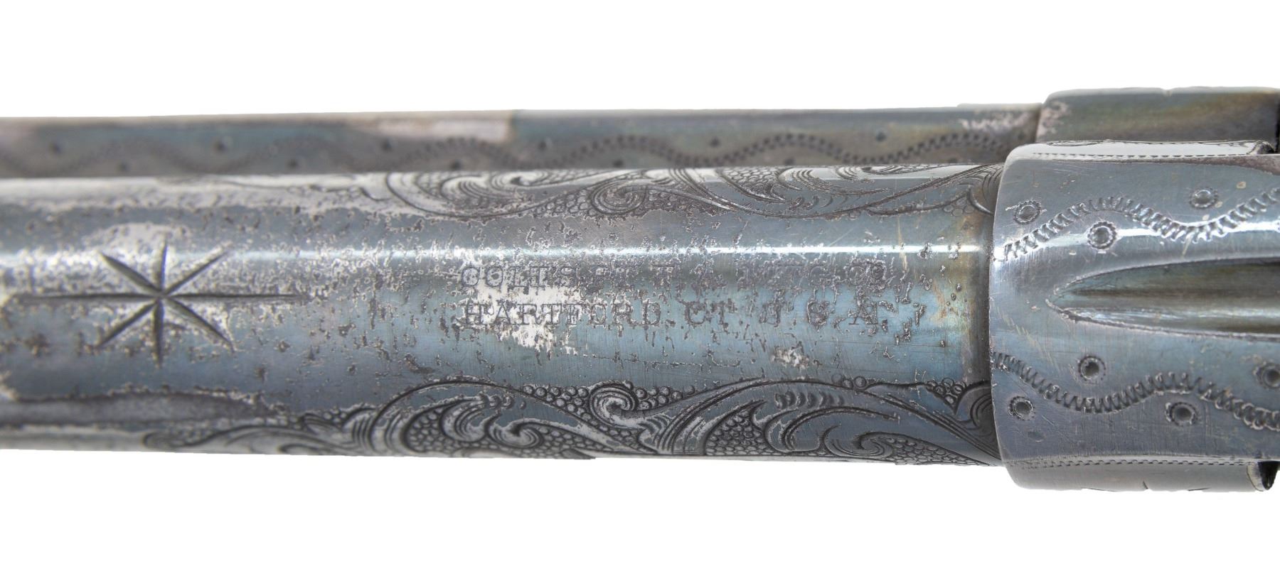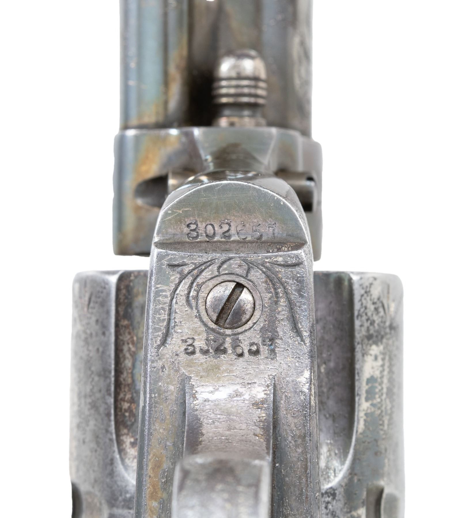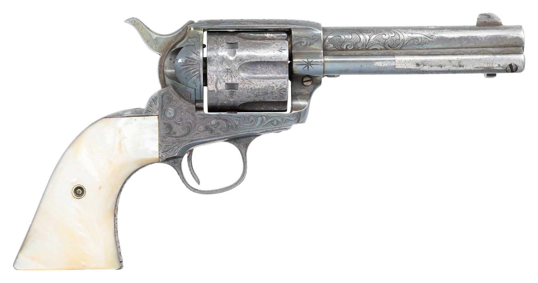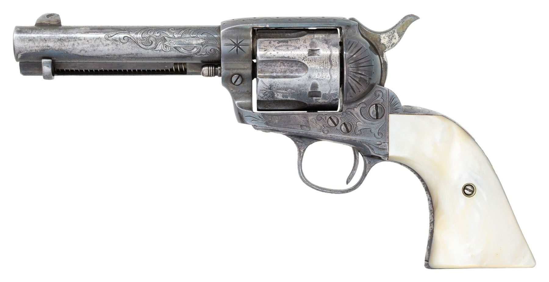 ATTRIBUTED TO COWBOY MOVIE STAR TOM MIX. Cal. 45 Colt. S# 302657. Tom Mix, 1880-1940, was an iconic western film star during the silent film era, appearing 291 films. A hand written letter from L. E. Flint, a director of the Livingston MT. Round-up Association states that this revolver was given to him by Tom Mix while hunting in North Dakota. Bbl. 4 3/4" with replacement blade front sight. 6-shot fluted cyl. 50% coverage engraving in the classic Helfricht style, consisting of scroll, starbursts, and wavy line & dot patterns. Full silver finish. 2 piece pearl grips. A Colt letter shows that this revolver was shipped on April 16, 1908 to Witte Hardware Company, St. Louis, Mo. Factory rework markings indicate return to the factory presumably for upgrading with engraving by Cuno Helfricht (as attributed by documentation from R.L. Wilson). Rework marking according to R. L. Wilson include: # "4585" on the loading gate, along with an upside down "B 68", "68", "*", "V", "6" & "1" in various location. Cuno Helfricht born January 26th, 1851 in Thuringen, Germany. His father Charles was a German trained master engraver. It is believed that Cuno was trained by his father as an arms engraver circa. 1860-1869. Cuno was employed as an engraver by the Colt firm for his entire career, becoming Colt's Chief Engraver, a position he held until retiring in 1921. UNATTACHED ACCESORIES: Colt Manufacturing Company letter dated February 12, 2004, stating the following: "Serial Number: 302657, Caliber: .45/c, Barrel Length: 4 3/4", Finish: Blue, Type of Stocks: Not Listed, Shipped To: Witte Hardware Company, Address: St. Louis, Missouri, Date of Shipment: April 16, 1908, Number of Same Type Guns in Shipment: 2". Included is a binder containing: a Tom Mix photo & history, the L. E. Flint letter, letters from previous owners and extensive information by noted author R. L. Wilson. In conclusion Wilson states: "The Tom Mix-Cuno Helfricht engraved Colt Single Action Army, No. 302657, is a historic and artistic rarity, with unique ambiance, patina, and documentation. This handsome revolver is well worthy of the finest private or museum firearms collection, and - should photographs be made available - of publication in the author's series of books on Colt engraving". Additional information provided includes: the book "Tom Mix Riding Up to Glory" by John H. Nicholas, "The Life and Legend of Tom Mix" by Paul E. Mix, "The Fabulous Tom Mix" by Olive Stokes Mix, a October of 1972 issue of "The Gun Report" (with article on Tom Mix), Riata Pass Gallery auction catalog and flier from the March 25-26, 2006 auction offering this revolver, as well as an auction invoice for this revolver showing purchase by our consignor on the March 25-26th, 2006 auction. CONDITION: this historic revolver retains over 70% silver finish having acquired a pleasing dark patina over a long period of storage. Forward portion of ejector rod housing shows a 2 1/2" area of added metal repair. Scattered pitting can be found on the areas where the nickel has worn off. Grips show light wear and age related checking. Action is tight and in time. Lightly pitted bore retains intact rifling. A rare opportunity for the advanced Colt collector to acquire an engraved SAA with colorful and detailed history. PROVENANCE: The Esteemed Norm Greenberg Collection. (25-4128/DS). CURIO. $15,000-30,000.