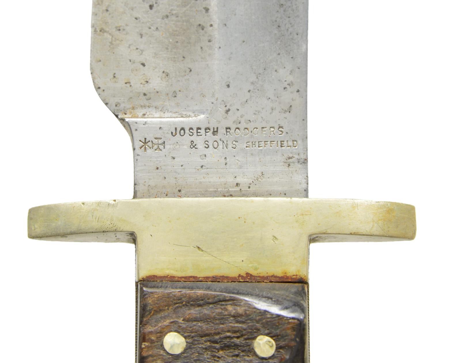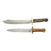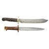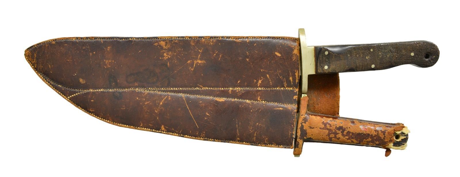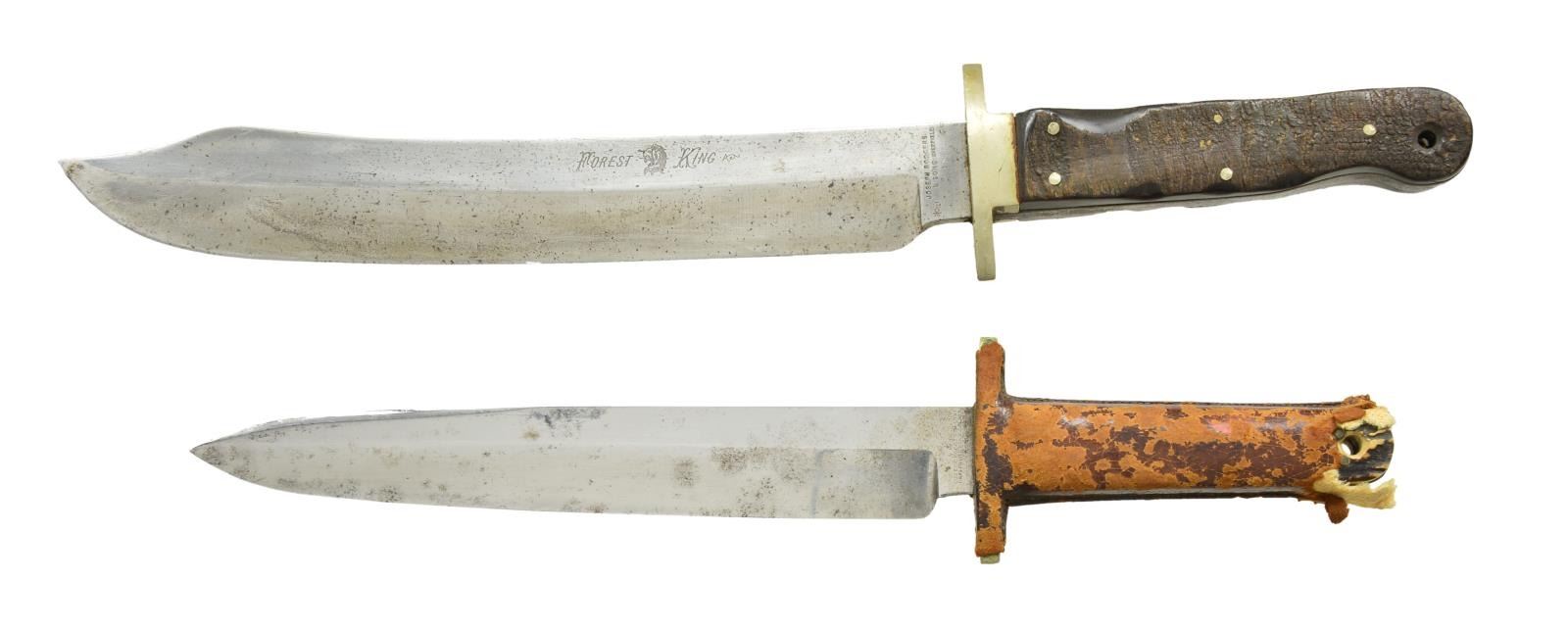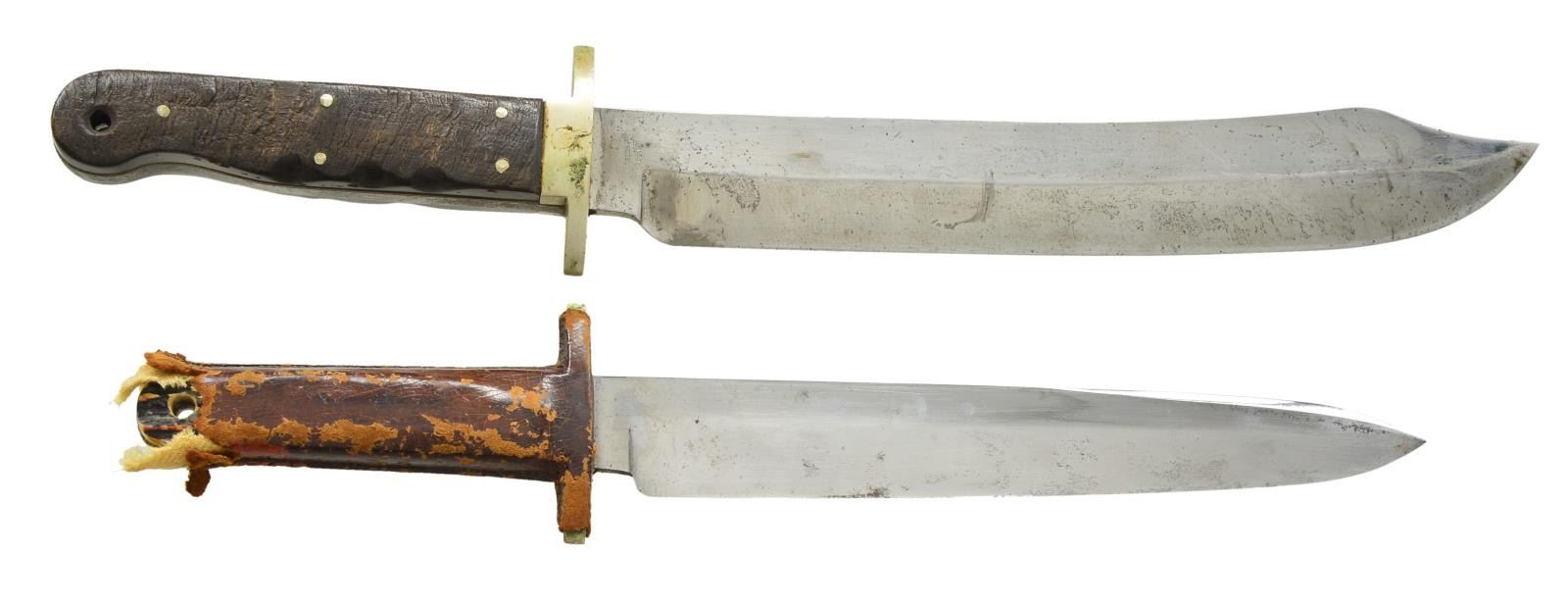 ROGERS PAIR OF BOWIES". From the Norm Flayderman collection and pictured and described on pages 190-191 of his monumental text “THE BOWIE KNIFE”. Both of these knives are etched on the top edge: W.H. MAY-ALERT” of unknown identification. The larger knife weighs 2 pounds, 18” overall, wide and thick upswept 12” with 2” clip, etched lengthwise “FOREST KING” with lion head, ricasso on either side marked “JOSEPH ROGERS / & SONS SHEFFIELD” & “DOUBLE SHEAR / STEEL”, reinforced full tang, solid German silver cross guard, horn slab grips. the smaller knife is 15” overall, 10” spearpoint blade, 4” false edge, solid German silver crossguard, maker marked “JOSEPH ROGERS & SONS / CUTLERS TO HER MAJESTY” with “VR” cypher. Stag slab grip covered with leather. CONDITION: very good overall, blades both retain much of their polish and luster, old sharpening on larger knife. Brown leather sheath is sound, scuffed, sewn belt loop is attached, complete but cut through at top. PROVENANCE: From the Lifelong Collection of Glen E. Mattox. (02-18529/JS). $1,500-2,500.