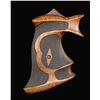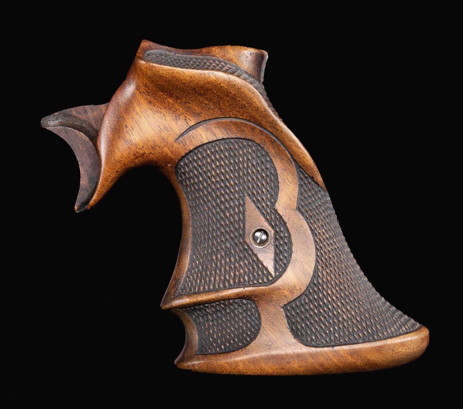 MODEL REVOLVER. A unique set of 2-piece grips made for use with Colt's Officer's Model revolvers. Grips are constructed of wood, featuring checkered panels and a unique contour with distinctive flares along the rear of the butt. Left grip features a checkered thumbrest. CONDITION: grips are very good, showing some light checkering wear, as well as some scattered superficial marks and minor impressions from handling and storage. Forward drooping points of grips show some chipping along the interior, not obvious from an exterior view. (02-25488/MLW). NON-GUN. $1,500-2,500.