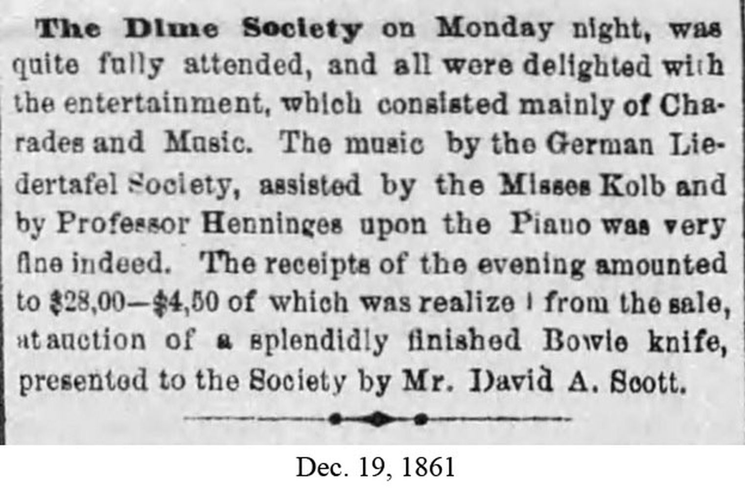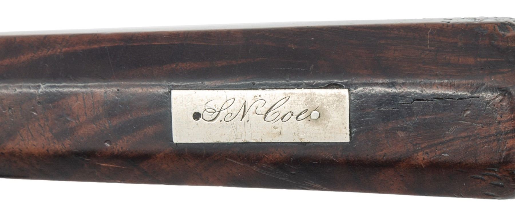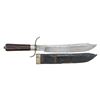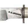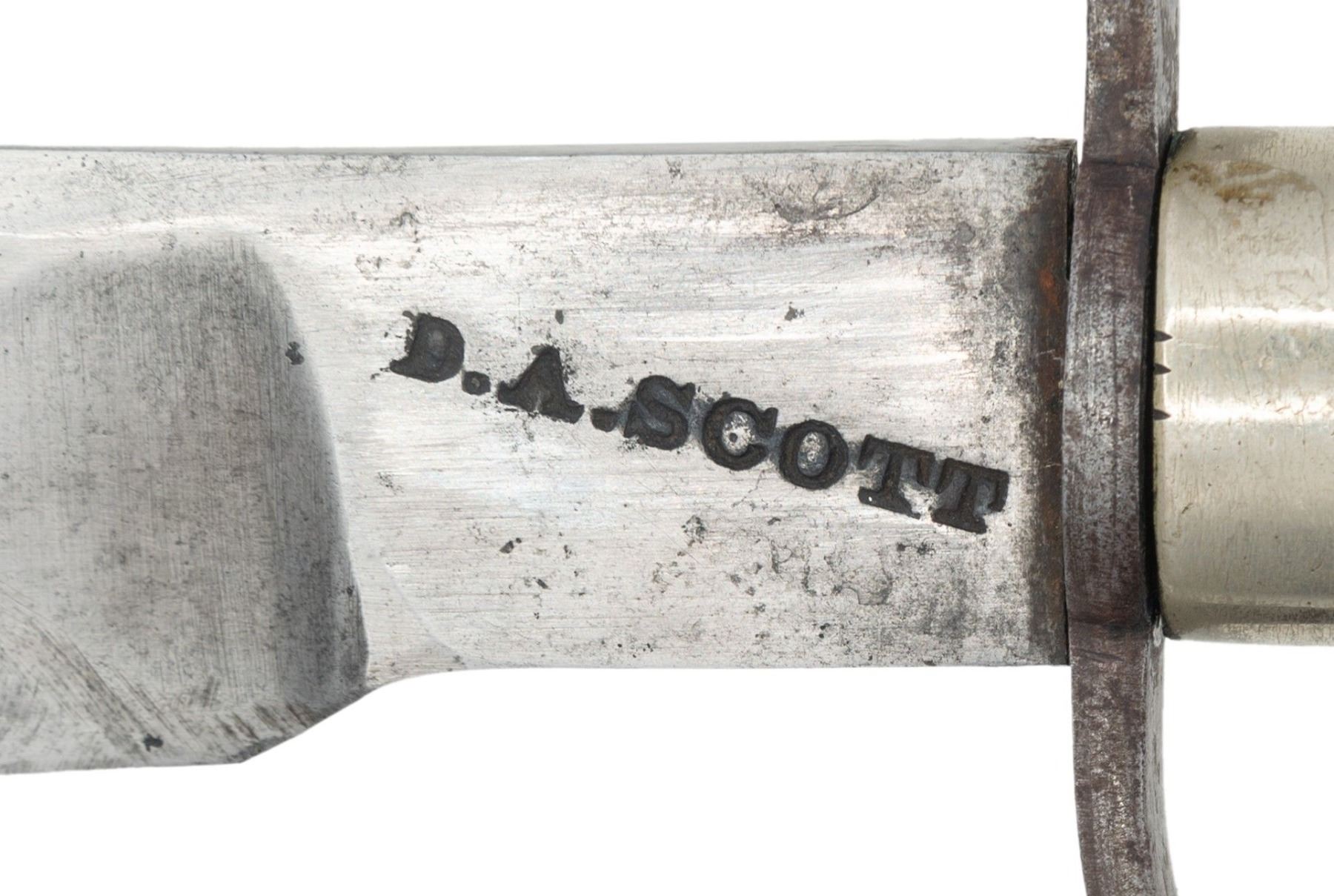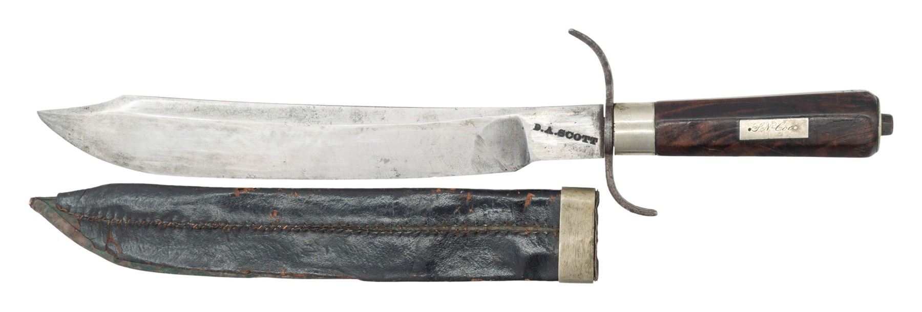 KNIFE, INSCRIBED TO 16th OHIO SOLDIER. This very fine well-made Bowie knife shows excellent cutlery skills for blacksmith D. A. Scott, who donated a "splendidly finished bowie knife" for charity auction as noted by Akron newspaper December 19, 1861. Bowie measures 16.75" overall, well balanced meaty 11.5" clip point blade, thick .30" at ricasso, nicely beveled top edge, stamped deeply on ricasso "D.A. SCOTT", 4" shaped cross guard, tapered octagonal rosewood handle with German silver ferrule & pommel cap, octagonal capstan nut. The original sheath is copper covered with leather veneer, German silver ferrule at throat. This is a very attractive & unique survivor by rarely seen Northern Civil War Bowie Knives.David A. Scott (1813-1885) is listed in newspaper ads and census throughout his adult life as blacksmith & mechanic. This is the only known signed example of his work and probably the knife mentioned in 1861 newspaper article. Inscribed escutcheon "S. N. Coe" which is unique name in Civil War database is for attorney Silas N. Coe (1837-1910) in neighboring Wayne County, who served Oct. 15, 1861 to Oct.31, 1864 as corporal in Co. G, 16th OVI. The 16th fought at many actions including Battle of Philippi, Skirmish at Bowman's Place, Battle of Rich Mountain, Battle of Chickasaw Bayou, Battle of Fort Hindman, Battle of Grand Gulf, Battle of Champion Hill, Battle of Big Black River Bridge, Siege of Vicksburg making 2 major assaults May 19 & May 22, 1864, Siege of Jackson, and the Red River Campaign. UNATTACHED ACCESSORIES: copy of page 141, "ACCOUTREMENTS V" by James R. Johnston where featured on full page, bio research of maker & amp; recipient. CONDITION: fine overall, blade is mostly bright with original finishing marks, nicks and scratches in cutting edge, still very sharp, crisp maker & stamp, hand word patina to nicely grained rosewood handle, German silver escutcheon & pommel each missing a pin. Sheath is sound, well fit, with losses to leather cover on one edge & tip, belt loop is missing, and partially unsewn. PROVENANCE: James R. Johnston collection. (02-26010/JS). NON-GUN. $6,000-8,000.