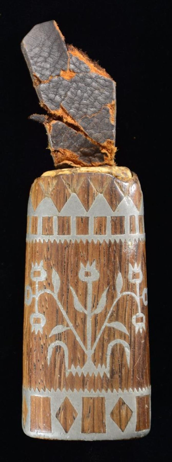 UNIQUE LEAD INLAID WOODEN CASTORIUM VIAL.