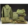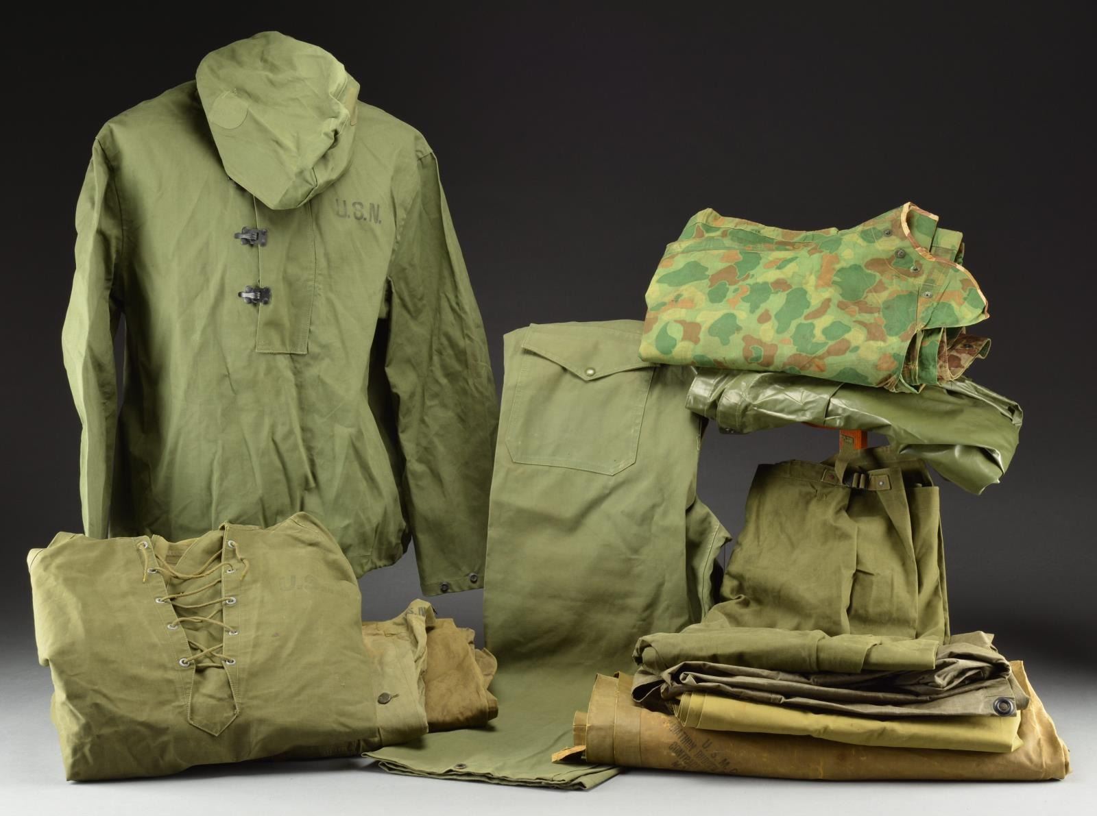 2) PONCHO. Unmarked light green WWII era measures approx. 86" X "64". Made of waterproof cotton fabric w/ snaps around head opening & exterior sides. Marked "LITE MFG. CO." "8 MARCH 1939" "U.S.M.C." CONDITION: in good condition w/ light wear & staining.