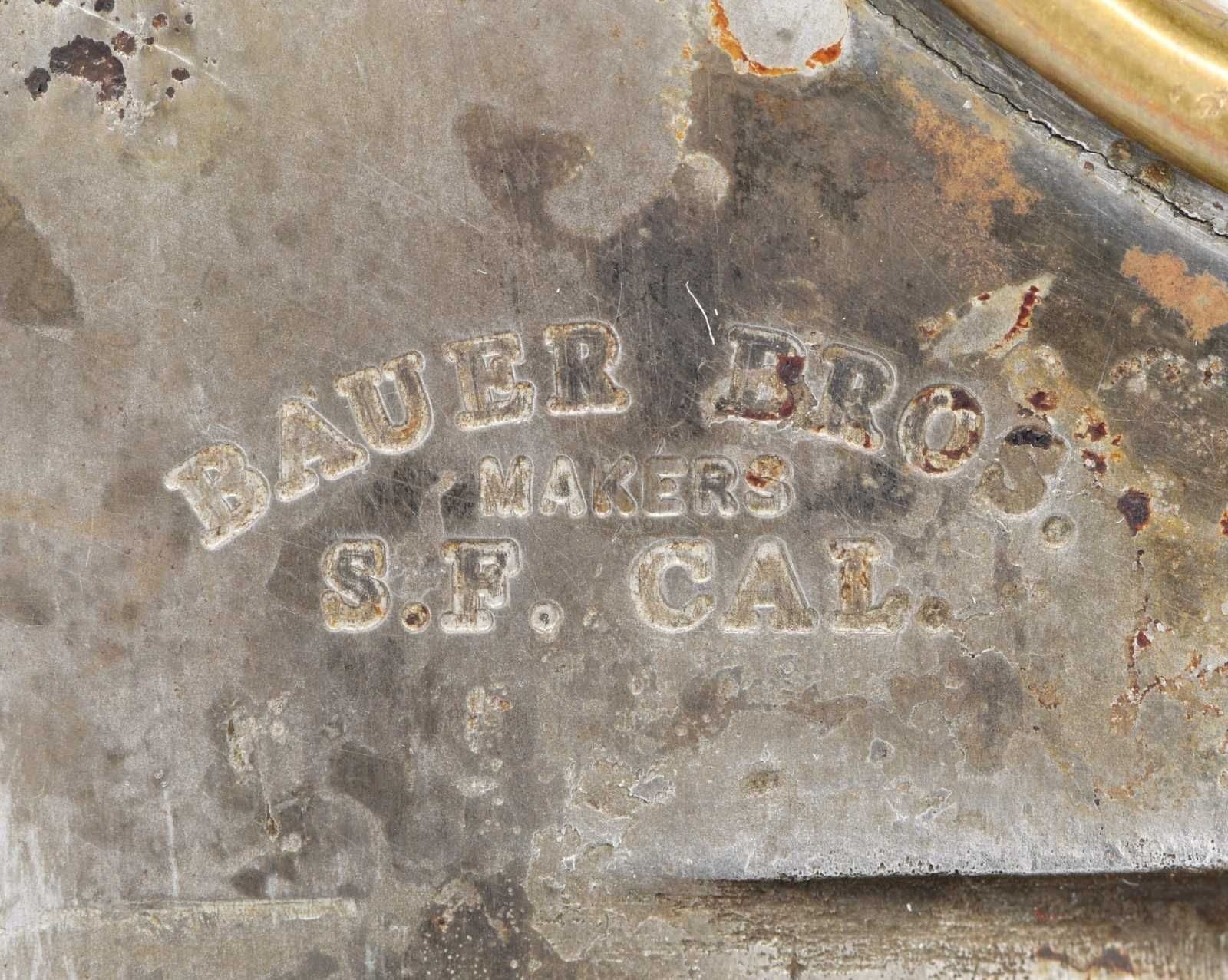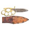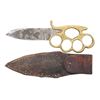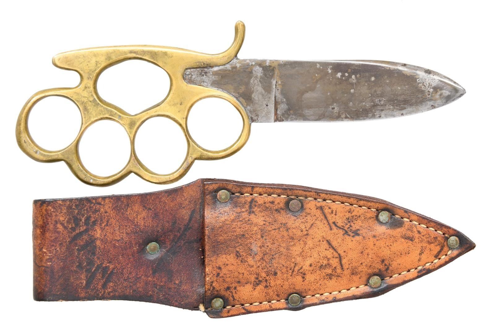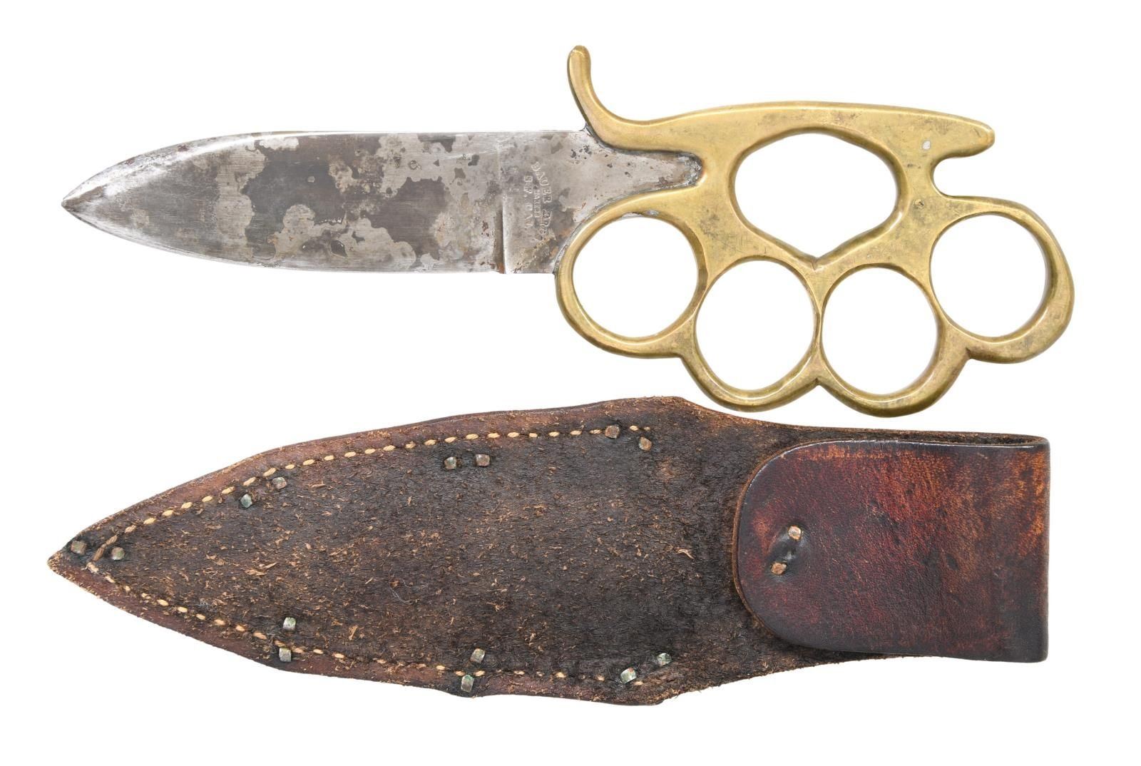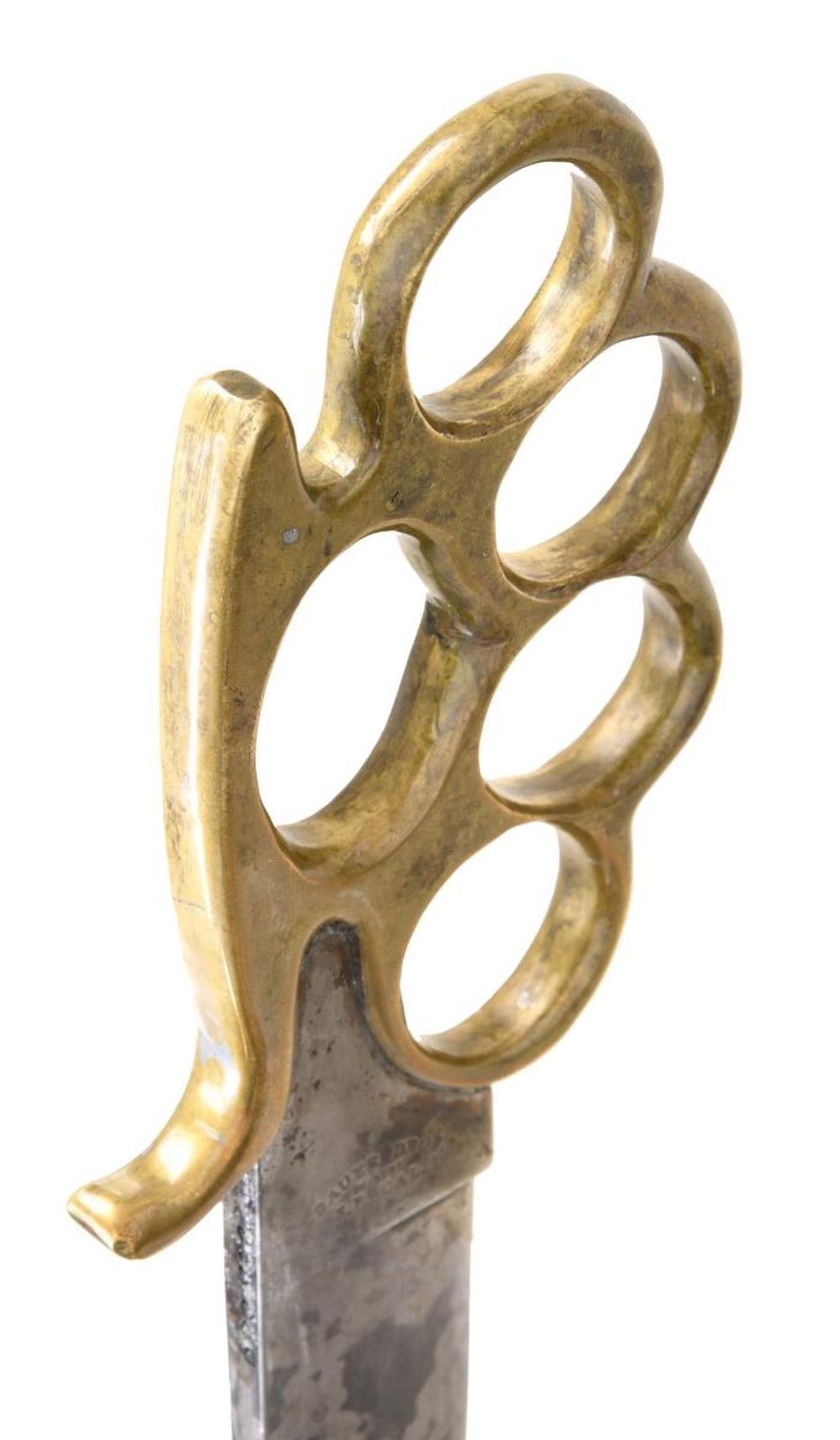 8" overall, 4" heavy .25" thick spearpoint blade marked "BAUER BROS. / MAKER / S.F. CAL". Accompanied with well fit brown sheath with belt loop. Knuckle knives are thought to be 20th innovations by most collectors. Knuckle knives were very popular in the military during World War I and World War II. Bauer Brothers are not thought to have made cutlery after 1890. The blade form is identical to what collectors think of as a California knife, most often by makers such as Will & Finck or Michael Price, the best known San Francisco cutlers. CONDITION: fine overall, blade has mottled gray patina with the remnants of old plating. Sheath is fine. (02-21294/JS). $6,000-8,000.