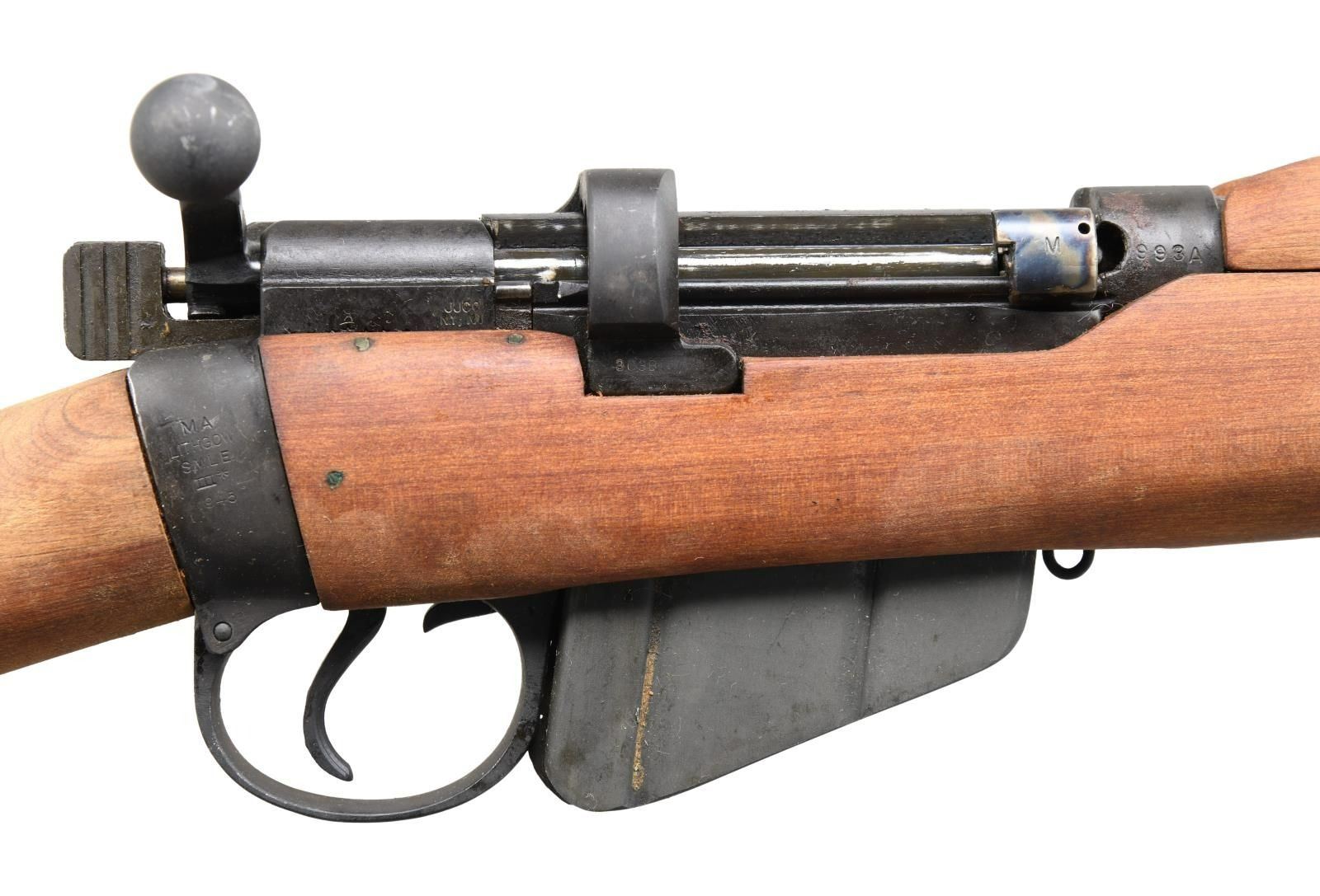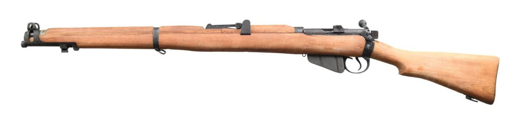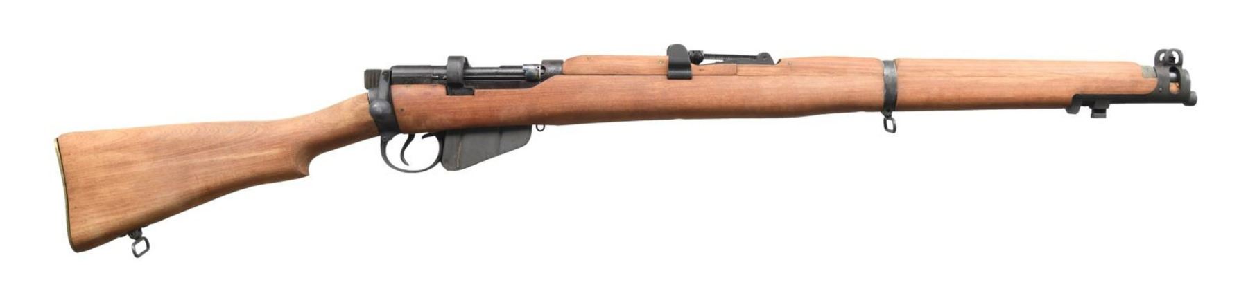 MILITARY RIFLE. Cal. 303 Brit. S# 993A. S# matches on receiver, nose cap, & bolt. Bbl. 25", import-marked on right side of the receiver. Tangent rear sight graduated to 2,000 yards. Blade front sight. Nose cap has protective ears & bayonet mt. Butt socket is marked on the right side "MA" / "Lithgow SMLE III* 1945". Hardwood stock set. Brass trap buttplate. MAGS: 1 unmarked 10 rd. UNATTACHED ACCESSORIES: rifle has hang tags & matching cardboard shipping box. CONDITION: stock set has notably thin original finish with scattered light handling marks. Metal retains 95% of its original black finish with very light high-point wear. Near excellent, shiny bore. PROVENANCE: from the lifelong collection of Terrence McCarty. (24-404/RW). CURIO. $300-500.
