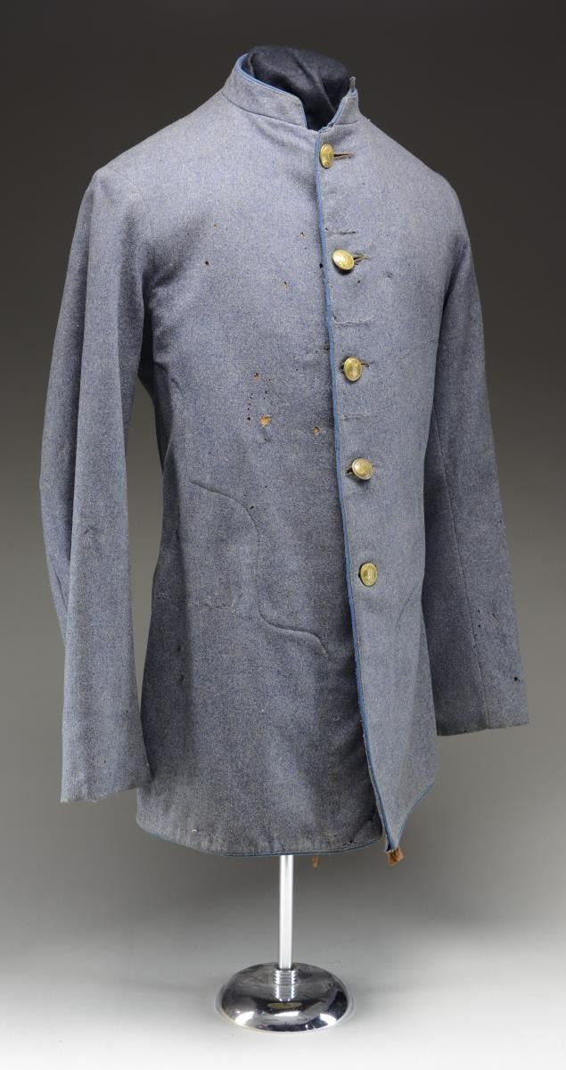 This coat is a blue/gray wool of a reasonably fine grade. The front, bottom, & collar are piped in blue. The coat has 5 buttons down the front, which are original Confederate blank back, script "I" buttons. There are no exterior pockets on the coat, but there is one interior pocket at the right breast and one small watch pocket on the left side. The coat is not lined, but the sleeves are lined in a striped, polished cotton material. CONDITION: the coat has scattered moth holes throughout with one section of severe moth damage at the rear left side. However, the coat does display well from the front. (02-20139/BF). $750-1,000.