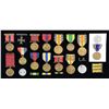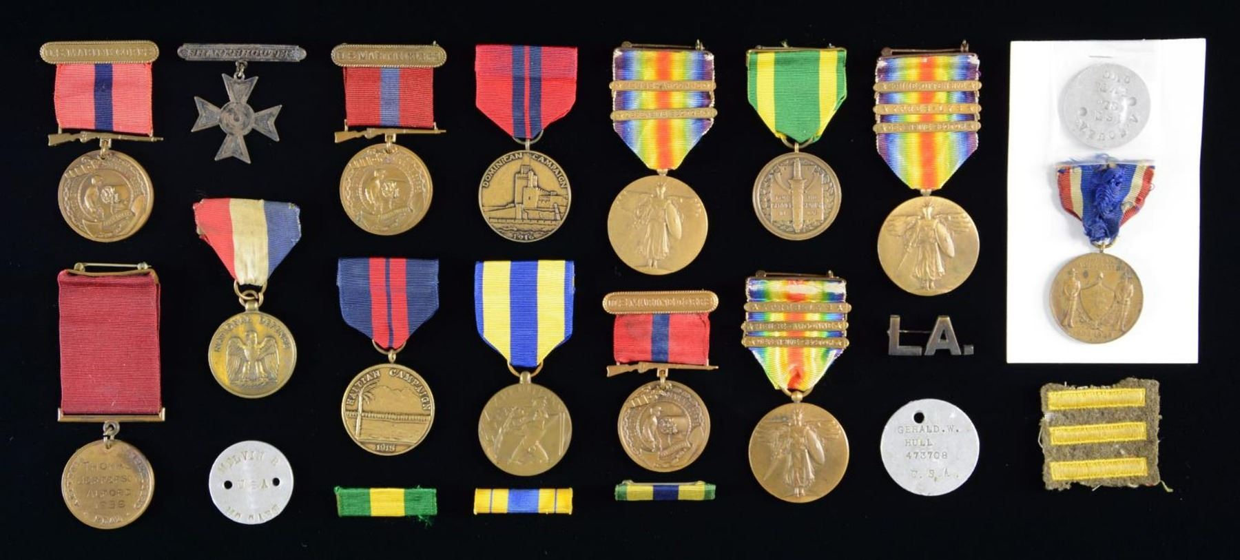 This group includes 1 Cuban Pacification Medal marked on the rim “NO. 1289” with an early dog tag that reads “A.SOUZA 1ST CL. PVT. QMC”. / 1 Spanish War Service Medal numbered “7296”. / 3 WWI Victory Medals. / 1 Navy Expeditionary Medal. / 1 Reproduction Dominican Campaign Medal. / 1 Reproduction Haitian Campaign Medal. / 1 Navy Good Conduct Medal named on the reverse “THOMAS JEFFERSON ALFORD 1938”. / 1 National Defense Medal with the incorrect ribbon. / 1 Early Marine Corps Good Conduct Medal numbered “NO. 40332”. / 1 Early Marine Corps Good Conduct Medal numbered “NO. 40447”. / 1 Early Marine Corps Good Conduct Medal numbered “NO. 57696”. / 1 Ribbon bar for the WWII Selective Service Medal. / 1 Ribbon bar for the Mexican Border Service Medal. / 1 Ribbon bar for the Mexican Service Medal. / 1 Sharpshooter Qualification Badge. / 1 Early dog tag marked “GERALD. W. HALL 473708 U.S.A.”. / 1 Early dog tag marked “MELVIN B MC CABE USA 2276428”. / 1 WWI subdued collar insignia that reads “LA.”. CONDITION: all items show light wear. The Victory Medals have worn ribbons, as does the Cuban Pacification Medal. (02-20154/BF). $500-800.