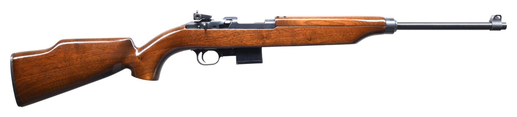 Cal. 30 Carbine. S# 375924. Bbl. 18". Stamped adjustable aperture rear sight graduated to 300 yards. Blade front sight w/ protected ears retained by set screw. Receiver ring marked "UNIVERSAL / HIALEA, FLA. / CAL. 30M1". The Model 1005 deluxe carbine sports a walnut stock w/ a Monte Carlo comb & a high-gloss finish. The carbines of this era were produced largely w/ commercial parts & have an added bolt hold-open device. The bbl. band is a circular machined piece which retains the forward end of the handguard & stock. MAGS: 1 detachable original plastic 5 rd. CONDITION: stock has high-gloss finish w/ scattered small handling marks. Metal retains a large degree of its factory blue finish. Very good shiny bore. (25-2259/RW). MODERN. $300-400.