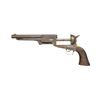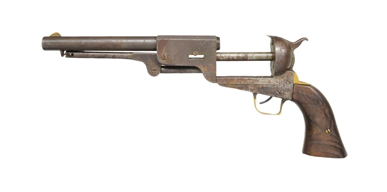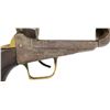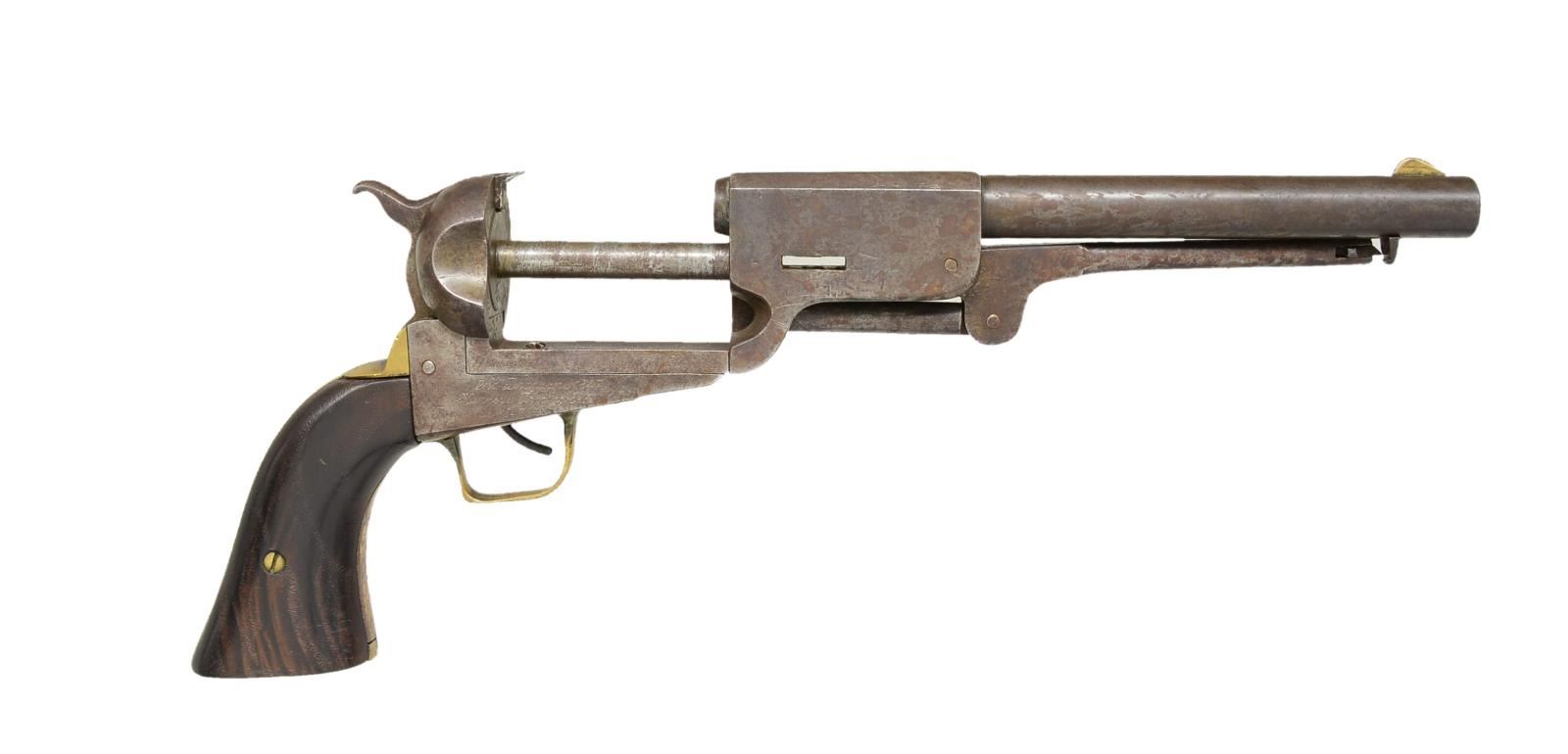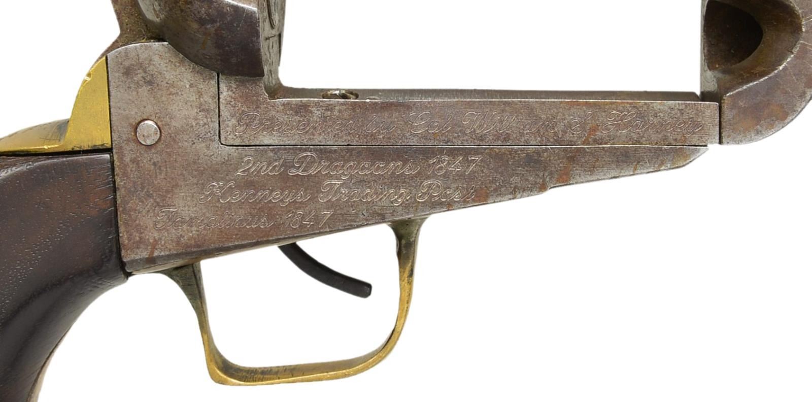 Cal. 44. NSN. Bbl. 8 3/4" oct. to rnd. Engraved on 2 piece frame & backstrap “Presented by Col. Wiliam S. Harney / 2nd Dragoons 1847 / KENNYS TRADING POST / TAMALIPUS 1847” & “THIS FIREARM PRESENTED BY ORDER OF / THE SECRETARY OF WAR FOR SERVICE BEYOND / THE LINE OF DUTY / SEMINOLE INDIAN WAR” & brass backstrap inscribed “MAJOR GEN. ZACHARY TAYLOR / CORPUS CHRISTI / TAMALIPUS 1847”. This reproduction is of unknown origin w/ braised on trigger guard & trigger bow. It appears someone was testing their engraving skills w/ a rotary tool as there are 3 distinct presentations. Revolver is missing its cyl. & wedge & has the most unusual mechanism only operating in dbl. action. UNATTACHED ACCESSORIES: 3 pages of notes. CONDITION: very good overall. Loading lever wont latch, dbl. action works well, but you must have a sm. finger to get under the short hammer. (01-19827/JS). ANTIQUE. $400-600.