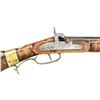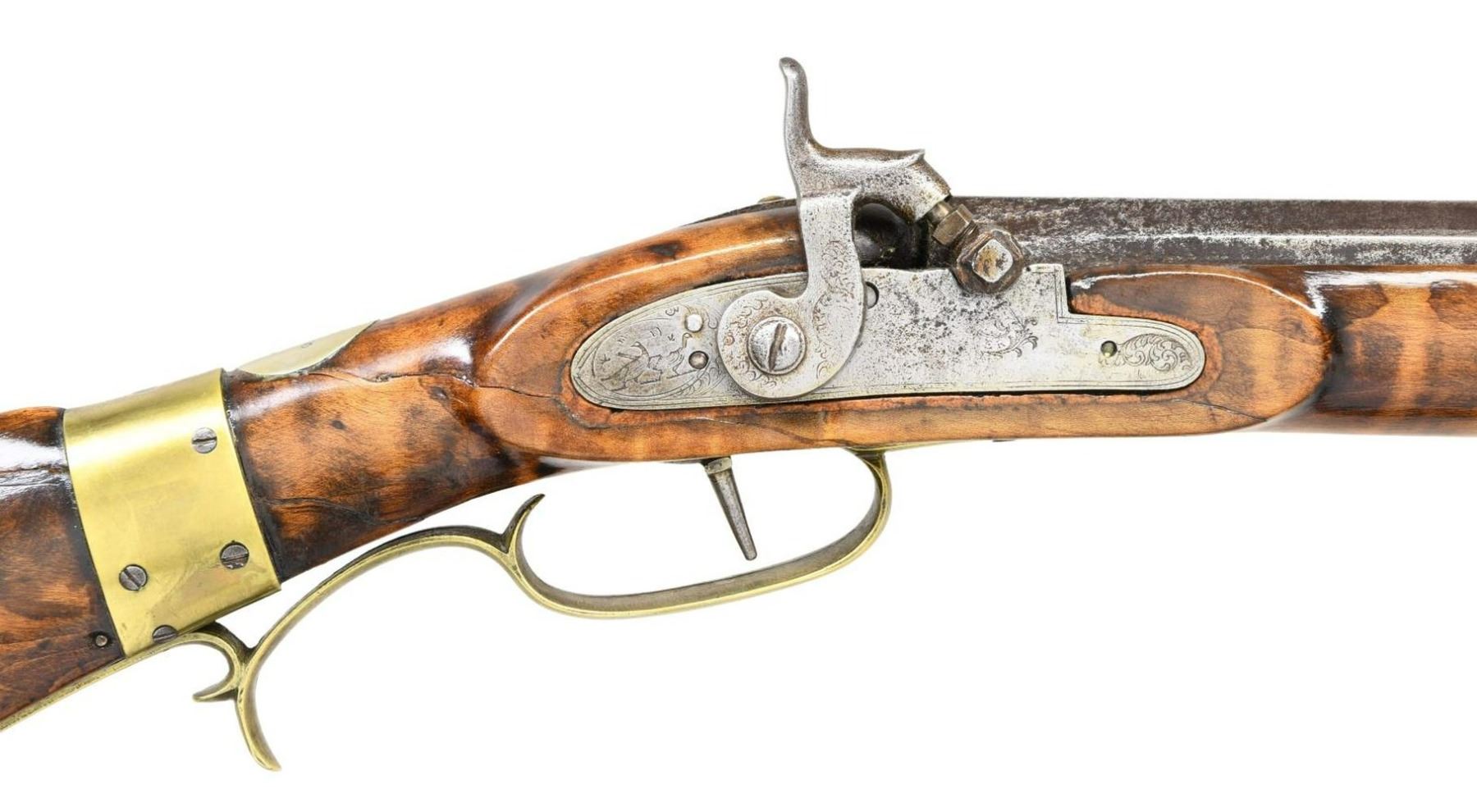 Cal. 39. NSN. Bbl. 39 1/8". American full stock percussion Kentucky rifle produced by an unknown maker. The rifle is devoid of any markings, save for "REAMSTOWN PA", which is stamped on the left flat of the octagonal bbl, at the rear. Lockplate exhibits some light scroll engraving, with a scene of 2 birds engraved on the left side of the plate. Full length wood stock features a German silver oval escutcheon on the wrist, with a German silver inlay present on the cheek rest. Brass buttplate, patchbox, trigger guard, ramrod ferrules, and nose cap. Wrist exhibits a break that has been reinforced with a brass band. Metal components have been cleaned at one time, with the stock having been sanded and revarnished. CONDITION: iron components exhibit a mottled gray patina, with corrosion present on the lockplate and on the bbl. around the percussion bolster. Brass components are very good, as previously cleaned, exhibiting some scattered handling marks overall. Stock exhibits some scattered marks from handling and storage, exhibiting a couple small cracks and chips, as well as the aforementioned repair at the wrist. PROVENANCE: from the Lifelong Collection of Robert "Mike" Bricker. (01-24931/MLW). ANTIQUE. $500-800.