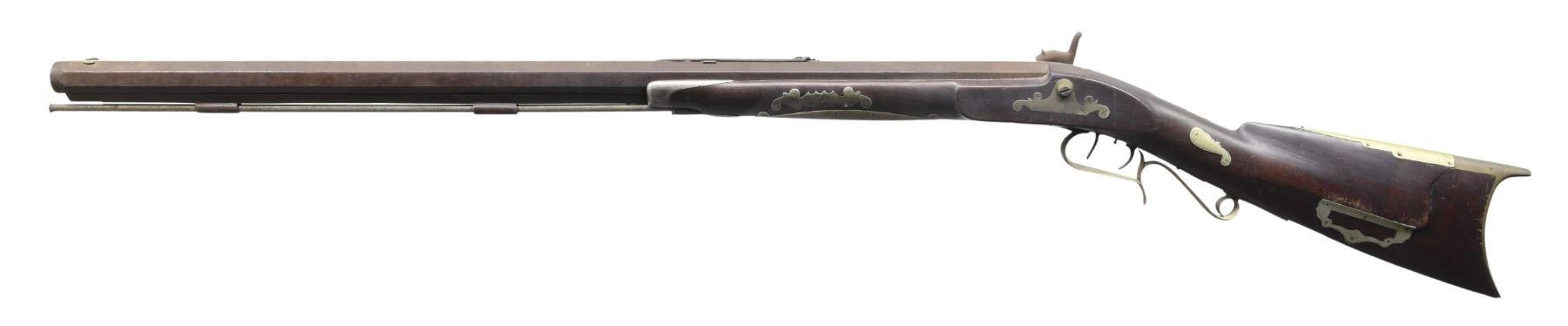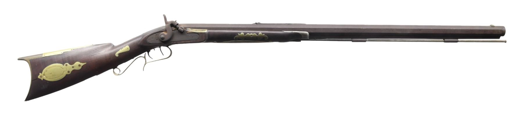 Cal. 38. NSN. Bbl. 30 1/4" heavy octagon measuring 1" across flats. Brass blade front sight w/ elevator adj. U notch rear sight. Engraved trade lock. Double set triggers. Pin fastened half-length walnut stock w/ pewter nosecap. Brass fittings include crescent buttplate, toeplate, heelplate, oval lid patchbox, finger curl trigger guard, sideplate, ornate escutcheons & thimble. Additional brass ornamentation consists of large engraved plate along bottom of forearm w/ pierced pick plate under cheekpiece & ornate inlays at top & sides of wrist. Iron ramrod is held on iron underrib by 2 plain pipes. WEIGHT: 10 lbs, 6.2 oz. CONDITION: metal has a dark heavy brown patina w/ scattered pitting. Lock is not functioning & has weakly visible engraving. Stock has age darkened appearance showing handling marks w/ crack extending from right side of buttplate. Area above forward portion of lock has a tacked brass plate repair. Dark pitted bore retaining largely intact rifling. (01-25424/DS). ANTIQUE. $300-500.