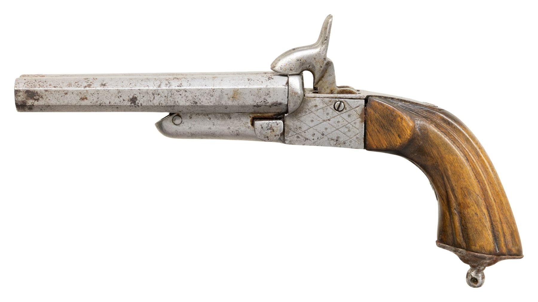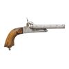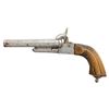 Cal. 11mm Pinfire. NSN. Bbl. 4 11/16". SxS pinfire pistol likely produced in Belgium by an unknown mfg. Left side of the frame features light diamond and dot engraving, with the underside featuring a small foliate motif to the rear of the triggers. 1-piece grooved wood stock featuring an iron pommel and faux lanyard stud. CONDITION: metal components have been cleaned in-the-white, exhibiting scattered areas of light to mild pitting, with some scattered patches of dark mild surface oxidation. Bores exhibit consistent mild to moderate pitting, while retaining trace rifling throughout. Proper manual mechanics, although the bbl. assembly is loose. Stock shows scattered marks and impressions from handling and storage, but otherwise remains sound. (01-28577/MLW). ANTIQUE. $100-200.