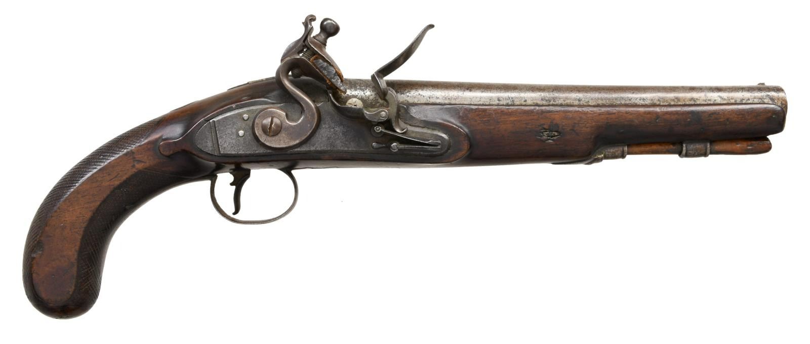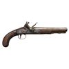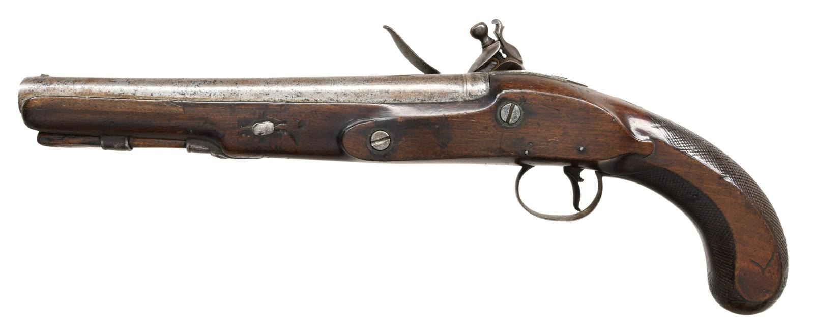 HOLSTER PISTOL. Cal. 67. S# NSN. The 9" tapered round barrel has military type turnings at rear and platinum lined touch hole. Lock with chamfered plate having rebated tail is fitted with serpentine cock, integral semi waterproof pan, bridled roller frizzen with roller on feather spring which has bulbous finial. European walnut stock extends to muzzle and attaches to barrel with single side nail. Chamfered bag grip is checkered. Iron trigger guard has unengraved pineapple finial. Hickory ramrod mounts through beaded pipe and matching thimble. CONDITION: good. Iron parts with pitted dark gray patina. Stock is good with hand worn patina at grip and many scattered marks. A 3" sliver in barrel channel on left side is replaced. Bore is pitted. Lock is good. (01-23481/MGM). ANTIQUE. $1,000-2,500.