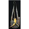 BAG. Unmarked 9" x 9" brown leather possibles bag having double compartments. 1 1/4" Leather shoulder strap w/ integrated leather sheath for unmarked 9 3/4" overall knife having 5" blade, brass ferrule & stag handle. 12" overall powder horn w/ threaded plug, 2 broken leather straps being held to shoulder strap by string. CONDITION: Bag appears good intact w/ cracking leather. Shoulder strap in fair worn condition w/ tearing & flexing. Good intact powder horn. PROVENANCE: Estate of Frank Glenn Marsh (02-17036/MD). $500-800.