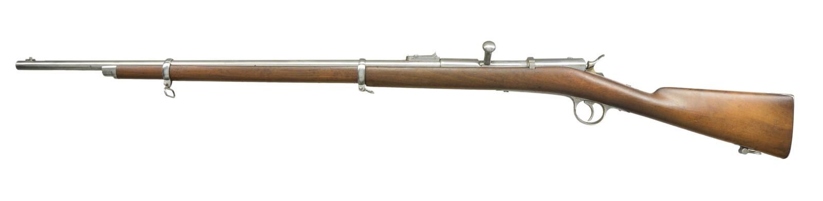 Cal. 11mm. NSN. Bbl. 30". Needlefire rifle that is likely of French or Belgian origin. Bolt opens on left side & hammer actuates firing. Right side of butt has "MUSEE DE L'ARTTle" & "312" markings. Other parts are largely unmarked. No needle is present. Ladder rear sight graduated to 900m. Blade front sight. Right side bayonet mount. Hardwood stock w/ bottom mounted sling swivels. CONDITION: stock appears sanded long ago w/ a few patch repairs, a crack forming on right side between the two bands & some handling marks. Metal was heavily cleaned to bright w/ scattered scratches, oxidation & some fine pitting. Worn bore w/ scattered pitting & oxidation. (01-22248/MJC). ANTIQUE. $400-700.