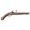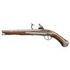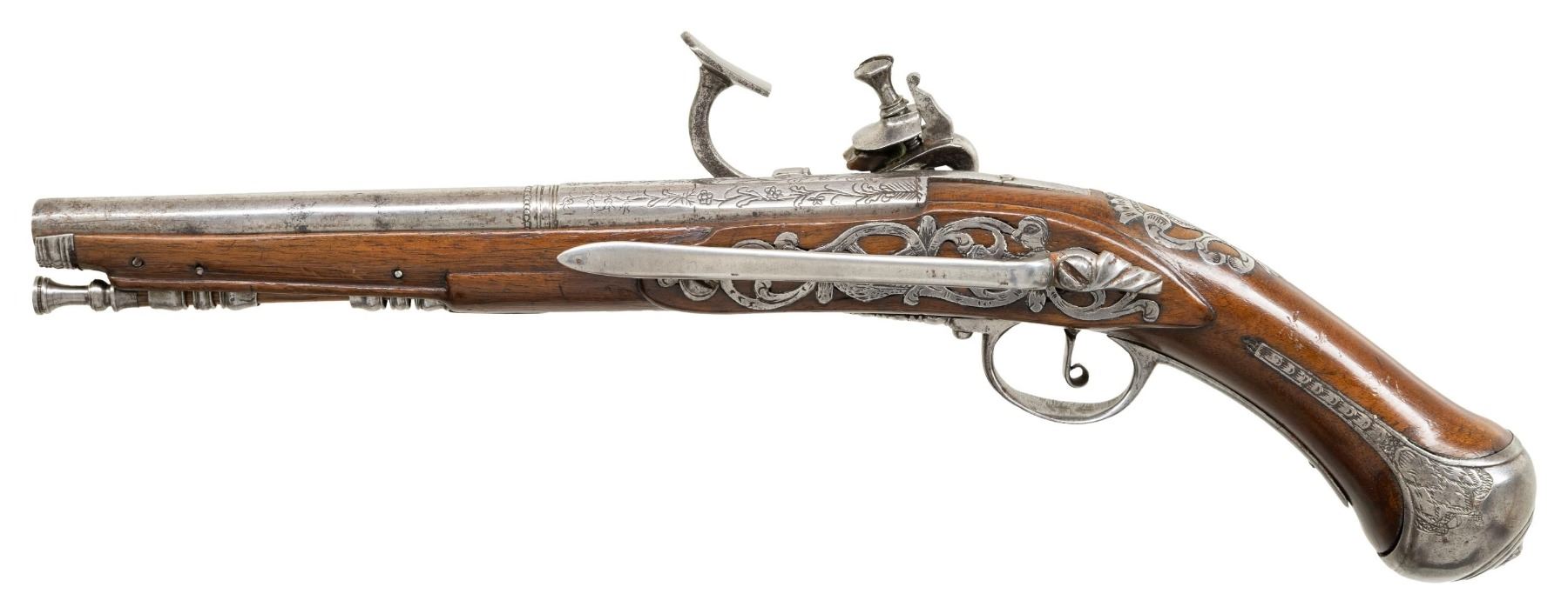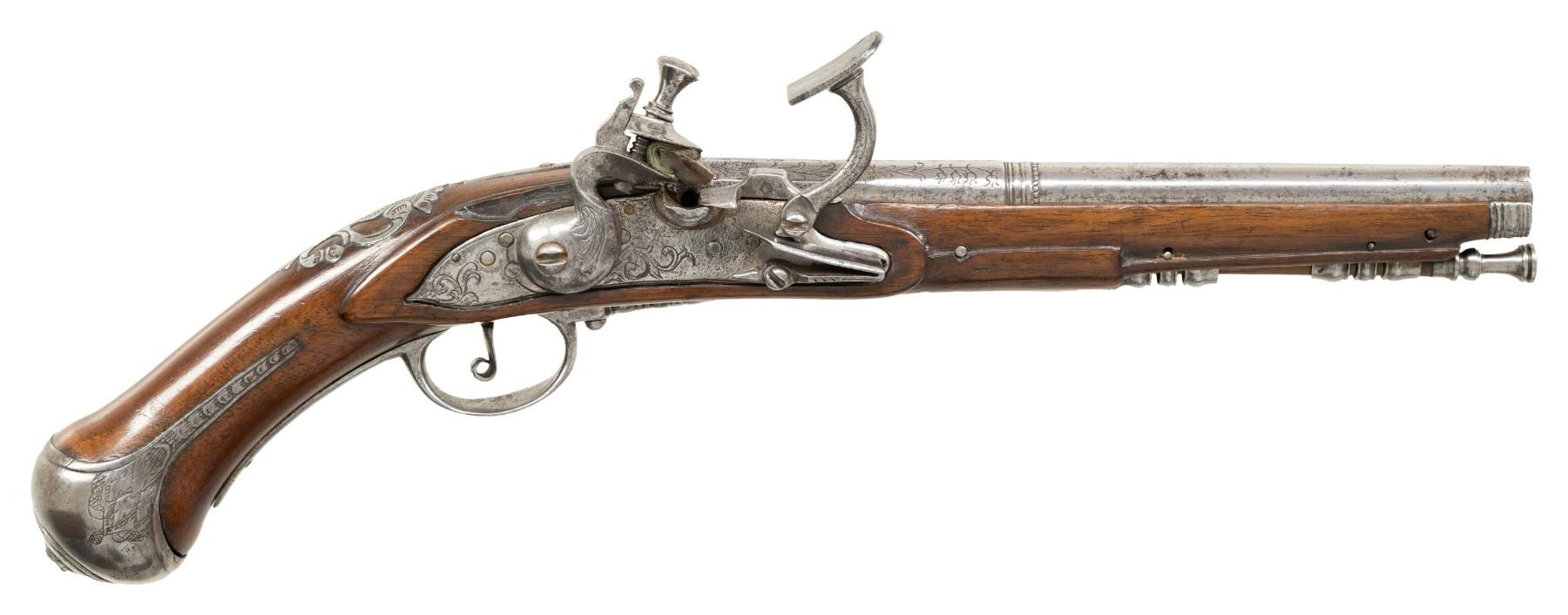 Cal. 45. S# NSN. The 8-1/4" barrel goes from octagonal at breech through 16 sides to wedding band and then to round. Foliate and floral engraving is on breech. Transitional type flint lock with round bodied arched plate is fitted with serpentine cock, inset rounded pan with sliding cover, snaphanuce type frizzen and feather spring with spear finial. Newer European walnut stock with knob grip extends to muzzle with beaded tip and is pinned to barrel. Mounts are early in style with trigger guard having multi-beaded finial. Grip cap with engraving on sides has small grotesque face at bottom. Multi-pierced sideplate is of early scroll form and is fitted with 5" steel belt hook having finial similar in style to trigger guard. A steel pierced crestplate is at top of grip. Hickory ramrod with turned steel tip and flattened worm tail mounts through slotted and beaded steel pipe and matching thimble. CONDITION: fair to good. Metal parts cleaned to bright silver. Replacement stock retains most of its finish, possibly original, with some light marks. Bore is very rough. Lock barely operable and will not hold at full cock. (01-26948/MGM). ANTIQUE. $1,500-2,250.