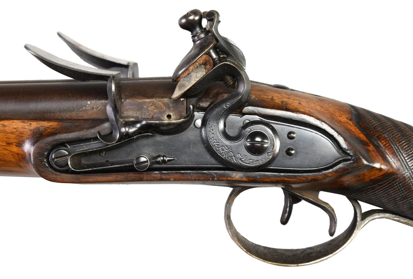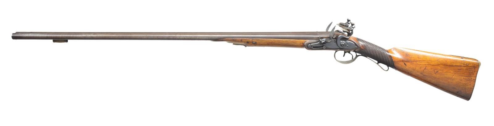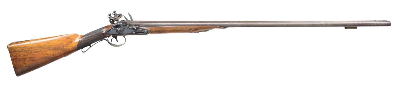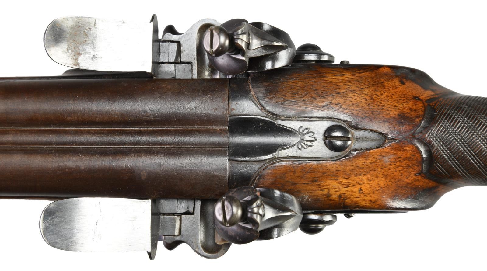 SXS SHOTGUN. Cal. 20 Bore. NSN. Twist pattern 33" bbls. w/ swamped rib, front stud & brass pipe. Unmarked locks w/ light scroll ornamentation on hammers. Wedge fastened walnut stock w/ skip line checkering. Ornate brass thimble, triggerguard & buttplate showing rose & scroll patterns. CONDITION: bbls. have turned a dark brown patina w/ peppery oxidation throughout; considerable pitting around touch holes. Wood shows worn finish, a few sm. cracks, numerous dents & marks. Fair pitted bores. (01-22273/MD). ANTIQUE. $150-200.