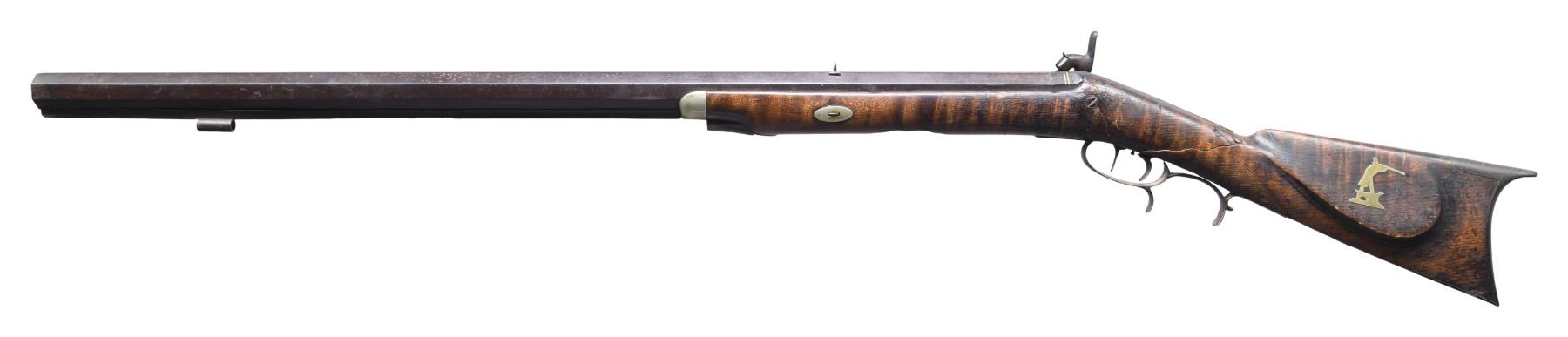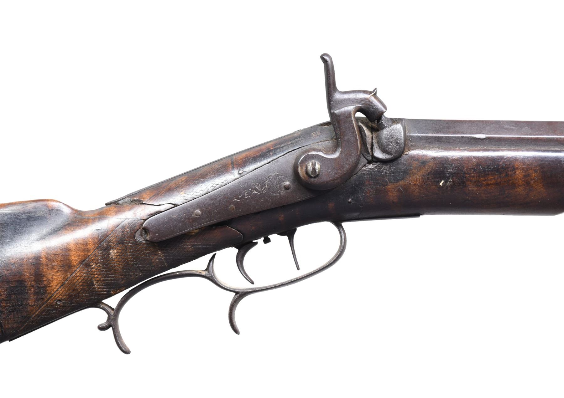 Cal. 40. NSN. Bbl. 31 1/2". No front sight present. V-notch rear sight. Upper tang has vacant hole likely for aperture sight mounting. Unmarked half-stock percussion rifle. Double set triggers. Finger curl trigger guard. Checkered stock with patchbox & silver nosecap. Left side cheekpiece with silver decoration. No ramrod present. CONDITION: stock shows repaired break at wrist, further scattered cracks, dings, worn checkering, flaking finish & handling marks. Lockplate is loose at rear. Metal is mostly a dull gray patina with scattered oxidation & pitting. Hammer is sluggish when trigger is pulled & may require attention. Oxidized bore. (01-26997/MJC). ANTIQUE. $400-600.