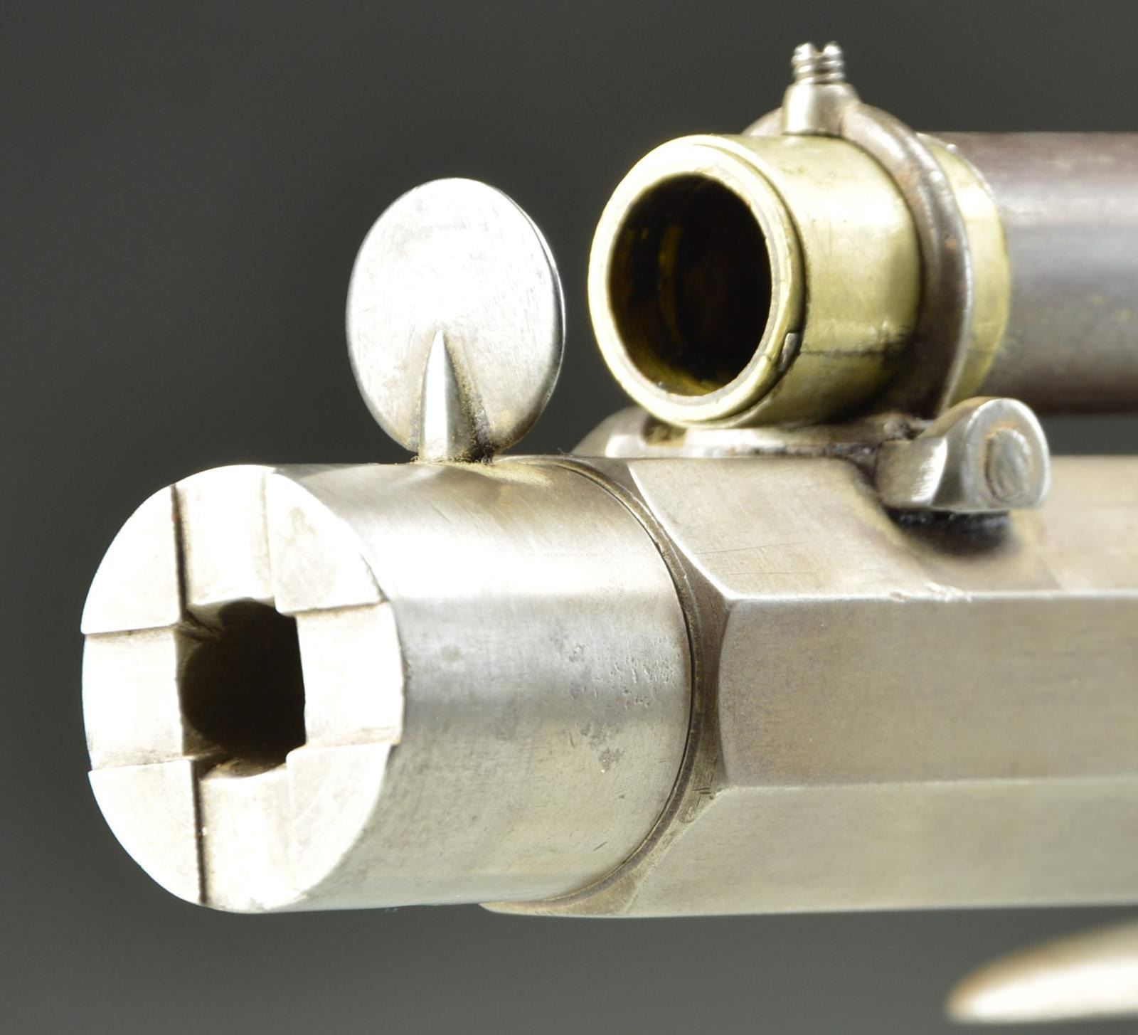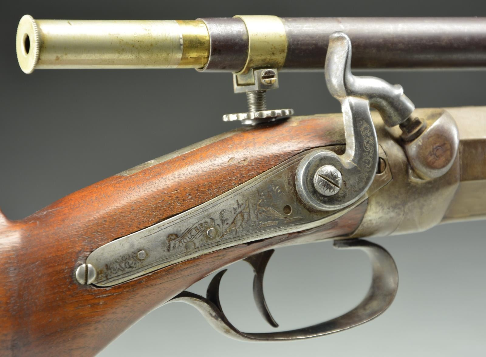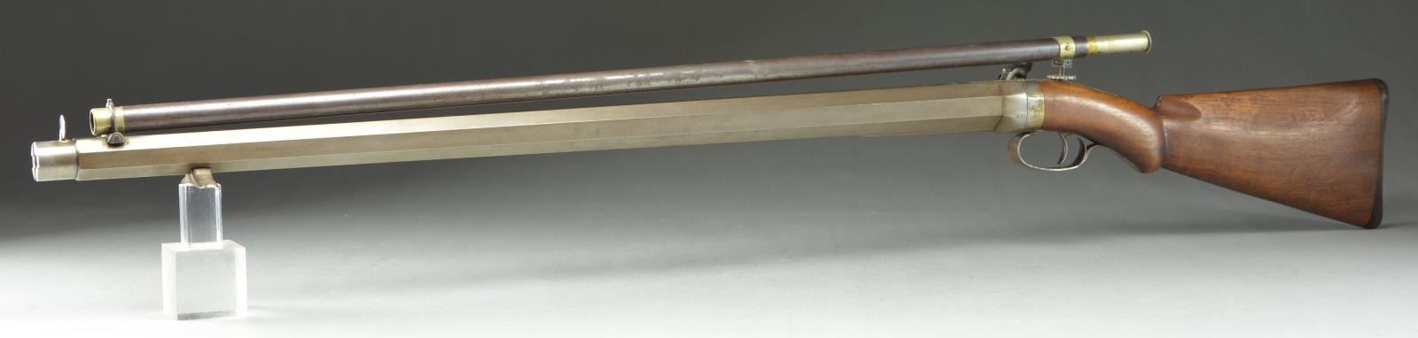 FALSE MUZZLE AND SCOPE. Cal. 38 (6 Groove rifling with rapid twist. NSN. The tapered heavy (1.45" at breech & 1.18") at muzzle octagon barrel is fitted with pedestal front base. Barrels also fitted with false muzzle. Patent breech has well filed side bolster and is unvented. Rifle is fitted with Golcher back spring percussion lock and steel trigger guard. Amateur made walnut buttstock measures 12 5/8" over Springfield National Match type checkered steel buttplate. Rifle is fitted with unmarked long tube telescopic sight with crosshair reticle with wheel adjustable elevation and home made mounts.
