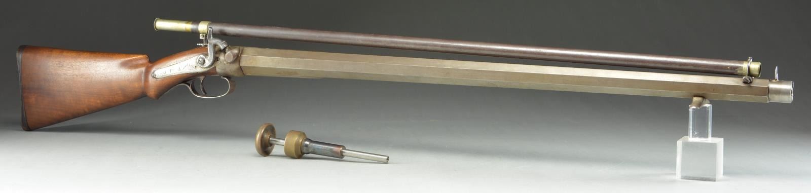 UNATTACHED ACCESSORIES: Brass and steel bullet seater and wood loading rod all in gray plastic Doskocil case. CONDITION: good. Bore is very fine bright and shiny. Lock operable. Scope is usable but cloudy. (01-22046/MGM). ANTIQUE. $1,400-2,000.