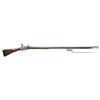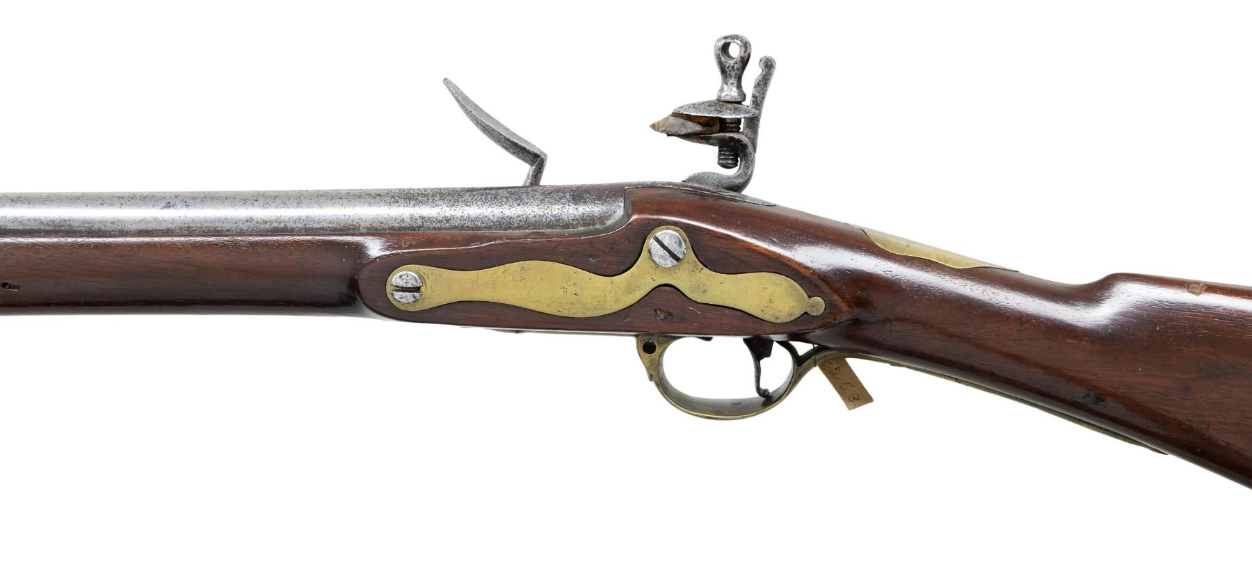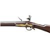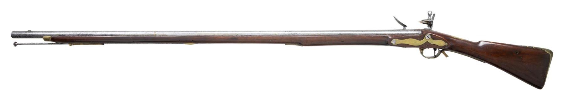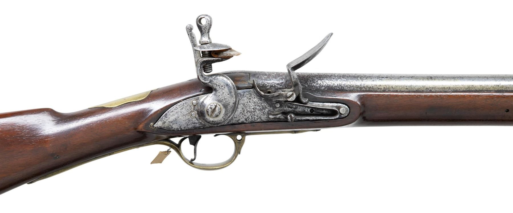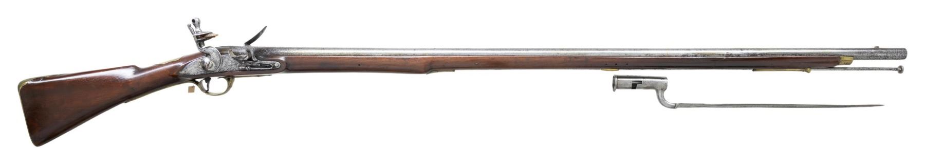 AMERICAN RESTOCKED. Cal. 75. S# NSN. The 48-1/4" barrel is not proofed and does not have turnings at breech end. Remnants of markings can be seen on 1742 style lock but it appears they have been removed at an early date. American walnut stock with late style comb, no beaver tail, but with palm swell extends to within 4" of muzzle with brass cap and is pinned to barrel. Brass furniture is of 1750's style. Sideplate with tail is flat. Buttplate has short top tang. A button head ramrod is present; sling loops are not. UNATTACHED ACCESSORIES: musket is fitted with triangular bayonet with 15-1/4" blade with remnants of maker's mark and "R" on top. Rack number "430" is on right side. CONDITION: iron parts are cleaned to silver gray over considerable pitting. Stock refinished with glossy oil. Brass shows cleaning. Front 8" of stock repaired possibly replaced. Lock is inoperable. Bore is rusty. Bayonet is also cleaned to silver gray. PROVENANCE: Estate Collection of Nicholas Apergis. (01-27568/MGM). ANTIQUE. $1,200-1,800.