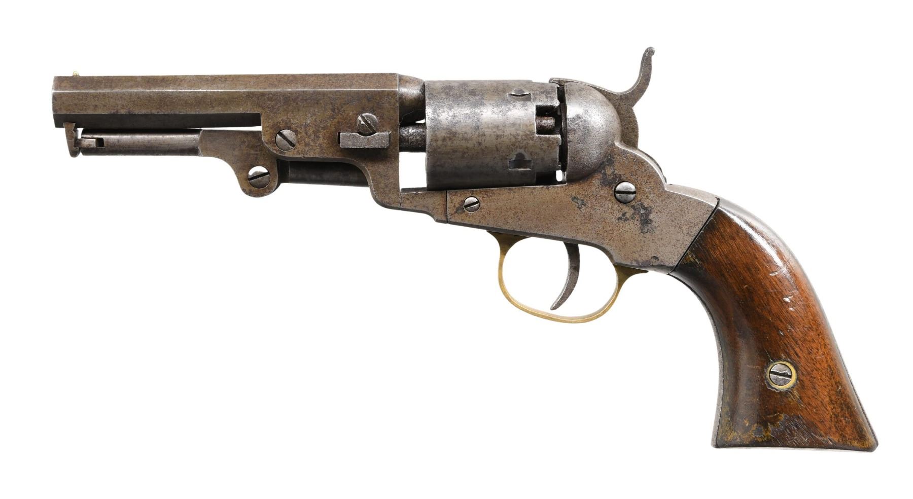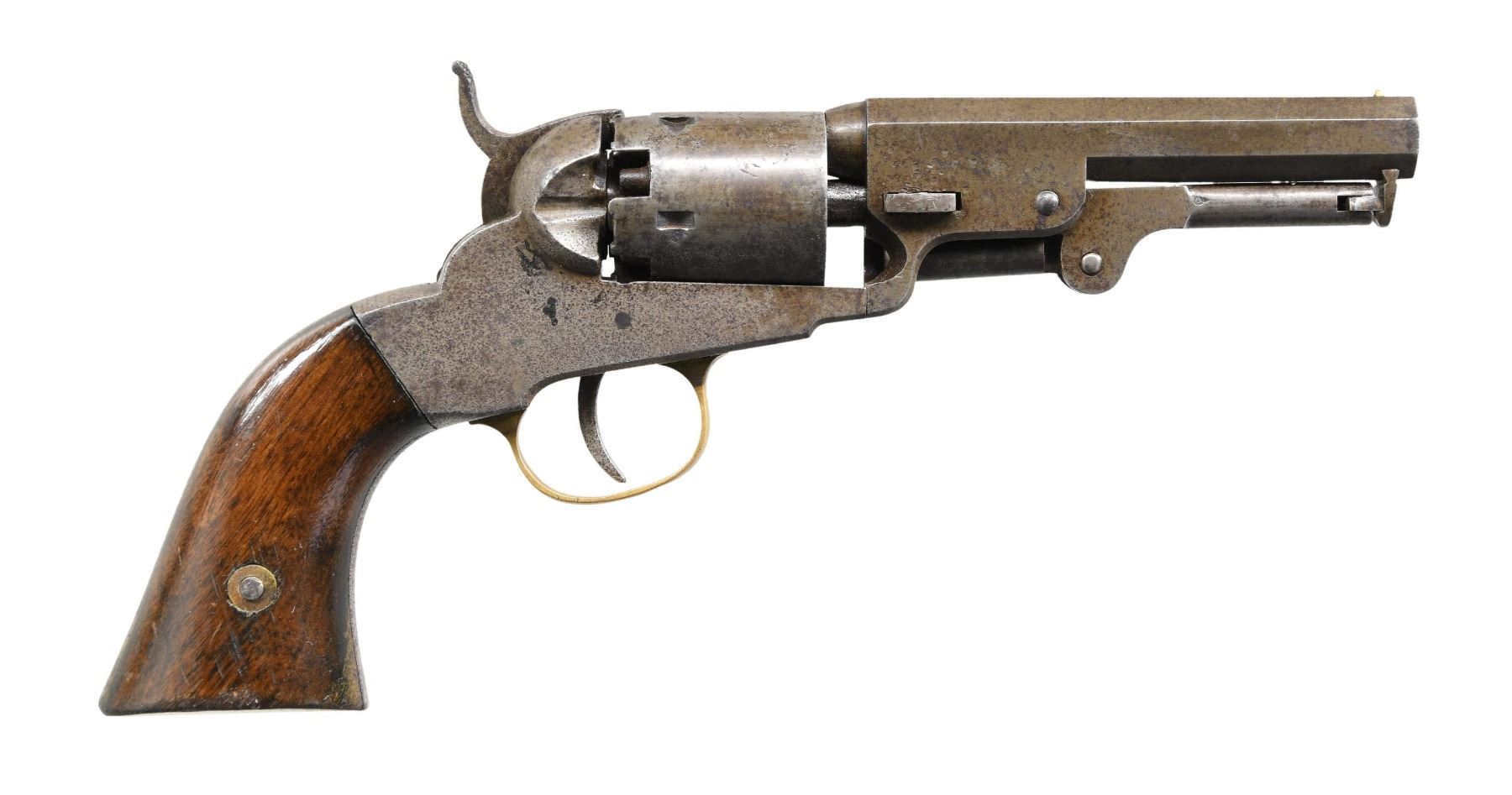 Cal. 31. SN. 814. 4" octagon w/ bead sight. 5 shot round cyl. has only 5 stops. Frame & bbl. have no mfg. markings or engraving. SN. is found on left inside of frame & inside left grip. Brass trigger guard. 2 piece walnut grips CONDITION: metal has faded to gray showing spots of light pitting. Grips show light wear w/ spots of peeling finish. Cyl. exhibits a little side play. Bore retains sound rifling w/ light pitting. (01-25532/DS). ANTIQUE. $800-1200.
