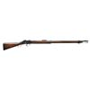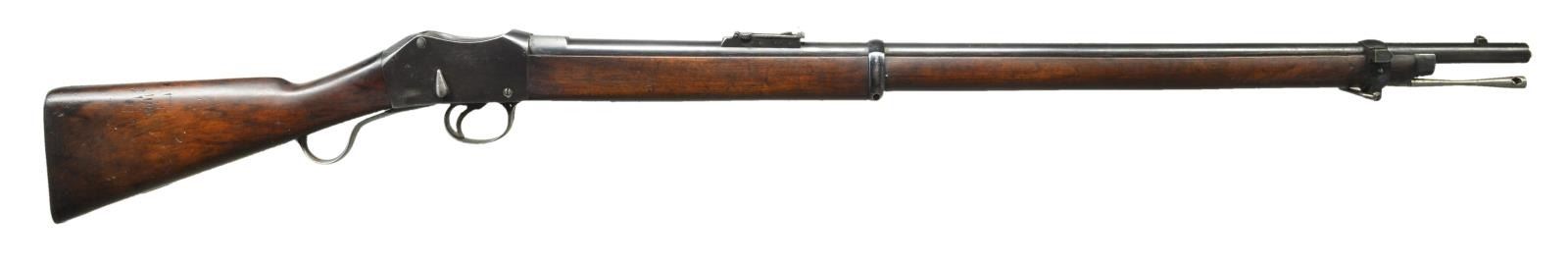 IFLE. Cal. 45 (Likely 577/450). S# 4680. Bbl. 33". Left side of bbl. has two British flag proofs, another unknown British proof & the number 52. Left side of receiver has a British flag proof & bottom of receiver is marked "4680" ahead of trigger guard. No other visible markings. Rifle is a short lever type & top right rear of receiver has a thumb cutout. Ladder rear sight graduated to 1200yds. Blade front sight. Front band w/ bayonet lug. walnut stock set w/ bottom mounted sling swivels. Ramrod present. Bottom of stock has a silver colored plaque marked "50". CONDITION: top of stock has a zig-zag crack behind receiver, stock otherwise shows scattered dings & handling marks. Metal retains 70% blue & case colors w/ the lever being a gray patina, metal otherwise shows some scattered light oxidation & scratches. Fair bore w/ some pitting patches & dried grease that may clean up better. (22-3786/MJC). CURIO. $300-500.