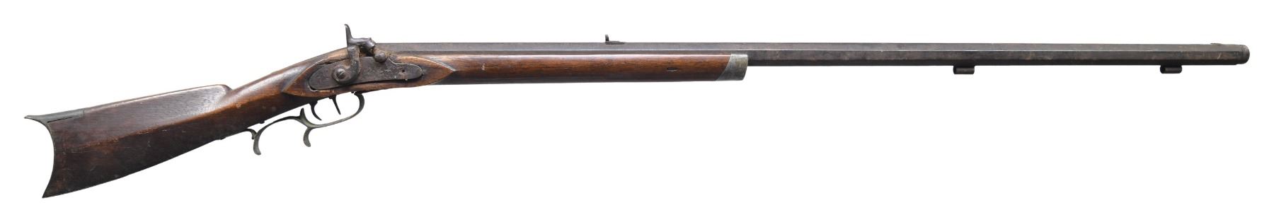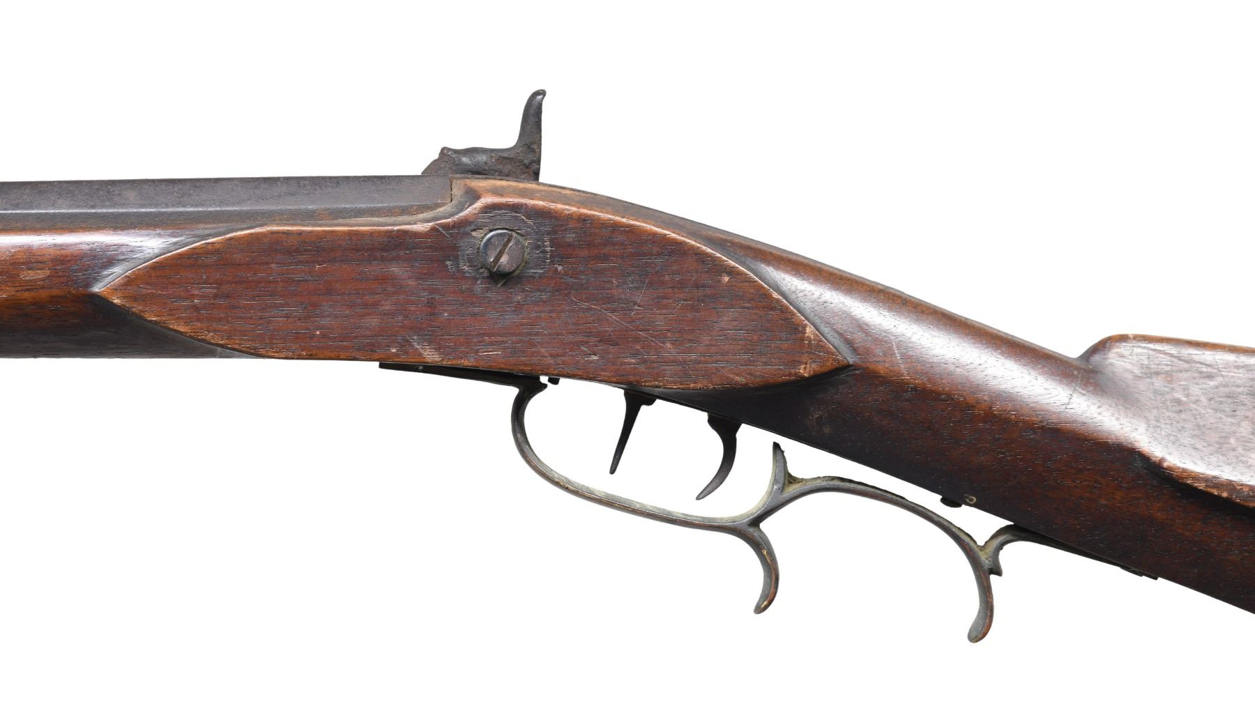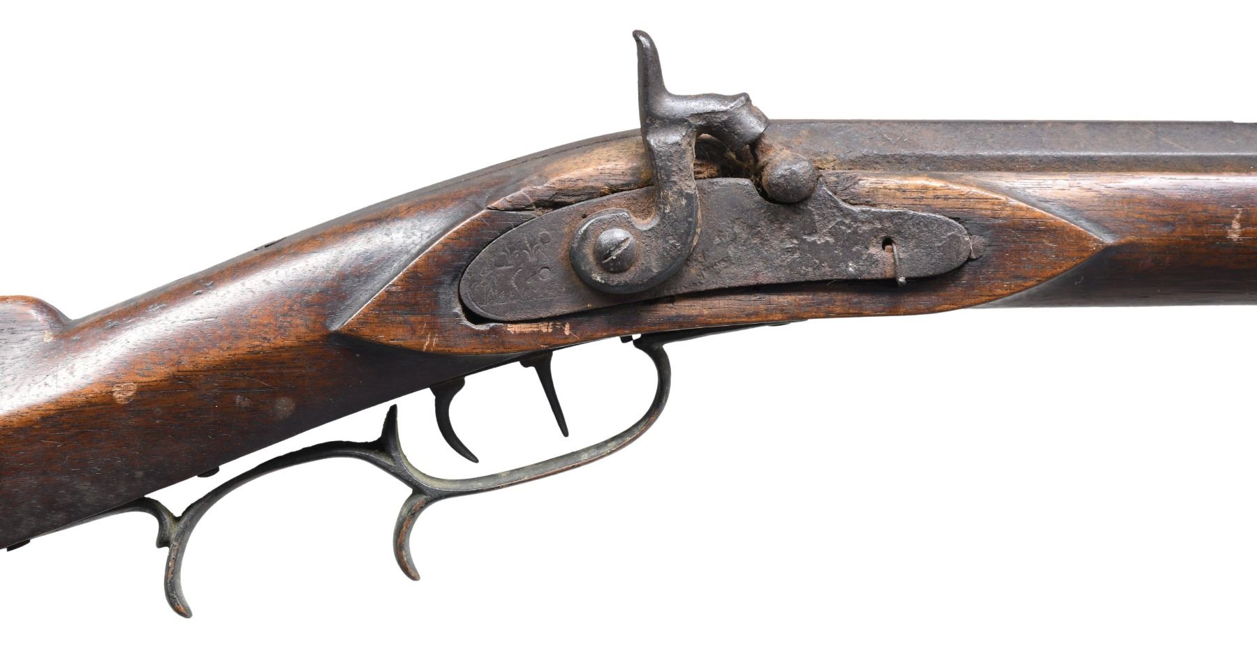 Cal. 40. NSN. Bbl. 38 3/4". No front sight present. Notch rear sight. Rear of lock has floral engraving with hunting scene but gun has no other visible markings likely due to oxidation. Double set triggers. Half length walnut stock with left side cheekpiece & pewter tip. No ramrod present but underside of bbl. has two iron pipes. CONDITION: stock shows a repaired crack above lock, another crack behind upper tang, worn finish, scattered handling wear & marks. Brass trigger guard is missing a screw with front part being cracked & loose. Lock is missing a screw & has an old nail in its place. Balance of metal is a gray oxidized patina with scattered areas of pitting. Hammer will not hold at full cock & will require attention to fix. Oxidized & pitted dark bore. (01-26999/MJC). ANTIQUE. $200-450.