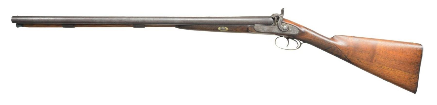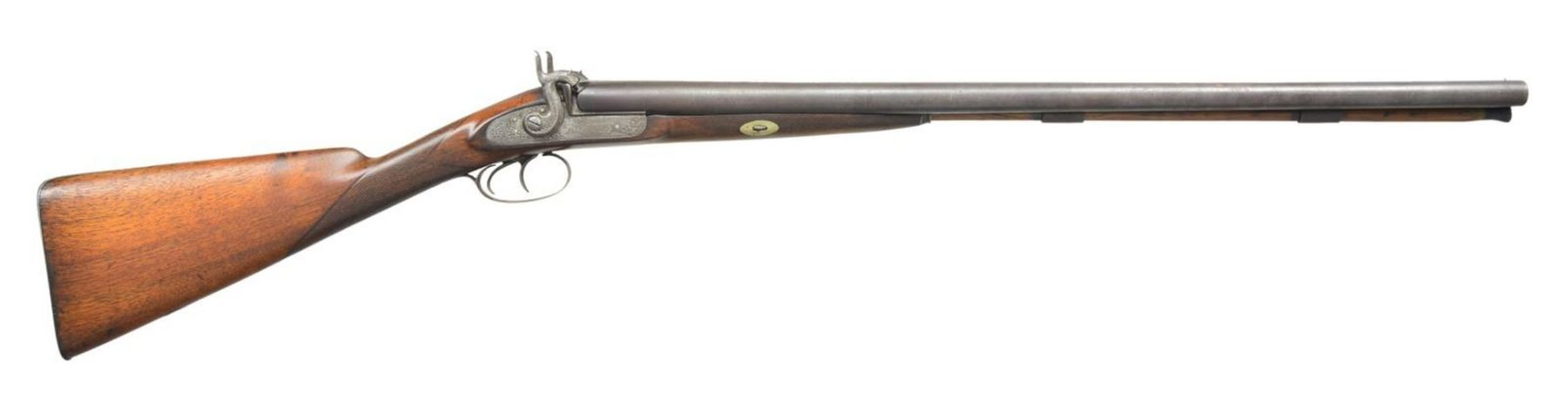 Cal. 12 Bore. NSN. Fine Damascus Twist bbls. cut to 27 1/4" w/ brass stud & cyl. bores. Hammer side locks have engraved hunting scenes accented w/ fine scroll engraving. Engraving extends to thimble, trigger guard tangs, upper tang & buttplate tang. Triggerguard bow has engrave elk in countryside scene. Wedge fastened straight walnut stock w/ checkering at wrist & forearm. German silver escutcheon plates & toeplate. Metal plate. Hardwood ramrod w/ tulip tip held by 2 plain pipes. CONDITION: fair metal turned dark patina w/ peppery oxidation. Sanded & refinished wood shows small gaps to metal, worn checkering & several 2" cracks throughout. Wedge is frozen in place. Fair bores w/ light pitting. (01-22274/MD). ANTIQUE. $200-300.