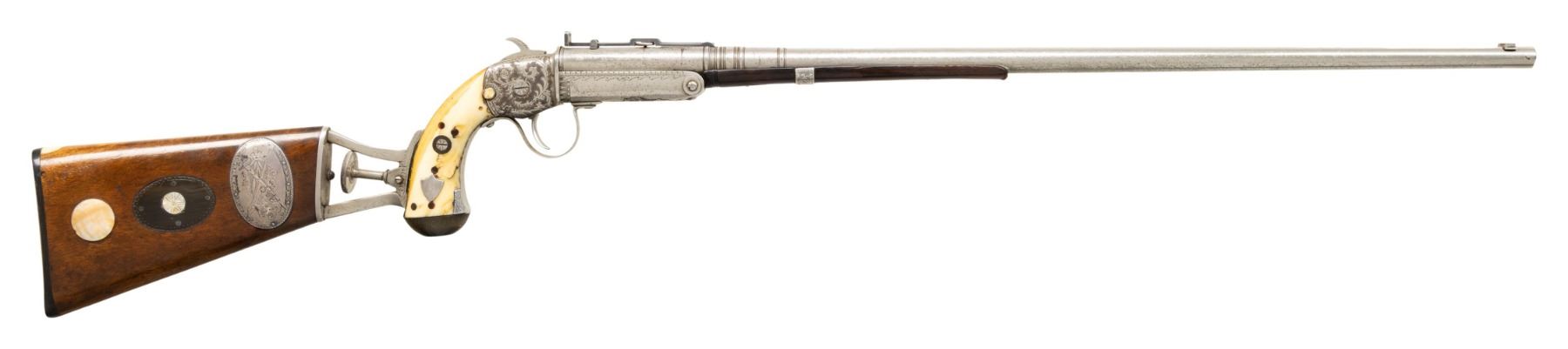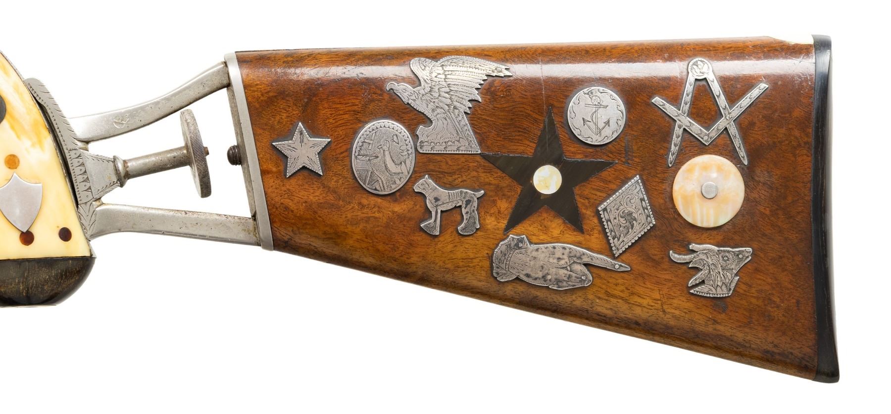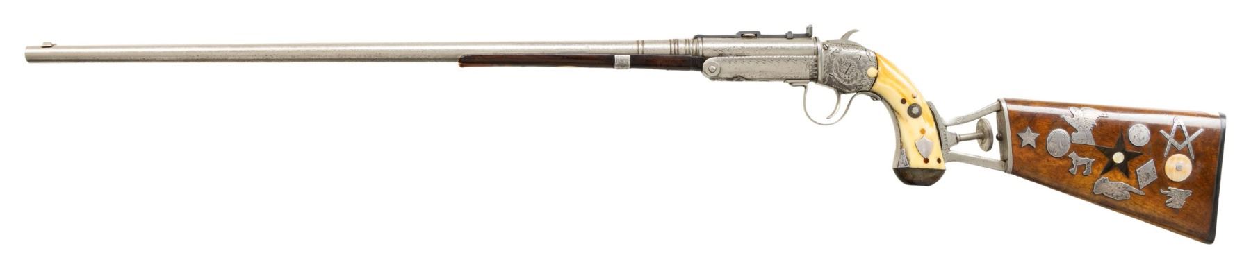 Cal. 32 CF (possibly 32 S&W). NSN. Bbl 23 7/8" tapered rnd with faceted transitions in the forearm area. Bead front sight with long wheel adjustable semi-buckhorn v-notch sight. Round body action with center mounted hammer having checkered spur. Action is released by sliding the trigger guard to the rear. Plain trigger. Action has extensive foliate scroll engraving with stippled backgrounds and fancy borders. Bbl and action are nickel finished. Walnut forearm with ivory and ebony inlays has an engraved silver band. Pistol grip stock has horn panels with ebony buttcap. Grip panels are adorned with silver shields having engraved metal panels at the heel and is pin fastened with 5 protruding horn pins. Detachable walnut stock has engraved metal yoke with large attachment disk. Right side of stock has large silver oval with crossed sword and spear through floral engraving. Midsection of stock has a horn oval with floral center. Rear portion of stock has raised circular pearl inlay. Comb of stock has a small pearl inlay at the buttplate. Left side of stock has a total of 9 silver inlays including a star, American eagle, Navy anchor, Masonic scribe, goat's head, pointing hand, dog along with oval and rectangular insets. Many of which are Masonic symbols. All are centered around an ebony star with pearl center. A pearl oval is located closer to the buttplate. LOP: 12 3/8" over a horn buttplate. CONDITION: bbl and action retain over 80% nickel finish showing scattered spotting and light corrosion. Forearm has small crack along right bbl channel. Right grip panel has small cracks around the mounting screw. Walnut stock shows scattered scratches and marks. Sound mechanics. Bright bore retains strong rifling. (01-28557/DS). ANTIQUE. $15,000-20,000.