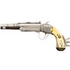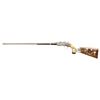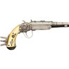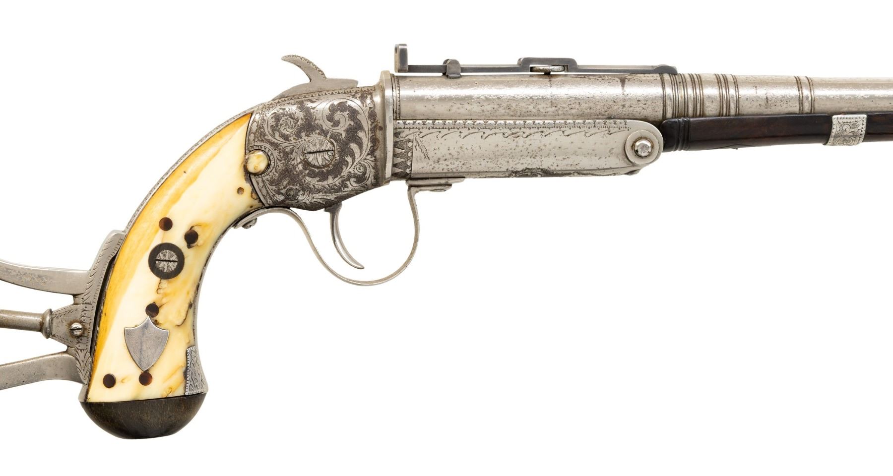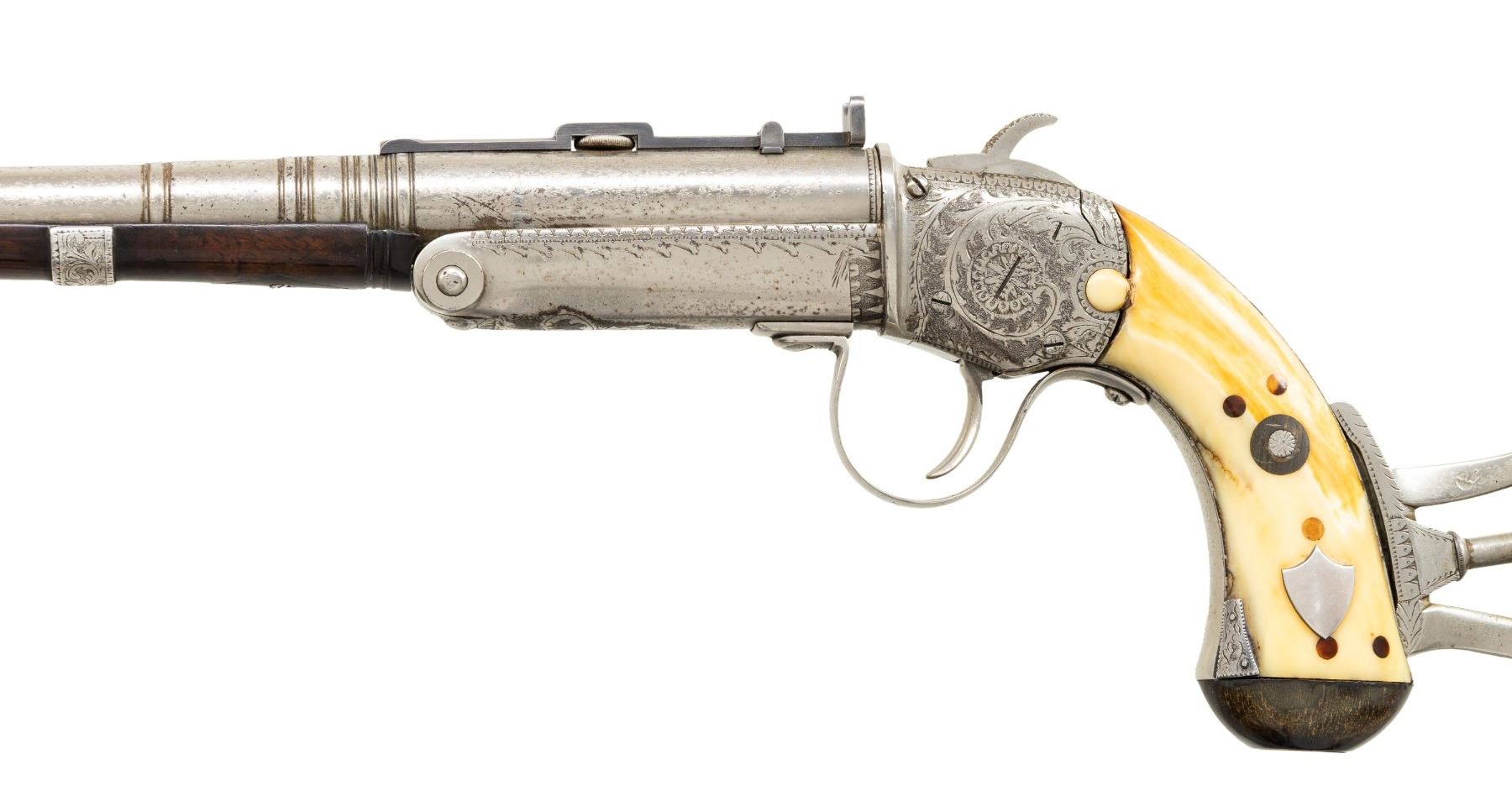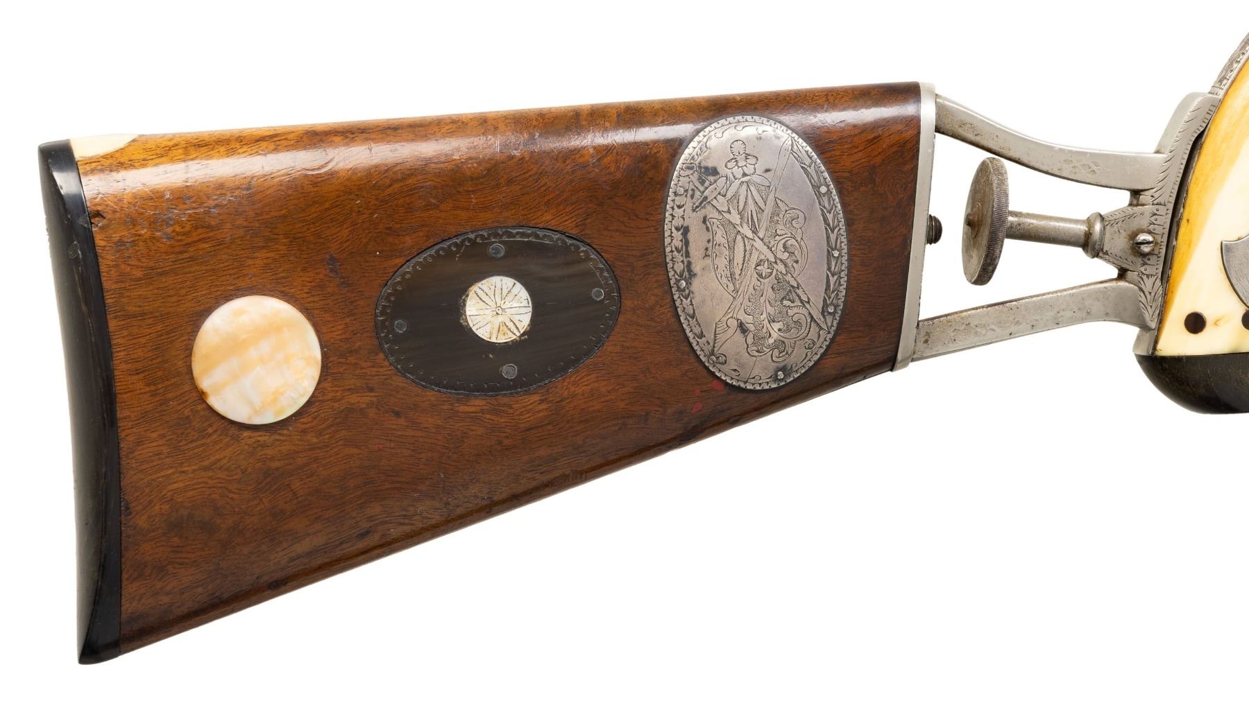 Cal. 32 CF (possibly 32 S&W). NSN. Bbl 23 7/8" tapered rnd with faceted transitions in the forearm area. Bead front sight with long wheel adjustable semi-buckhorn v-notch sight. Round body action with center mounted hammer having checkered spur. Action is released by sliding the trigger guard to the rear. Plain trigger. Action has extensive foliate scroll engraving with stippled backgrounds and fancy borders. Bbl and action are nickel finished. Walnut forearm with ivory and ebony inlays has an engraved silver band. Pistol grip stock has horn panels with ebony buttcap. Grip panels are adorned with silver shields having engraved metal panels at the heel and is pin fastened with 5 protruding horn pins. Detachable walnut stock has engraved metal yoke with large attachment disk. Right side of stock has large silver oval with crossed sword and spear through floral engraving. Midsection of stock has a horn oval with floral center. Rear portion of stock has raised circular pearl inlay. Comb of stock has a small pearl inlay at the buttplate. Left side of stock has a total of 9 silver inlays including a star, American eagle, Navy anchor, Masonic scribe, goat's head, pointing hand, dog along with oval and rectangular insets. Many of which are Masonic symbols. All are centered around an ebony star with pearl center. A pearl oval is located closer to the buttplate. LOP: 12 3/8" over a horn buttplate. CONDITION: bbl and action retain over 80% nickel finish showing scattered spotting and light corrosion. Forearm has small crack along right bbl channel. Right grip panel has small cracks around the mounting screw. Walnut stock shows scattered scratches and marks. Sound mechanics. Bright bore retains strong rifling. (01-28557/DS). ANTIQUE. $15,000-20,000.