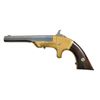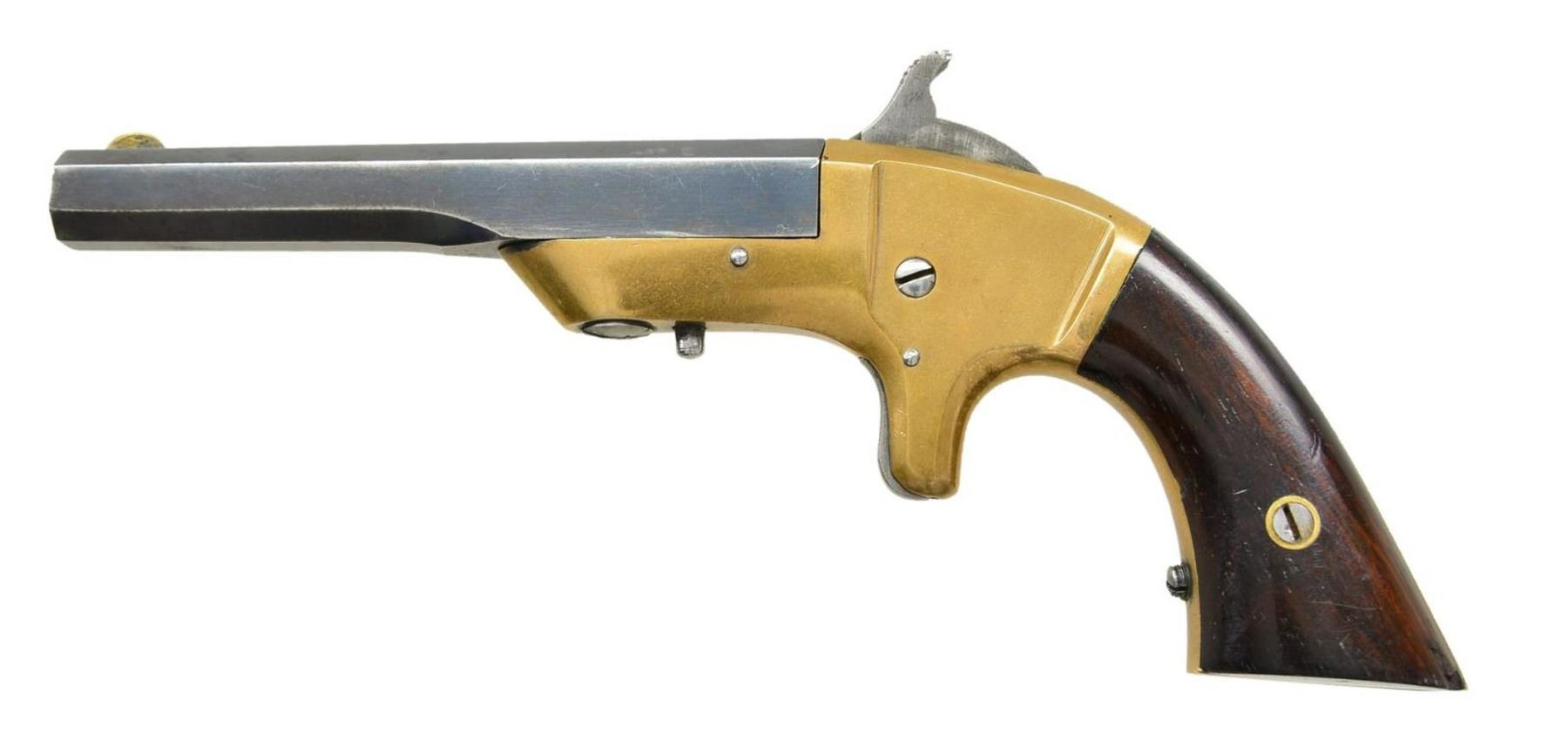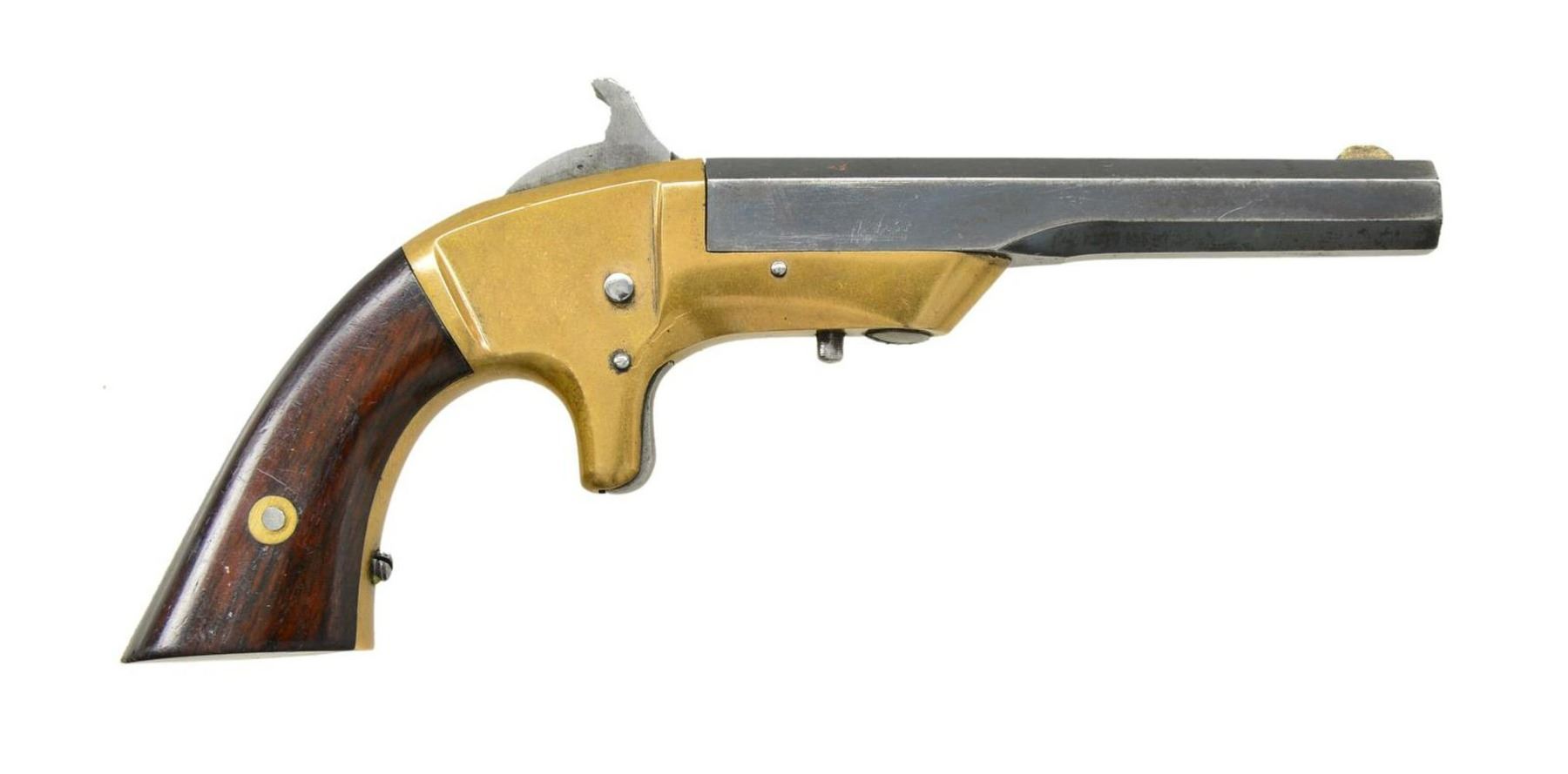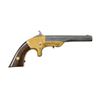 PISTOL. Cal 32 RF. S# 813. Bbl. 3 3/4” blued octagon with brass blade front sight. Rebated brass frame with spur trigger & square butt. Smooth two-piece walnut grips. CONDITION: Bbl retains good amount of factory blued finish with wear to the high edges & muzzle. Frame has a few scattered light handling marks. Good grips with small chip on left panel and a few scattered handling marks. Worn bore. (01-21565/ZAL). ANTIQUE. $150-250.