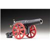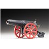 Small flint steel cannon. Cannon is virtually unmarked, save for "PA TD" at the breech area and a "3" stamped on the left side of the trail. Cast iron construction with 2 brass heads at breech. Cannon measures 9" from the muzzle to the end of the trail and approx. 3 3/8" across the ends of the wheels. Black painted exterior, with red painted wheels. Cannon appears to be missing a part/component at the trail. CONDITION: cannon retains the majority of its painted exterior, exhibiting some light wear overall. Brass fittings have acquired a pleasing mellow patina. PROVENANCE: Norman Olliff Estate. (02-25663/MLW). NON-GUN. $25-50.