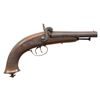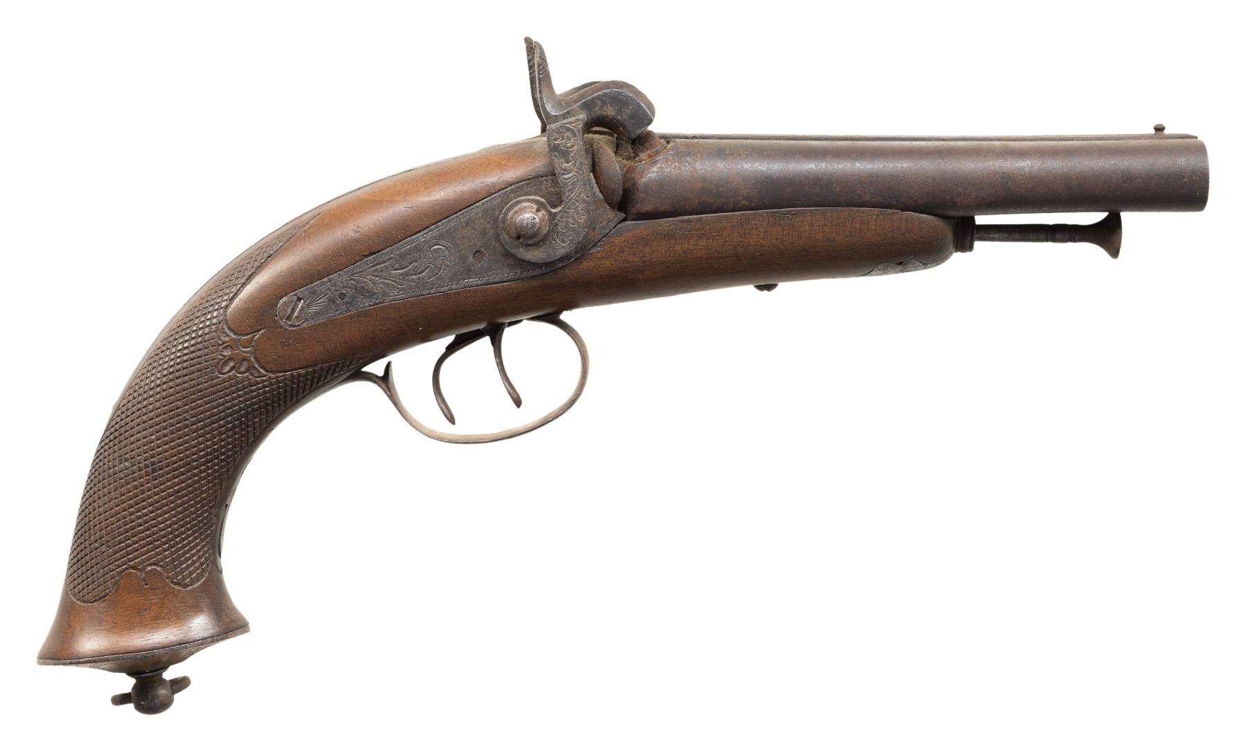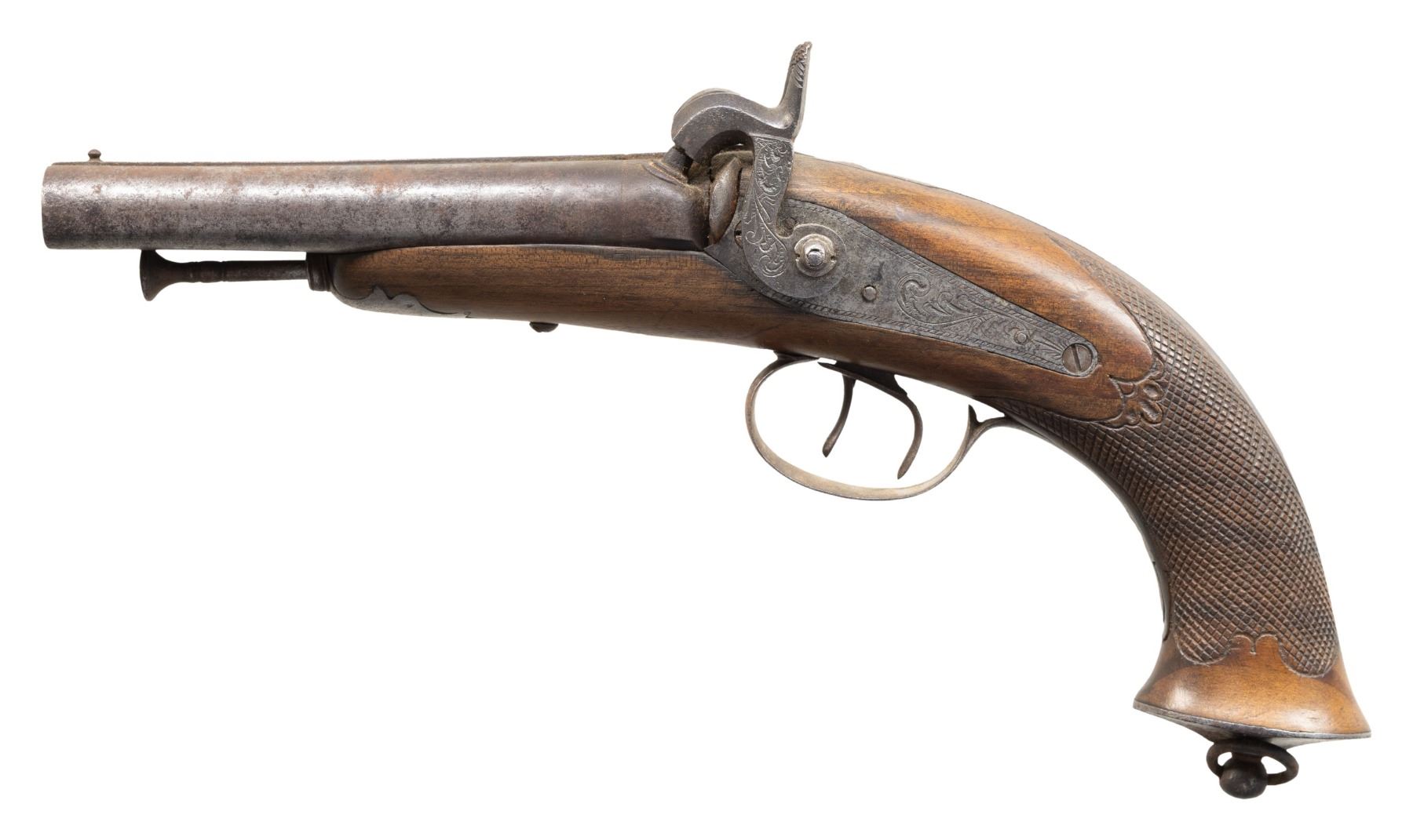 Cal. 54 Smoothbore. NSN. Bbl. 4 5/8". Unmarked SxS percussion pistol produced by an unknown mfg. Bbls. are unmarked and unproofed. Lockplates and hammers feature light foliate scroll engraving. 1-piece wood stock features wrap around checkering at the wrist, with an iron pommel cap featuring a lanyard ball swivel and ring. Brass bead front sight. Complete with iron ramrod. CONDITIONL metal components have faded to a mottled gray patina overall, with the lockplates and hammers exhibiting areas of mild pitting. Bbls. exhibit mild to moderate pitting, with scattered spots of light of mild surface oxidation. Bores exhibit consistent moderate surface oxidation. Proper manual mechanics. Stock is very good overall, with some small superficial handling marks and chips. PROVENANCE: from the renowned collection of quality sporting arms from Lewis Drake together with inventory of Lewis Drake Associates. (01-28546/MLW). ANTIQUE. $200-300.
