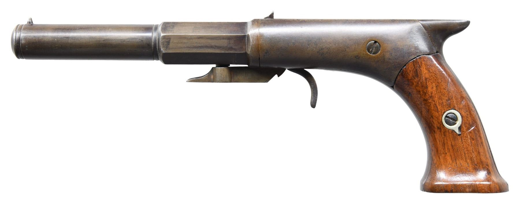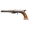 Cal. 31. NSN. An antique Anderson style percussion pocket rifle. Bbl. 4.5" oct. to round w/ faceted transitions. Cone front sight & notch rear sight. Underhammer action has flared butt w/ two piece walnut grips having flared butt. CONDITION: Metal has old brown refinished mixed with spots of blue. Fair wood with cracks & marks. Poor pitted with strong straight rifling. Lock appears functional when cycled by hand. PROVENANCE: The Esteemed Norm Greenberg Collection. (01-27649/MD). ANTIQUE. $300-500.