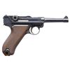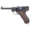 PRE-WORLD WAR I DWM "1913" DATE P.08 LUGER SEMI-AUTOMATIC PISTOL. Cal. 9x19mm. S# 263a. Bbl. 4". P.08 Luger semi-automatic pistol mfg. by DWM under contract for the Imperial German military in 1913. The bbl. extension is marked "1913" over the chamber, with DWM arsenal proofs on the right, and the S# marked on the left. Toggle is marked with the intertwined "DWM" monogram. Major metal components exhibit a rust blue finish, with some small parts exhibiting either a straw or nitre blue finish. Frame is mounted with 2-piece checkered wood grips. Standard sight configuration, with dovetailed blade front sight and V-notch rear sight. This example is unaltered, and was not returned to the arsenal to be retrofitted with a hold-open latch. All serialized parts are matching and include the frame, takedown lever, sideplate, trigger, safety lever & bar, bbl., bbl. extension, trigger bar, breechblock, extractor, firing pin, toggles, as well as the grips. MAGS: 1 wood bottom 8-rd. CONDITION: very good to fine, with metal components retaining bountiful amounts of their original rust blue finish, exhibiting some areas of light to mild wear and thinning, as well as scattered spots of light surface oxidation overall. Front grip strap exhibits mild surface oxidation, with the rear grip strap exhibiting moderate degrees of dark surface oxidation. Strawed parts show varying degrees of wear, with worn areas exhibiting a gray patina and scattered spots of age related discoloration. Mirror bore, exhibiting some very light pitting, while retaining sharp and well defined rifling throughout. Grips show mild smoothing, as well as a few scattered nicks and minor impressions from handling and storage. Wood bottom on mag. has broken, with a large section of the right half no longer being present. An exceptionally attractive, untouched, and unaltered DWM "1913" date P.08 Luger. (25-535/MLW). CURIO. $2,000-4,000.