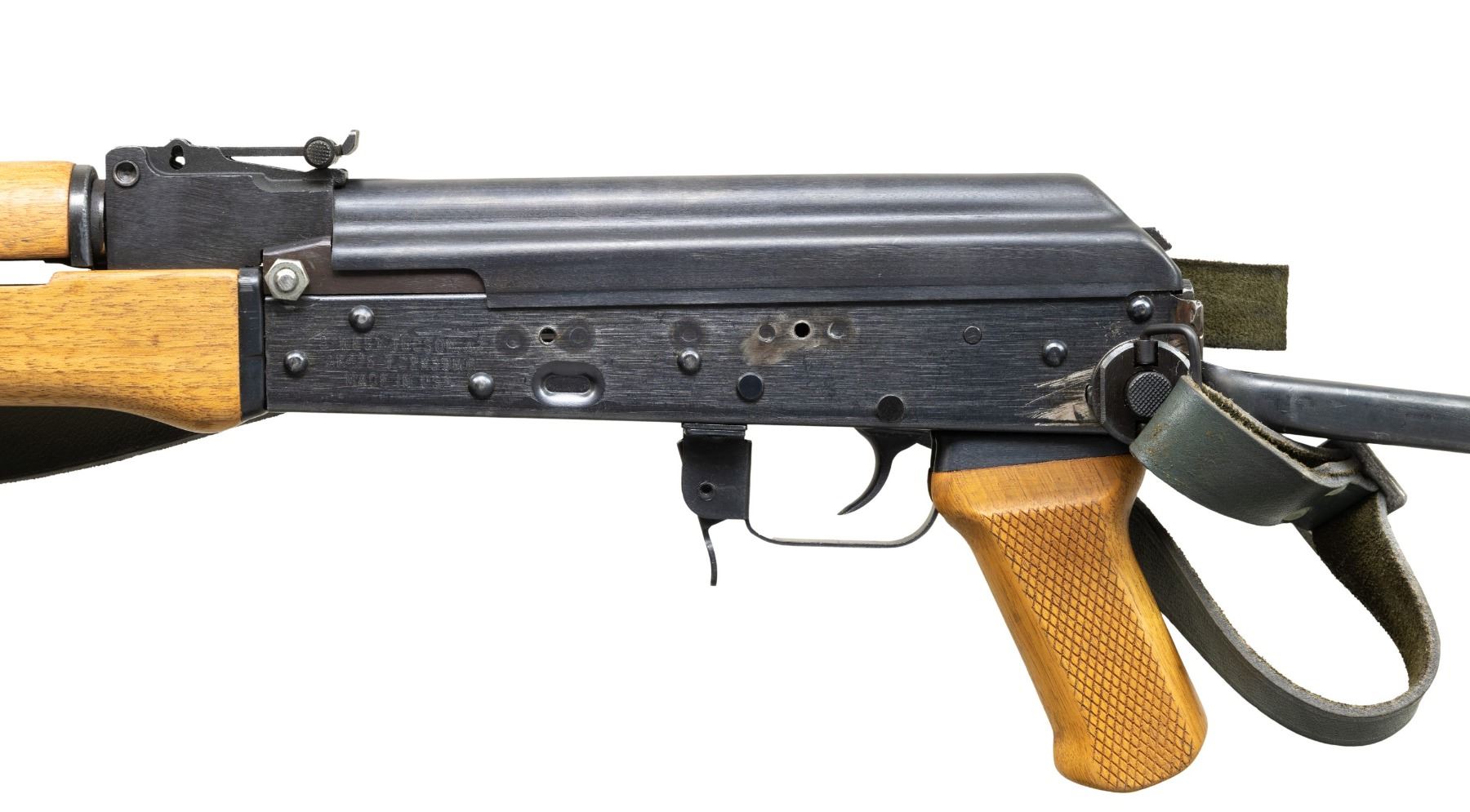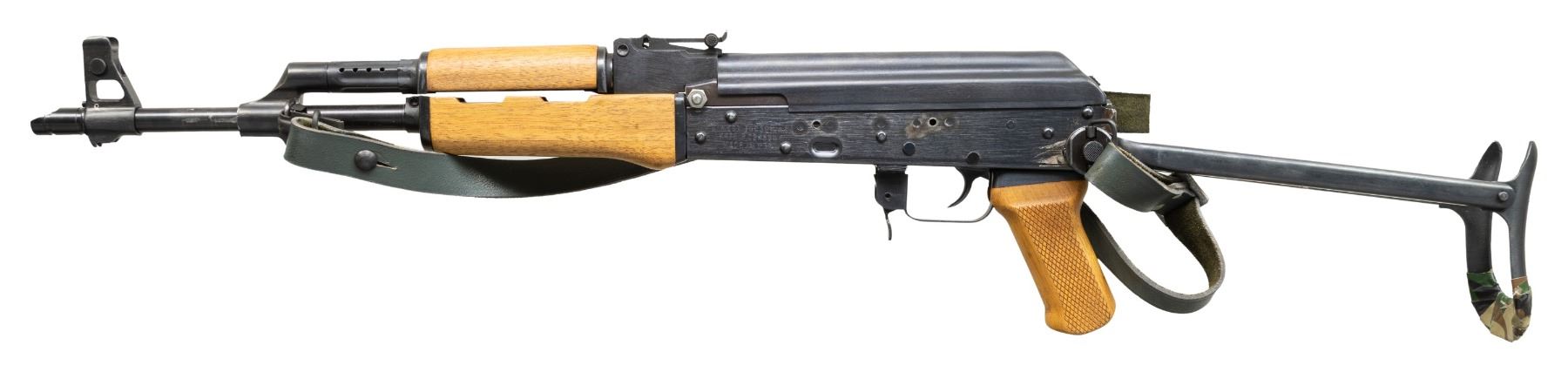 Cal. 7.62x39mm. S# 9991550. Bbl. 16 1/4". AK47S semi-automatic rifle mfg. by B-West of Tucson, AZ. Left side of the receiver is marked with B-West's mfg. information above the model and cal. designations, as well as "MADE IN USA", with the S# marked on the right. Rear flat of receiver is marked "*NMSAMA*/ NM SA MA. SAUGUS MA. EXP. SAMPLE". Metal components exhibit a blue finish overall, save for on the bolt, which exhibits a dull gray finish. Plain wood forearm and handguard, with checkered wood pistol grip and steel under-folding buttstock. Open top AK pattern post front sight with U-notch rear sight marked "D" (at lowest position) and graduated 1-8. Chrome lined bore with threaded AKM pattern slant brake. Trunnion is retained via a threaded screw and hex nut. Left side of the receiver exhibits 2 drilled holes, likely for an optic rail. Complete with gray/green leather sling. Stock does not lock in the folded position. Mag. is absent. CONDITION: metal components retain the majority of their original factory blue finish, exhibiting some scattered superficial handling marks, with a couple of areas of wear present on the bbl. and left side of the receiver, presumably from mfg./assembly. Mirror chrome lined bore, retaining well defined rifling throughout. Proper manual mechanics. Wood furniture shows a few scattered handling marks, with 2 impressions present on the underside of the forearm from the under-folding stock. (25-2958/MLW). MODERN. $800-1,200.