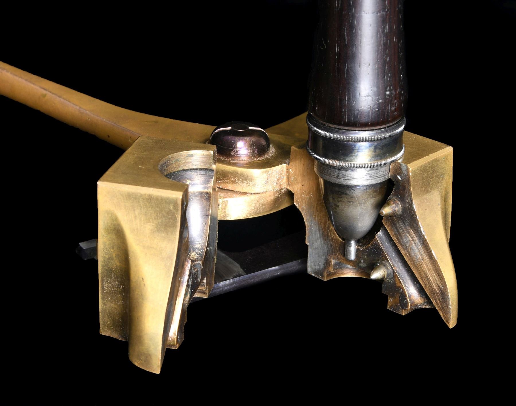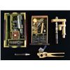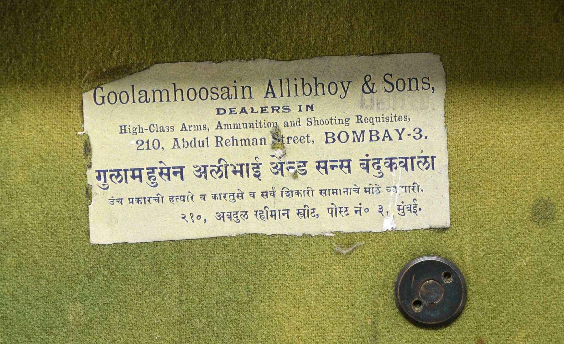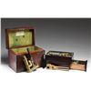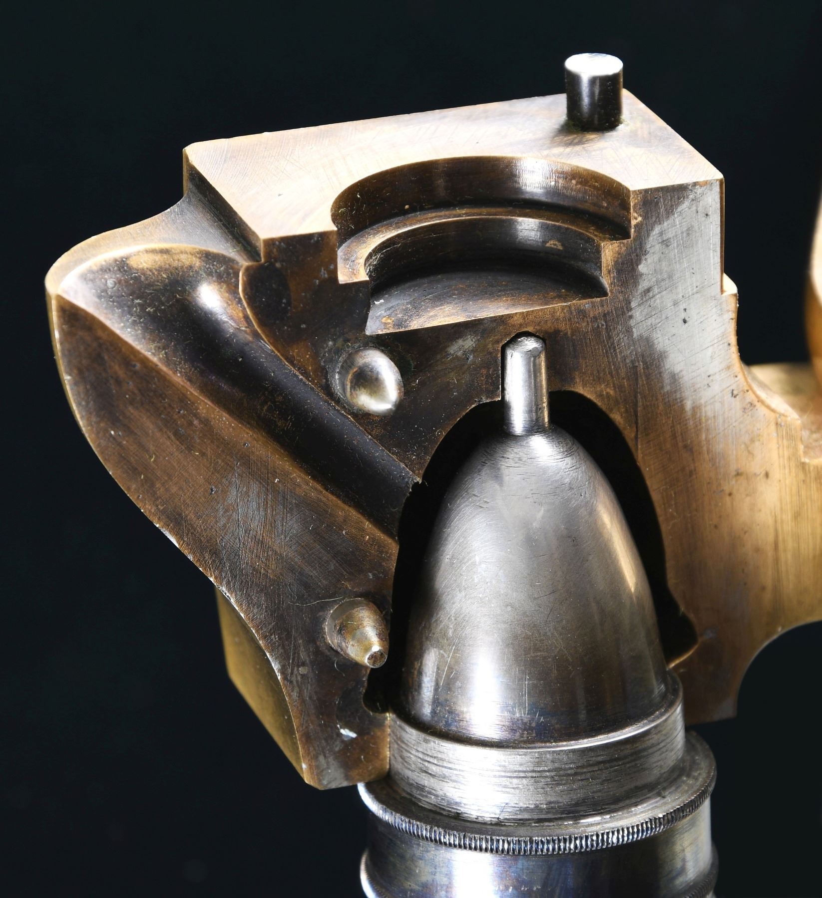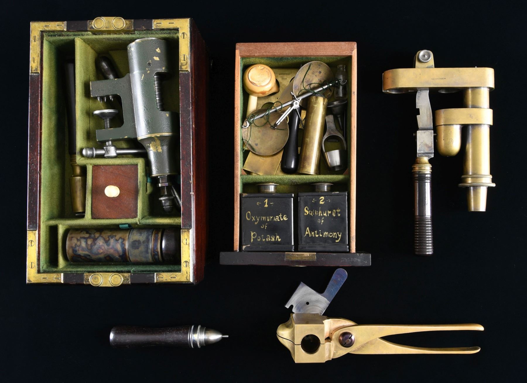 TOOLS. This interesting set of tools; some made by Greenfield of London, others by G&J W. Hawksley; are nicely organized in large 14" x 9" x 10" mahogany box with lift-out tray having drawer. The biggest hint to the use of all these tools is a large bronze side pour bullet mould by Greenfield. Mould has large ebony handled base plug that nearly fills the mould cavity resulting in a poured lead "shell" with large internal space and hollow point. Top part of mould is cut for pouring the bullet's base plug through a steel sprue cutting gate. Bullet is cast with a 1/8" skirt at bottom. Large green painted bronze bullet forming die (by Greenfield) with removable 9" handle is used to put the cast shell and base plug together. Explosive compound is then poured through hollow nose of bullet, which is then plugged. A story from the early days of African hunting tells of Sir Samuel White Baker blowing up a buffalo at 100 yds. using an explosive bullet from his 2 bore rifle. Bullet mould is housed in the bottom of the case along with very large Hawskley flip-over capper/de-capper and pin type case crimper (6" wide x 10" high). Lift out tray has spaces in its top for bullet swedging die as well as case colored cartridge case sizing die with ebony rammer and re-capping punch. Another compartment holds ebony handled brass case expander. A covered compartment holds 3 keys. Lockable draw holds 2 brass topped Japaned tin bottles; "1" painted "Oxymuriate" "of" "Potash" (potassium perchlorate) the other, "2" "Sulphuret" "of" "Antimony" (antimony trisulfate). When mixed together these chemicals produce a powerful explosive very sensitive to shock. This compound was loaded into the shell type bullets. Compartment at back of drawer contains nicely made steel balance beam scale for weighing chemicals (small weights in round wooden covered container), hippo tooth small mortar marked with Bombay merchants name and pestle for mixing chemicals, a small steel funnel for pouring chemical into nose of bullet, a small glass bottle, grease wad plate and brass cutter by Greenfield, a Hawksley 4 bore wad cutter, a primer pocket reamer with ebony handle and a loaded 4 bore cartridge. Case is ruggedly made and has dual hook closure and inset circular "D" ring handle in top. Case is lined in green cloth and a label for Bombay gun dealers "Goolamhoosain Allibhoy & Sons" (matching name on bottom of mortar) in lid. CONDITION: very fine retaining over 80% original finishes. Case has most of what appears to be original finish with marks and scratches. Interior is good. A really neat artifact from the days of the Raj. (02-24293/MGM). $4,000-6,000.