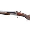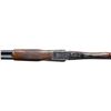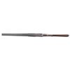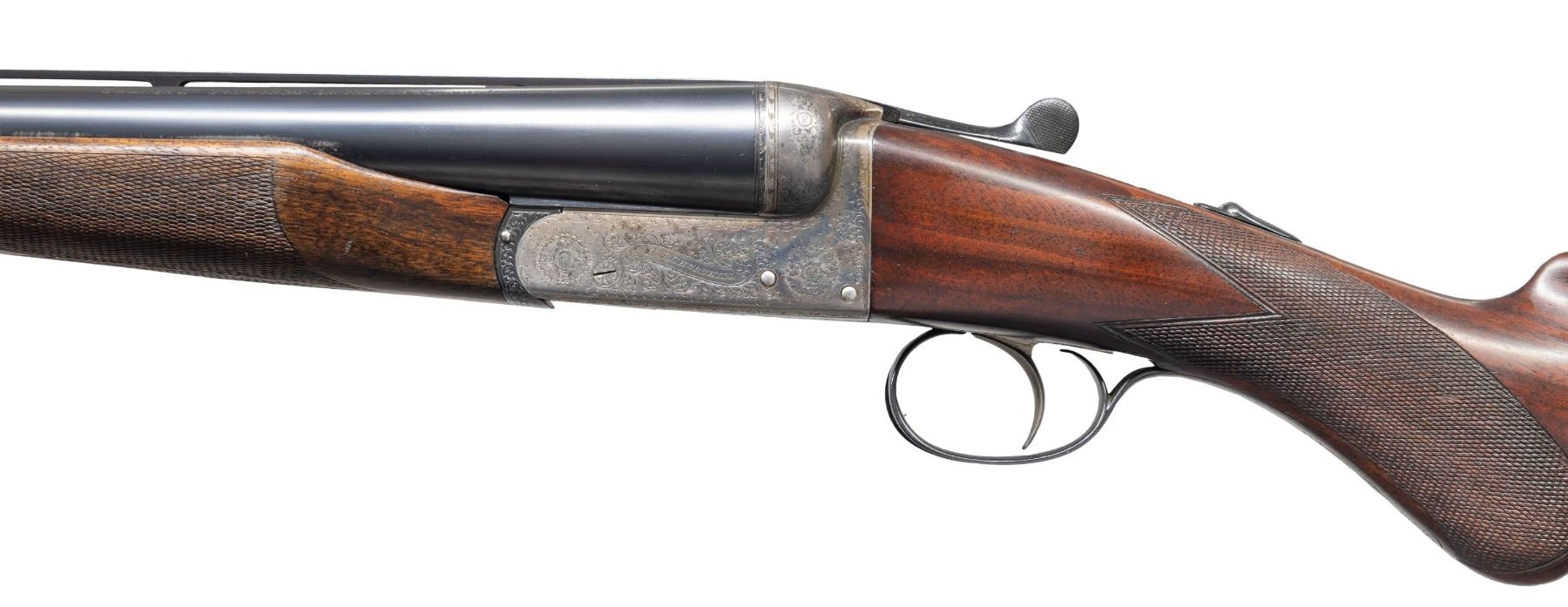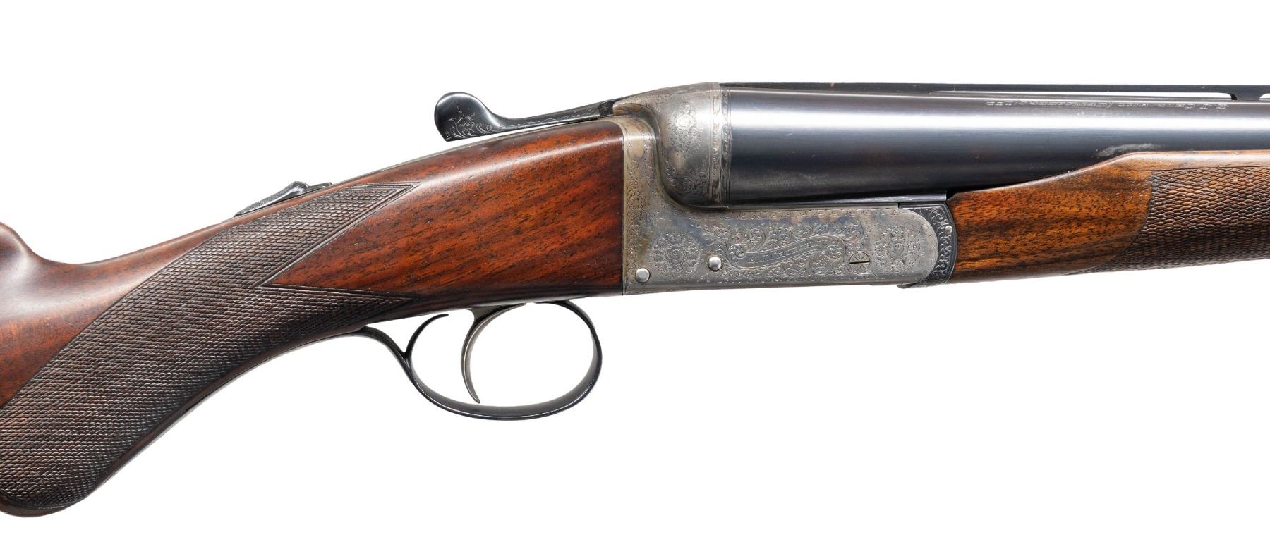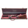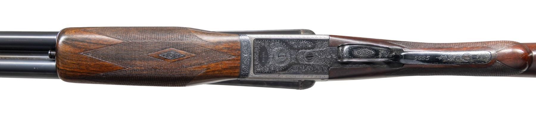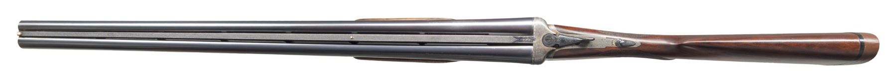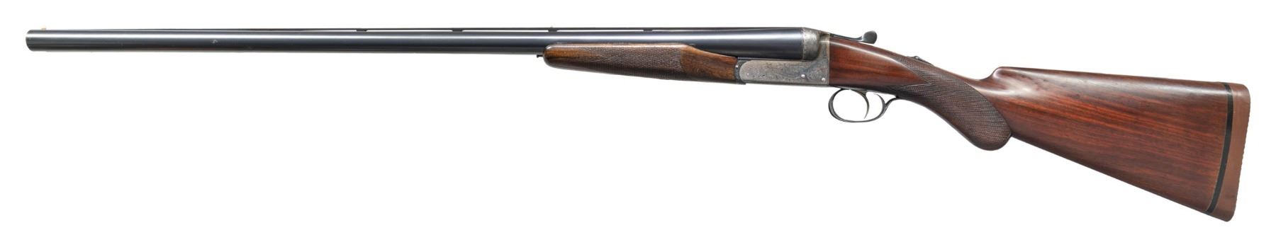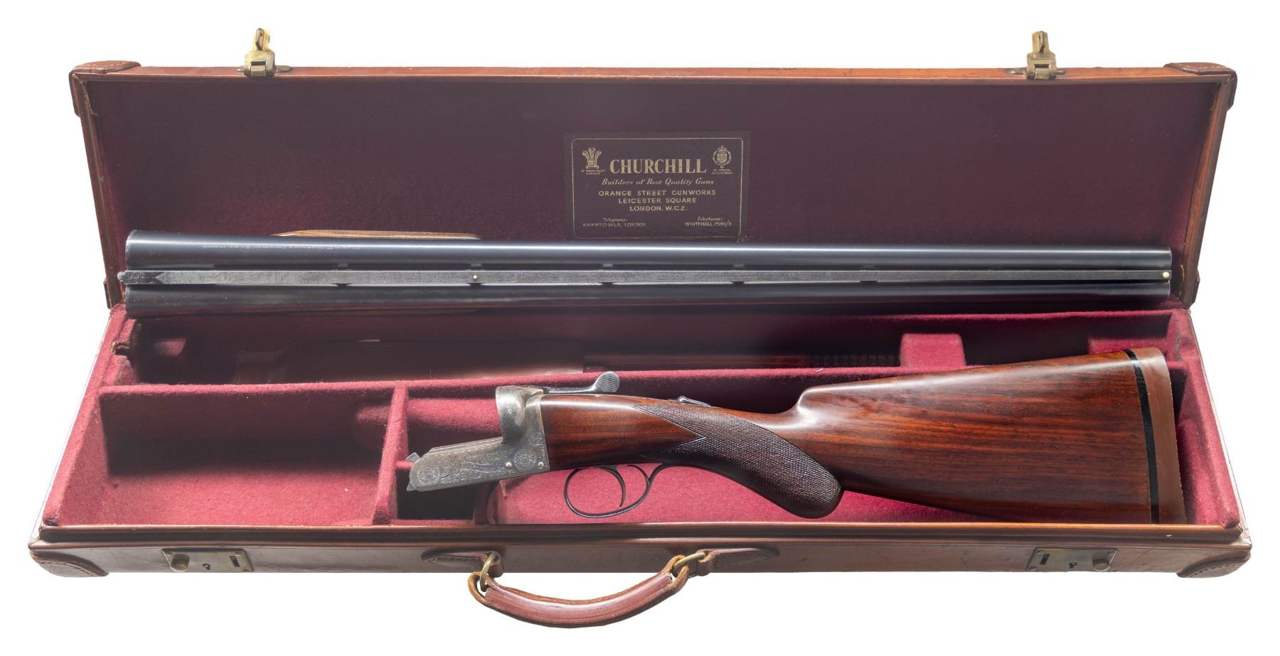 BOXLOCK EJECTOR SINGLE TRIGGER VENT RIB BEAVER TAIL PIGEON OR TRAP GUN WITH CASE. Cal. 12 Ga. 2-3/4". S# 6885 (1962). The 28" dovetailed barrels with matted ventilated rib are engraved "E.J. Churchill (Gunmakers) Ltd" "Orange St. Gunworks Leicester Square. London." on tops. Barrel flats are stamped with London nitro proofs for 2-3/4" chambers. Case hardened boxlock action has automatic safety, sliding third fastener which engages short rib extension and single non- selective trigger. Action is engraved with 70% coverage rose and scroll with "E.J. CHURCHILL" in ribbon on each side. Blued floor plate is engraved "Regal". Double beaded small bow trigger guard has S# on tang. Nicely streaked dense European walnut round knob pistol grip buttstock measures 14-1/8" over solid brown basket weave pad. Point pattern checkering is at grip. Matching short beavertail ejector forend has Anson release. MEASUREMENTS: BBLS: Bore Diameter: L .727. R .727. Restriction: L .020 (mod). R .010 (IC). Wall thickness: L .030. R .034. STOCK: DAH: 2-1/16". DAC: 1-7/16". CAST: neutral. LOP: 14-1/8". WEIGHT: 7 lb. 12 oz. UNATTACHED ACCESSORIES: gun is housed in its original leather "VC" case with stitched leather corners. Interior is lined in burgundy cloth and has burgundy Churchill label in lid. Case contains two piece brass and walnut cleaning rod. CONDITION: very fine as mostly refinished. Barrels retaining nearly all of a professional re-black with subsequent silvering on rib and sides from contact with forend. Action retains most of its original case hardening color with some cleaned stains. Top lever, forend iron, floor plate, trigger plate and trigger guard re-blued and retain nearly all of that blue. Engraving slightly softened. Stocks retain nearly all of an older oil refinish with some scattered subsequent marks. Bores are bright and shiny. Action is tight. Ejectors are in time. Mechanical three pull trigger is good. Case leather has considerably darkened and has many stains. Interior cloth is good with some rubs. Label is very fine. A good solid gun configured for the American market. (25-5636/MGM). CURIO. $3,000-5,000.