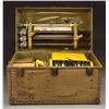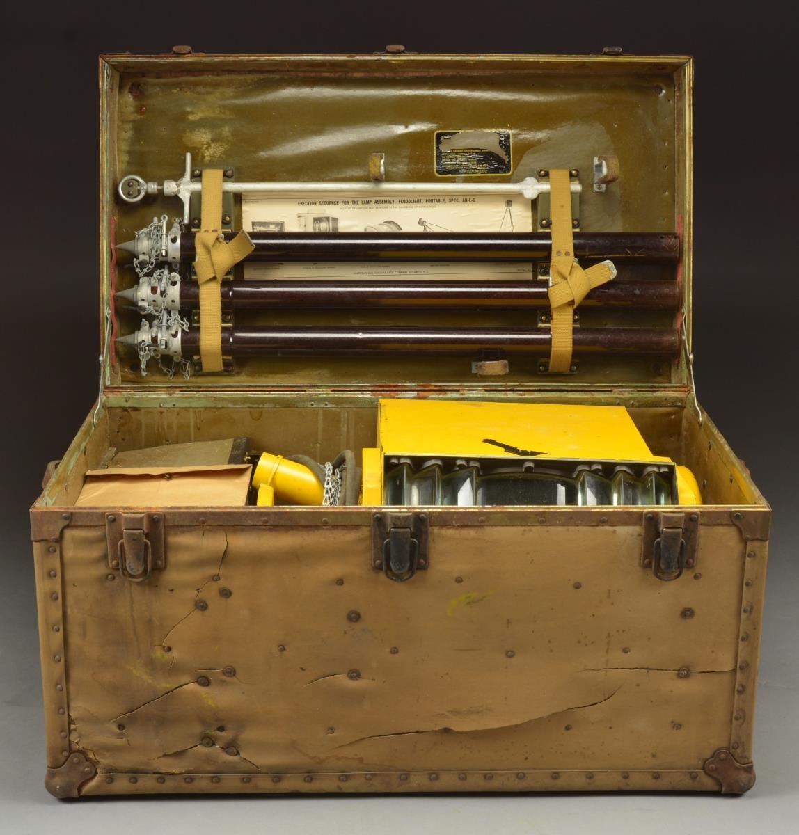 WITH ACCESSORIES & TRUNK. These lights were intended for the illumination of landing areas at temporary airfields & other purposes. The 110 volt lights were designed to illuminate an area of 90 degrees by 2,000 feet. Lights are made w/ a very high quality lens which resembles a lighthouse lens & is assembled in replaceable segments. Each trunk is designed to hold a complete floodlight assembly w/ its 3 adj. legs, anchor devices & spare bulbs but requires the use of a separate electric power plant. Mfg. by The American Gas Accumulator Company of Elizabeth, N. J. Instruction manual is dated November 1942. Trunk measures approx. 37" X 21" X 20". Trunk contains 3 adj. poles. Yellow painted floodlight assembly. Instruction manual. 6 Spare bulbs, canvas anchor bags & anchor rod. CONDITION: tan colored trunk has extensive wear, light oxidation & tears in outer covering. Contents although untested appear to be in serviceable condition. Lens appears intact. (02-16090-1/RW). $800-1,200.