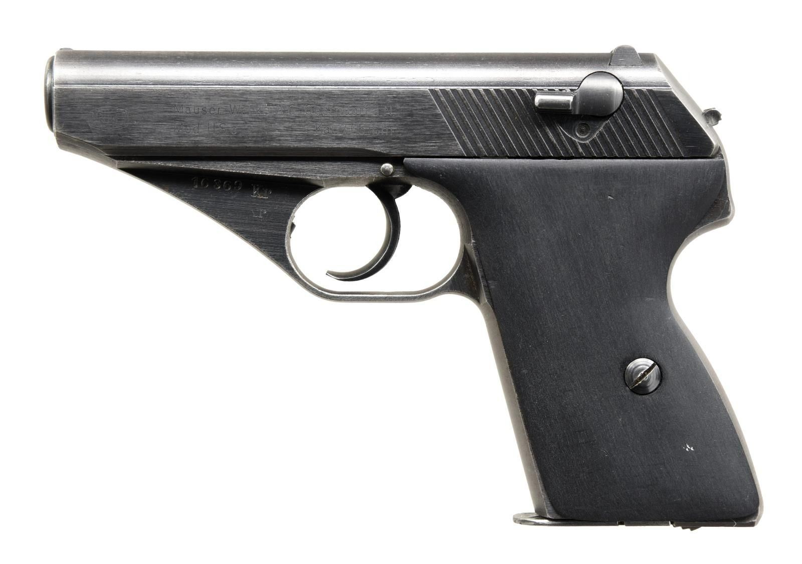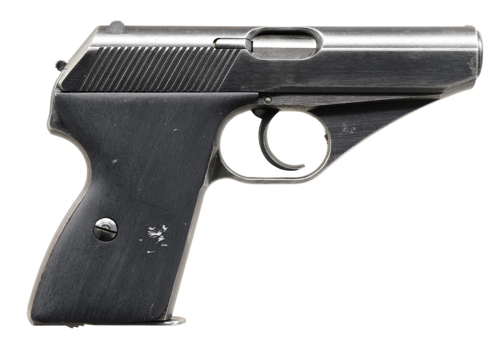 Cal. 7.65mm (32 ACP). S# 16369. Bbl. 3 1/4". Blade front sight. Fixed rear sight. This highly unusual HSC falls well below the accepted serial range for any pistol. The gun is only serialized on the left front of trigger guard & other parts including front strap appear unnumbered. Left & right of trigger guard marked "Kr". Right side of bbl. & front right of frame have unusual eagle "N" proofs. Blue finish. Smooth black grips. MAGS: 1-7 rd. UNATTACHED ACCESSORIES: aftermarket soft case. CONDITION: grips show some dings & handling wear. Metal retains 50% arsenal grade reblue finish w/ scattered fading to gray, edge wear & some light pitting. Very good bore. (23-2713/MJC). CURIO. $300-400.