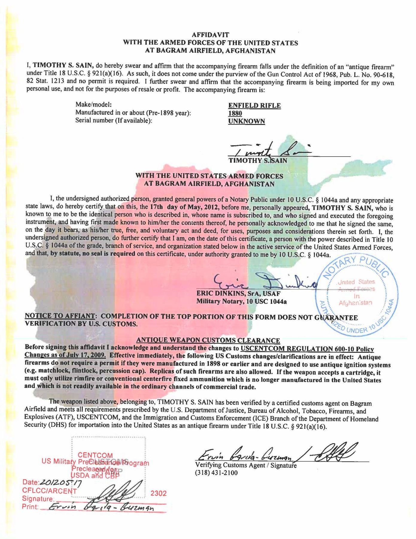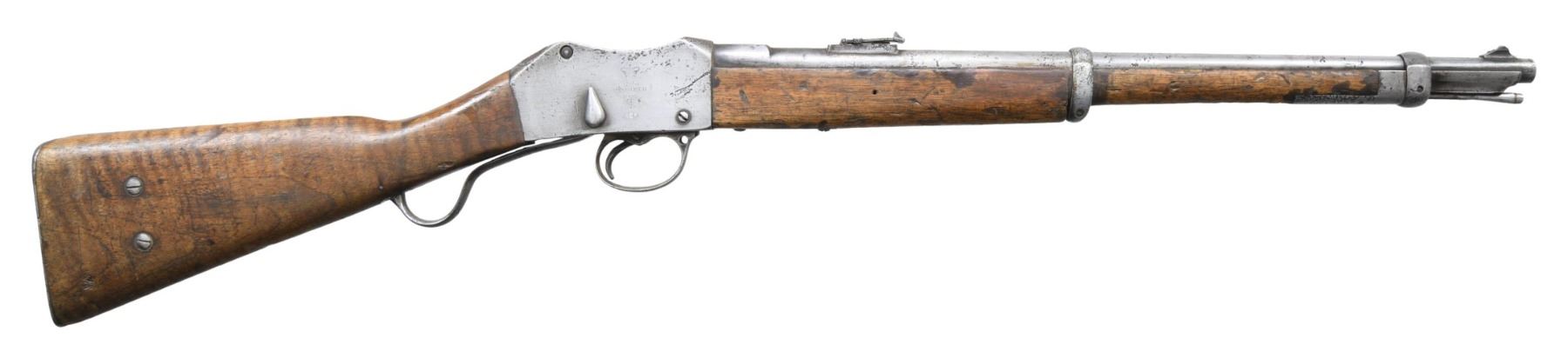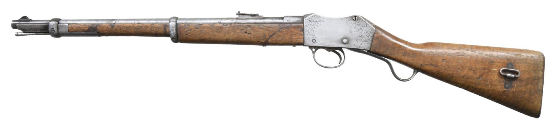 Cal. 577-450 Martini. S# 08435. Bbl. 21". Ramped blade front sight. Ladder rear sight graduated to 900yds. MKI ICI Martini Henry carbine. Left side of action marked with British crown over "VR/ENFIELD ENFIELD ICI". Walnut stock set with faint roundel on right side of butt & two screws around roundel. Rear sling swivel present on left side of butt. UNATTACHED ACCESSORIES: US-Afghan War bringback paper dated May of 2012 from Bagram Air Force base. The paperwork states this carbine is indeed an antique & was verified so at Bagram AFB. CONDITION: stock set has a worn appearance with scattered staining, dings & handling marks. Rear sight is bent. Metal is an overall cleaned silvery-gray color with scattered pitting, scratches, oxidation & handling marks. Action appears functional when hand cycled. Bore shows scattered frosting & moderate pitting but evident rifling. (01-27197/MJC). ANTIQUE. $400-600.