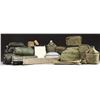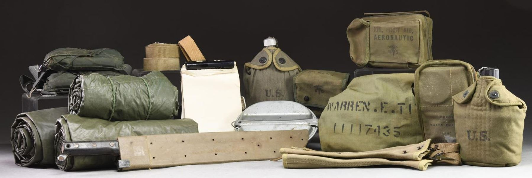 This varied lot includes 1 red & yellow guidon for Company H of the 9th Air Defense Artillery. / 1 OD burlap bag. / 2 WWII canteen with covers. / 1 OD sling. / 1 Machete & scabbard marked “ONTARIO KNIFE CO U.S.”. / 3 Waterproof shelter halves. / 1 LPU-2P PNEUMATIC UNDERARM LIFE PRESERVER. / 1 Herringbone weave OD duffel bag. / 1 Aeronautic first aid kit in OD pouch. / 1 Small first aid kit with belt attachment. / 1 OD knitted scarf. / 1 Blue bag marked “American Red Cross Convalescent Kit”. / 1 Water purification kit with pouch. / 2 WWI ankle wraps. / 4 Khaki cotton web uniform belts. / 1 OD drawstring bag. / 1 OD long bag. / 1 WWII era mess kit. / 1 Compass in an OD pouch. / 1 Troop & Turret Gunner's safety belt. / 1 Pair of OD WWII puttees. / 1 Khaki duffel bag. / 1 Pilot's leg writing tablet. / 1 OD pouch. CONDITION: all items show light overall wear. Mess kit has some oxidation. (02-20931/BF). $300-500.