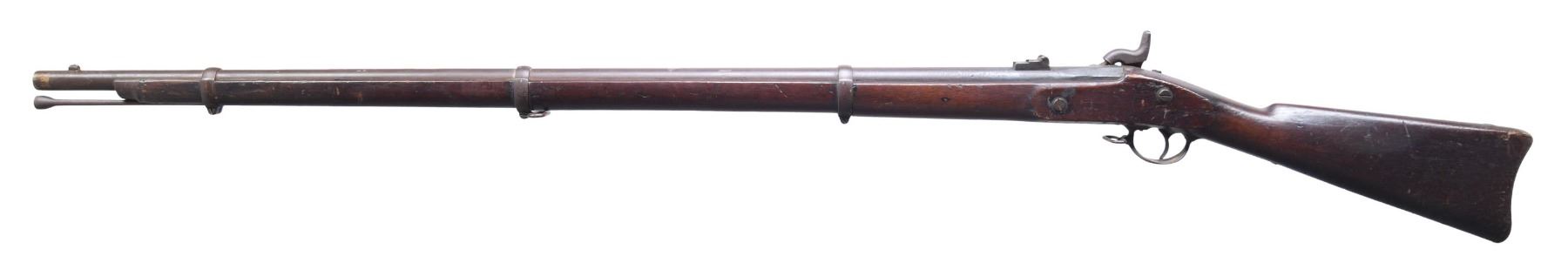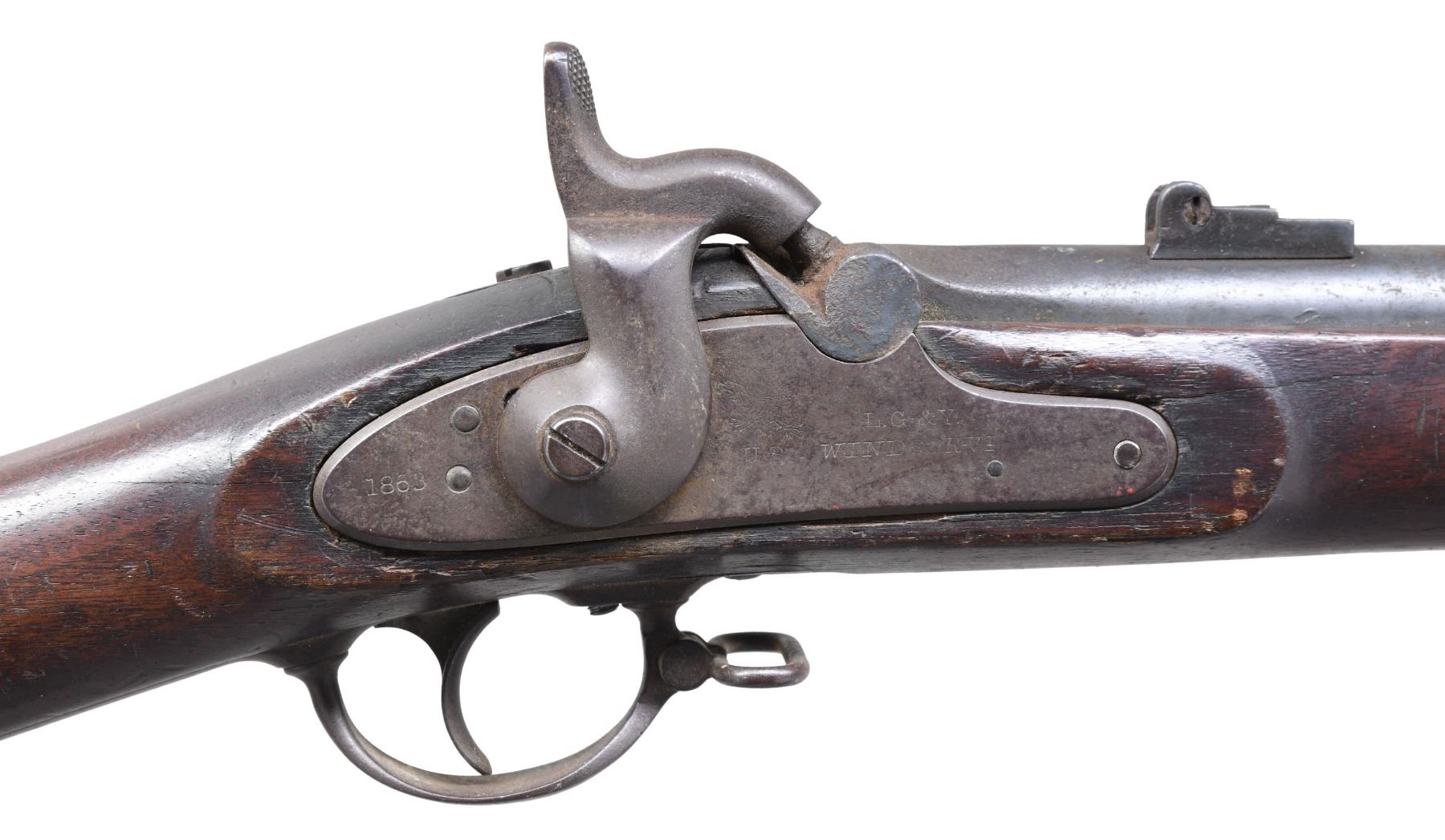 MODEL 1861 MILITARY SINGLE-SHOT RIFLED MUSKET. Cal. 58. NSN. Bbl. 40". Approx. 50,000 of these rifles made in Windsor, Vermont were delivered to the United States government between 1861 & 1864. Bevelled lockplate is marked "1863" at the tail & "spread wing eagle / US / L.G-&Y / WINDSOR-VT.". Bbl. is dated on top of breech "1863". "VP / eagle head" proof is found on left side of breech. Breech plug tang has "33". Flip type rear sight graduated to 500 yards. Stud type front sight. No cleanout screw is provided. Buttplate is marked "US". Tulip-shaped ramrod w/ dished face. Walnut stock marked on left panel w/ legible acceptance cartouche. Forend held by three clamping bands. The sling swivels are carried on the middle band & trigger guard bow. UNATTACHED ACCESSORIES: 18" triangular blade socket bayonet marked "US" on the face. S# is "4012" on neck. Clasp is present. Bayonet has traces of original bright finish turning an overall worn gray & patina. CONDITION: well-worn stock has original finish w/ the wear & handling marks expected from long service. Notable 2" cracks ahead of & behind lockplate. Lockplate does not seat fully at the rear. Metal has turned overall patina w/ light oxidation & fine shallow pitting throughout. Bore is dark w/ a worn oxidized appearance, but lands are still prominently visible. (01-26340/RW). ANTIQUE. $500-800.