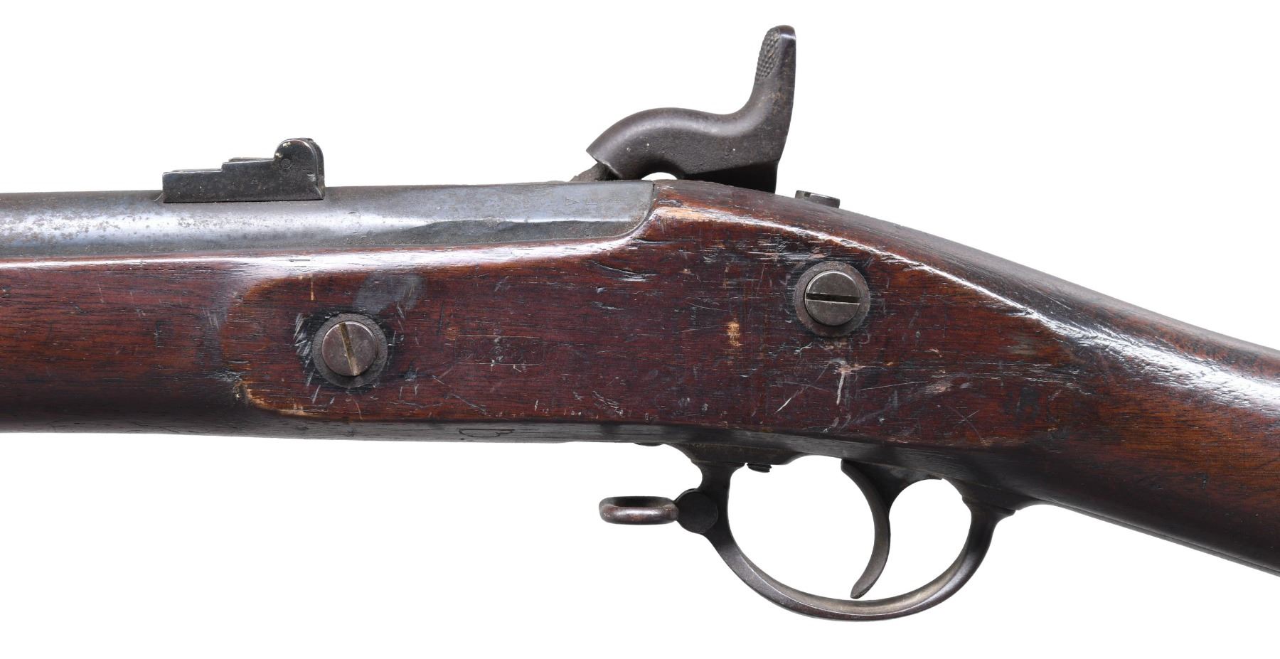 Fair: Little to no original finish, minor or small major parts replaced, light to moderate pitting externally, functional mechanics, fair bore with heavy pitting but visibly rifling. Poor: No original finish, possibly some major parts replaced, loose but functional mechanics, active or heavy external rust, poor bore with heavy pitting and little or no rifling visible.