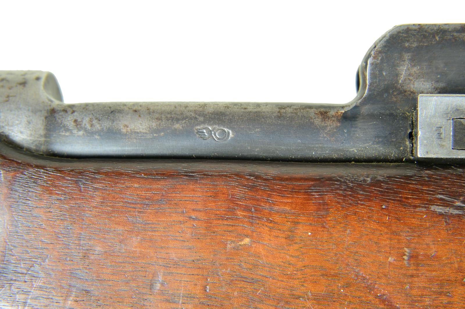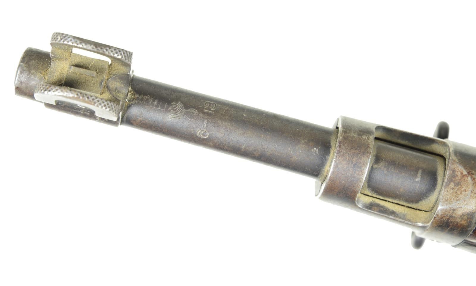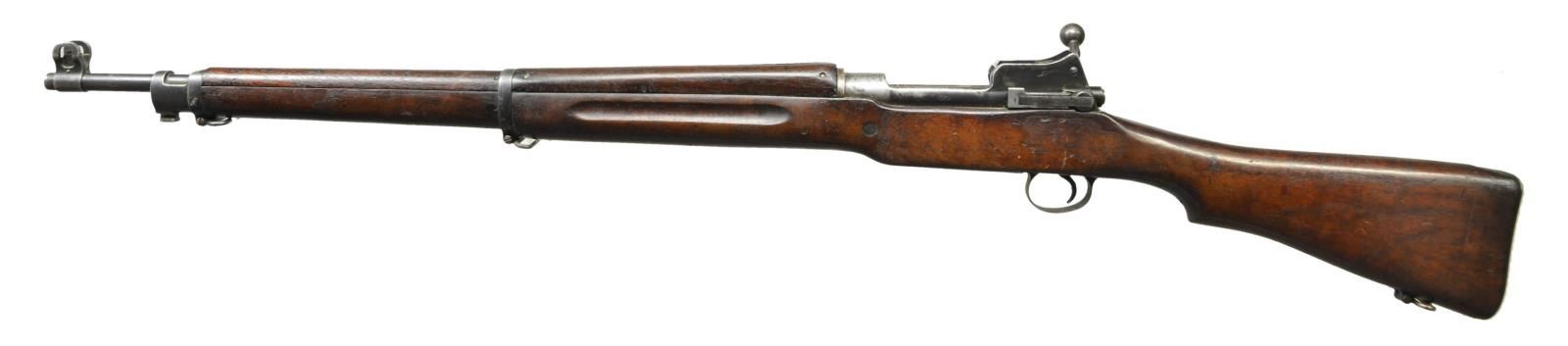 Cal. 30-06. S#725205. Bbl. 26" w/ 6-18 date, Eddystone & flaming bomb markings. Most of the parts are marked w/ "E" denoting correct Eddystone mfg. Floorplate & rear sling swivel marks are indiscernible. Aperture rear sight graduated to 1600yds. Blade front sight w/ protective ears. Walnut stock set w/ bottom mounted sling swivels. CONDITION: stock set has military oil finish w/ scattered dings & handling marks. Metal retains 40% original blue w/ scattered oxidation, fading to gray & silvering on the exposed edges. Good bore w/ scattered light pitting. PROVENANCE: Estate collection of Thomas F. Wolfinger. (22-6124/MJC). CURIO. $600-800.