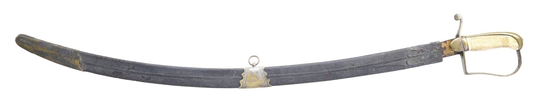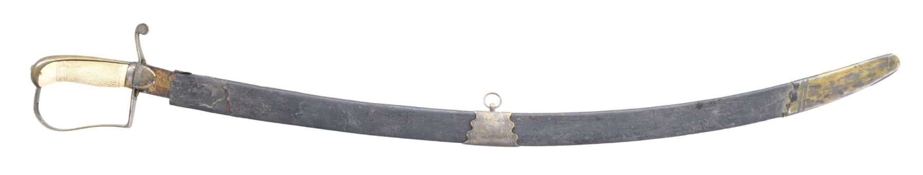A fine example of a mounted infantry officer's sword of the first quarter of the 19th century. The sword's overall length is 36" and the blade length is 31 1/4". The blade has a single large fuller and is blued over the first 15 1/2". There is gold highlighted etching that includes a spray of arms, Liberty Caps, and foliate motifs. Silvered brass reverse P hilt with a bird's head pommel. Carved bone grip with crosshatching and a decorative band. Silvered brass mounted leather scabbard. CONDITION: blade is somewhat dark, but blue and gold decorations are crisp. Hilt is a bit bent but retains a portion of its original silver plated finish. Grip has a few tiny flakes and stress lines. Scabbard is dry and flaky but solid with the throat missing. (02-24522/BF). $400-700.