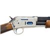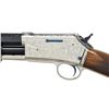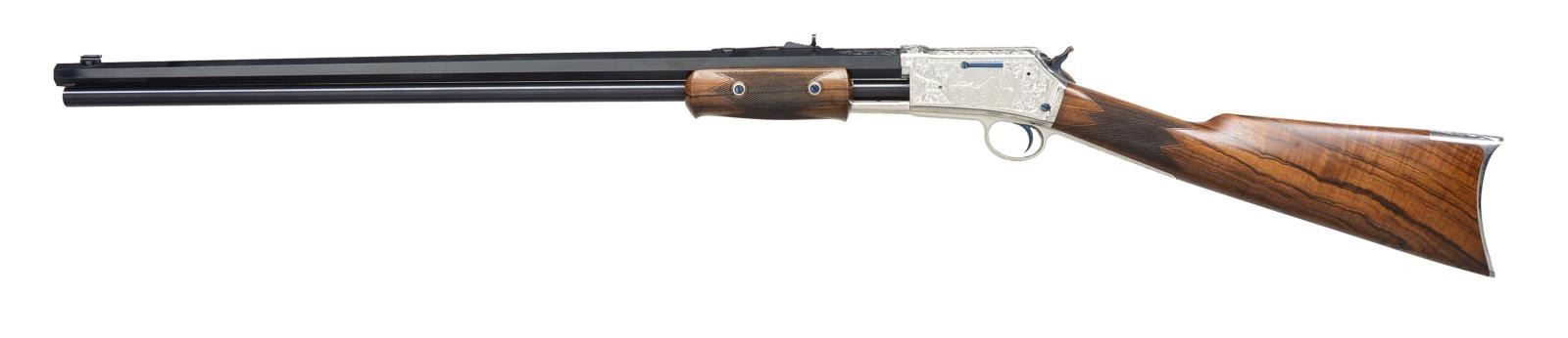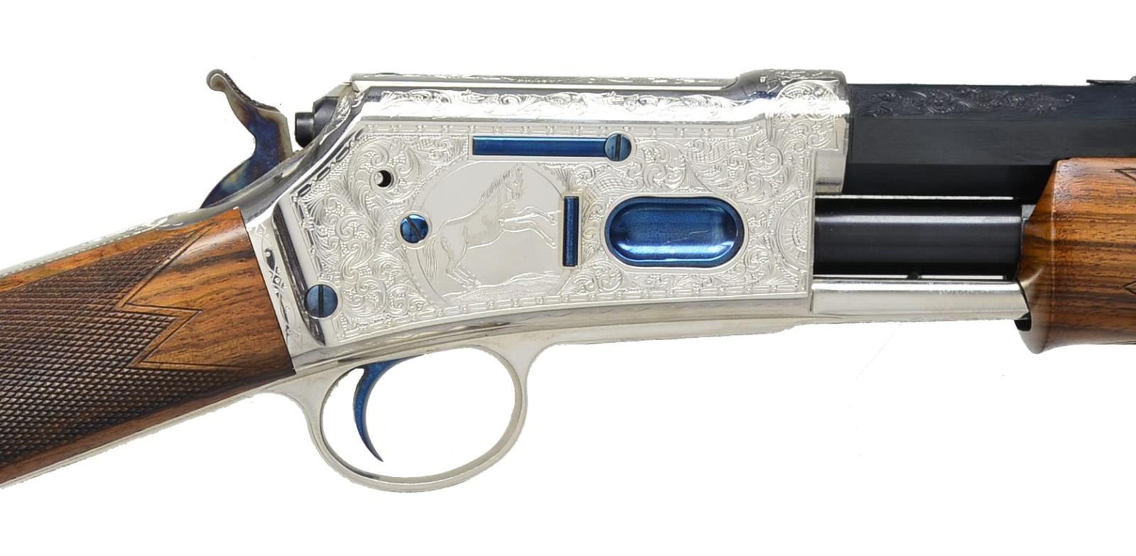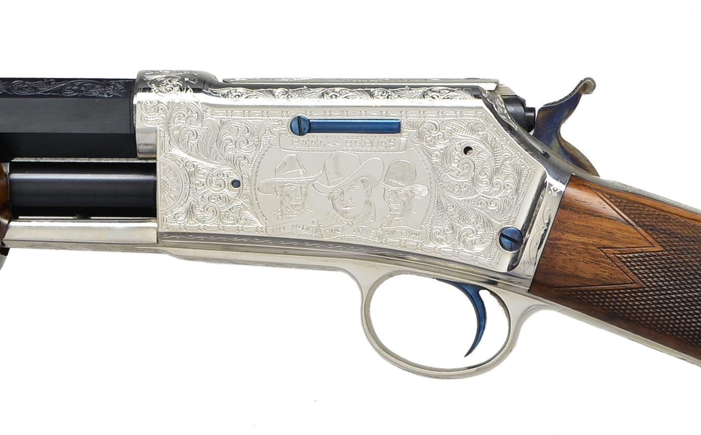 SLIDE ACTION RIFLE. Cal. 44-40. S# RH0001. Bbl. 26" oct. w/ bead front sight & elevator adj. rear sight. Full length mag. Nickel finished action having full coverage ornamentation featuring movie heroes Tim McCoy, Buck Jones & Hoot Gibson on left side w/ rampant Colt on right side. Fire blued loading gate, trigger & action screws w/ case colored hammer. Checkered 2 piece forearm & straight grip stock of fancy walnut w/ fiddle figure & striking dark streaks. Nickel finished engraved crescent buttplate w/ fire blue screws. CONDITION: near new retaining 99% finish. Near excellent bore. (20-3967/DS). MODERN. $1,350-1,900.
